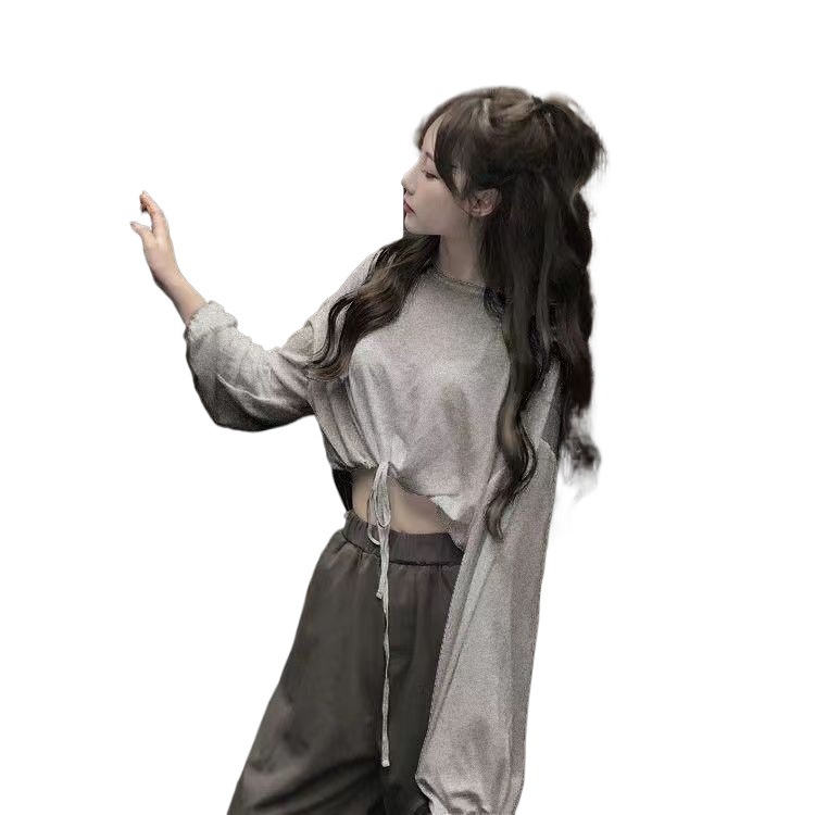 Европейская и американская горячая девушка ветер джазовый танец в футболке с длинными рукавами jazz свободная шнурка и пупок короткий танцевальный топ женский осень