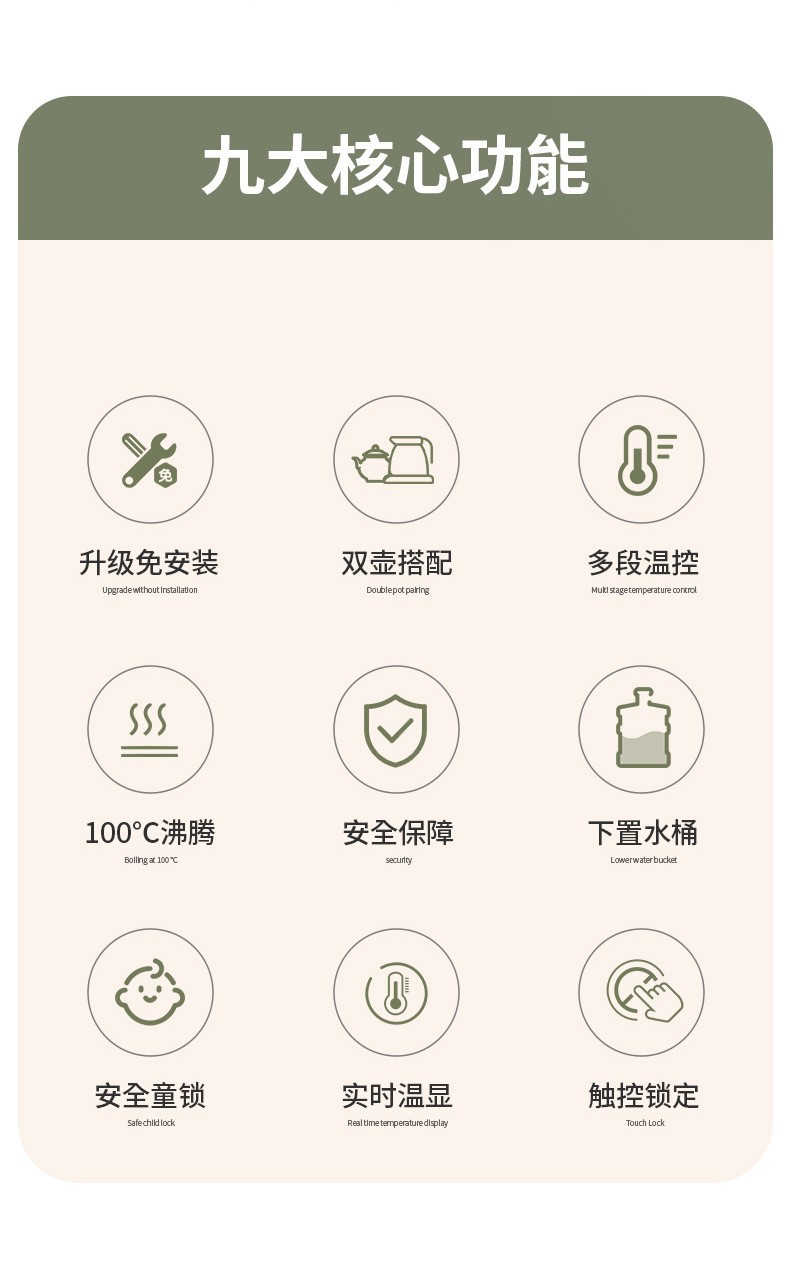 Автоматическое отключение, интеллектуальная регулировка температуры, блокировка от детей, двойные водяные выходы, голосовое управление, отображение температуры, поддержание тепла