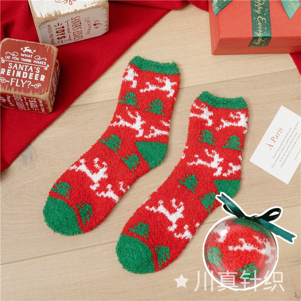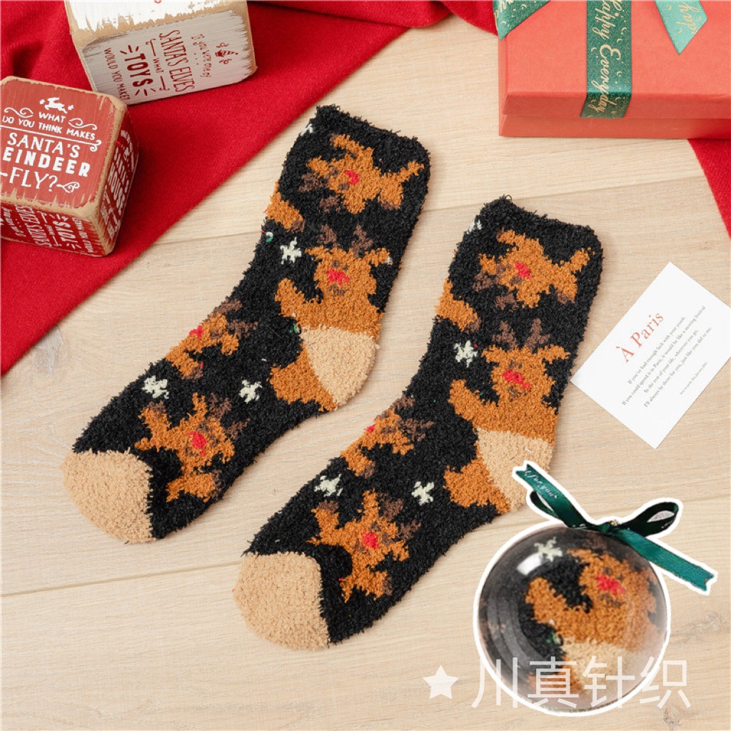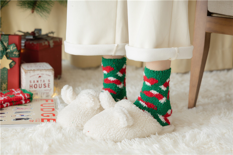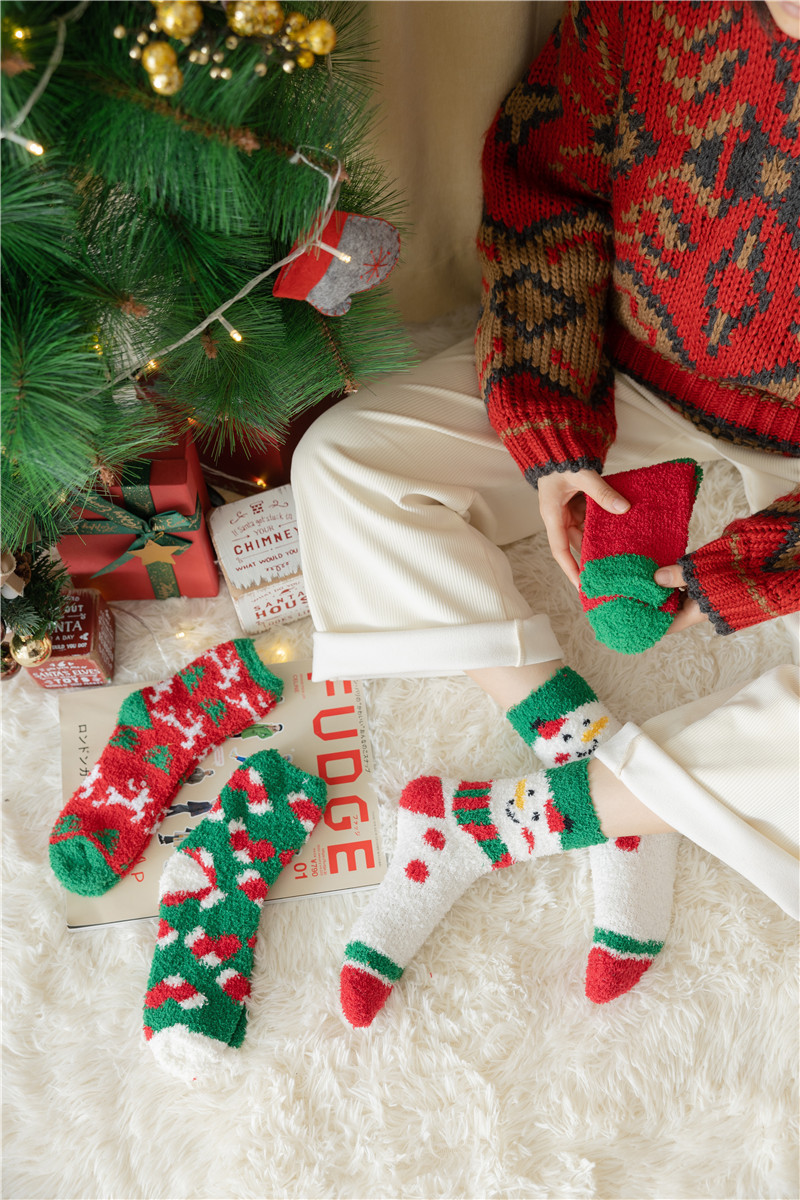 Новогодние носки из красного кораллового флиса с оленями и снеговиками, плюшевые, утолщенные, теплые, с мультяшным дизайном, подарок на Новый год