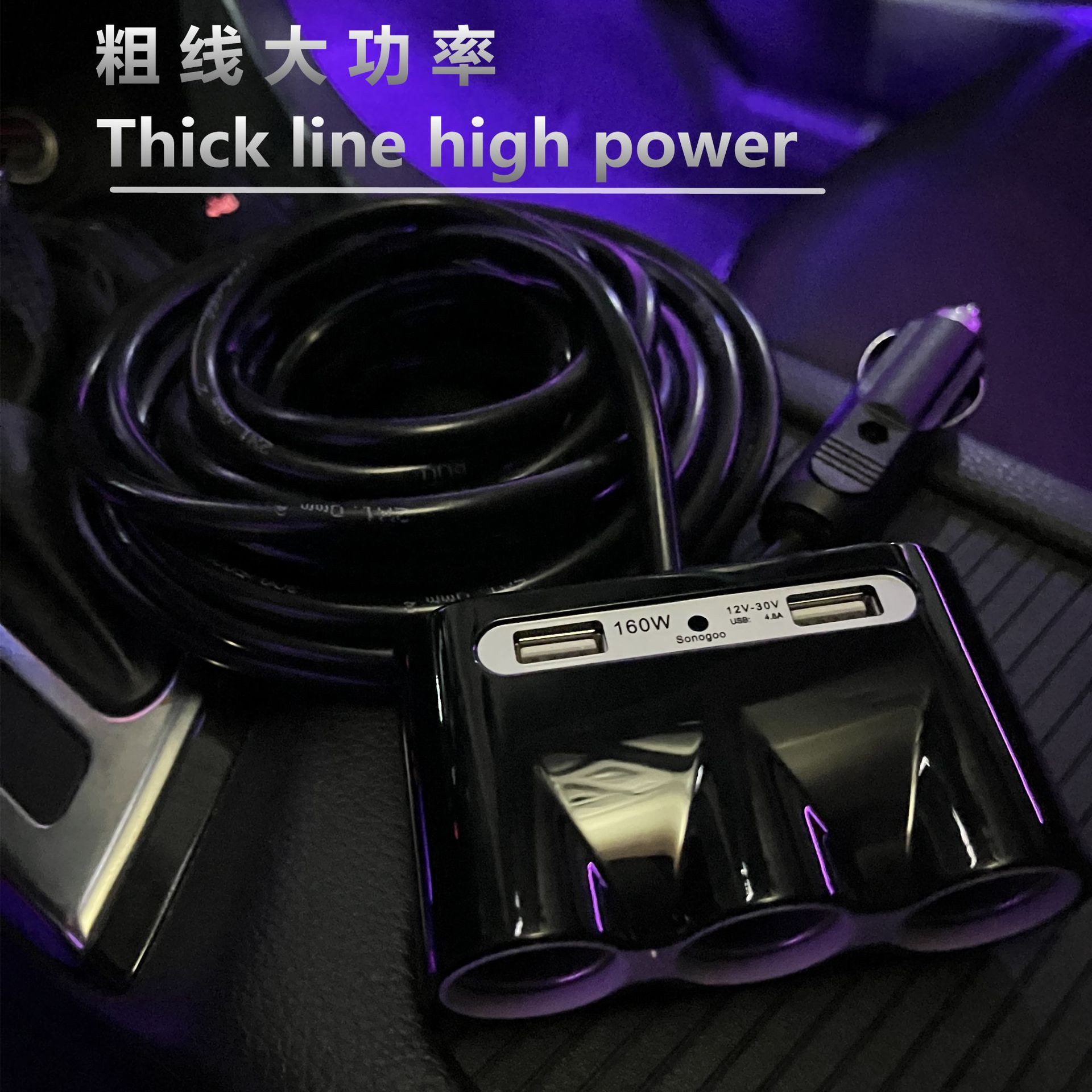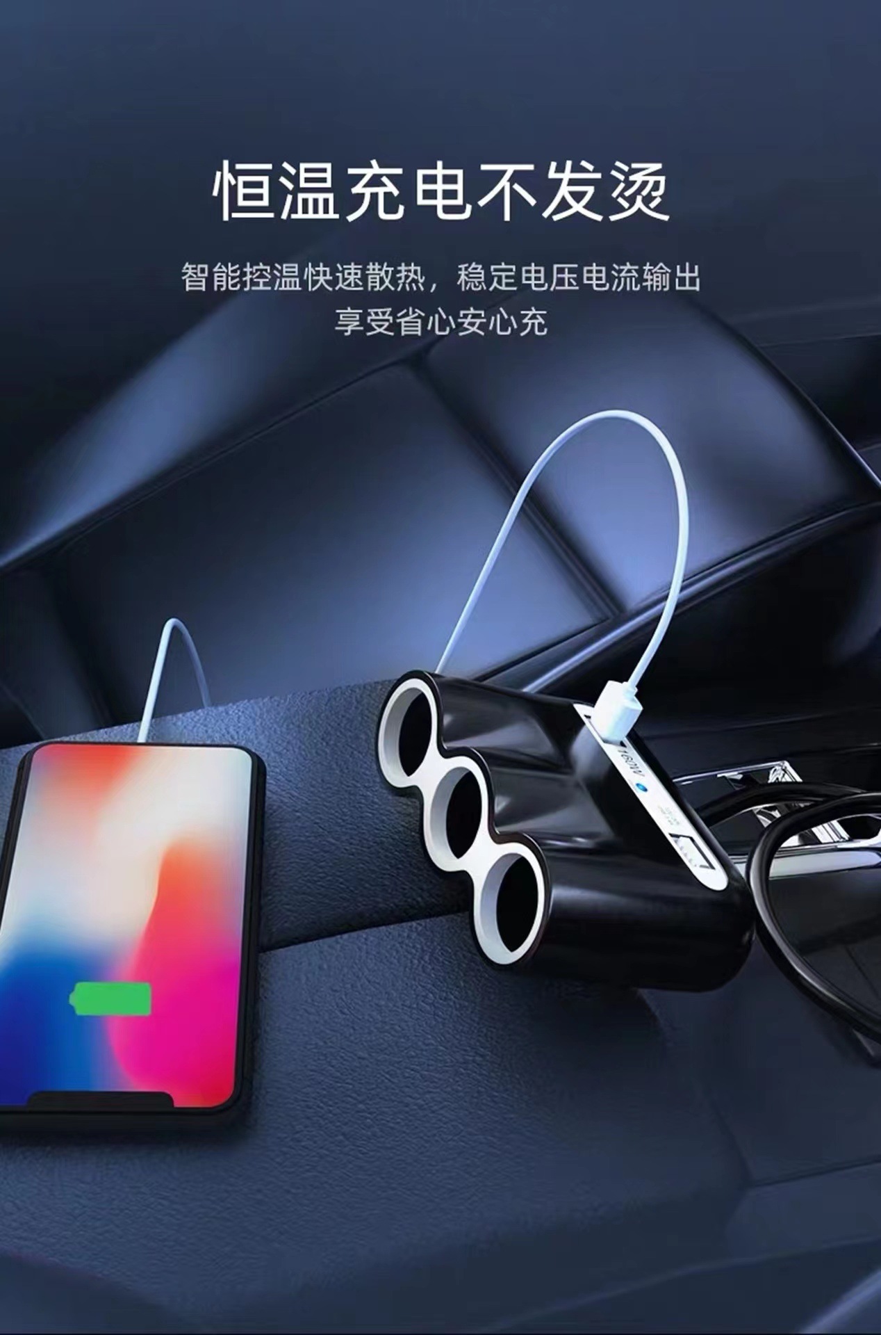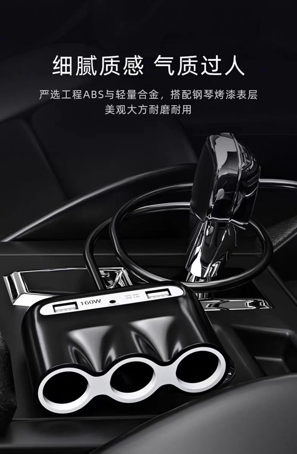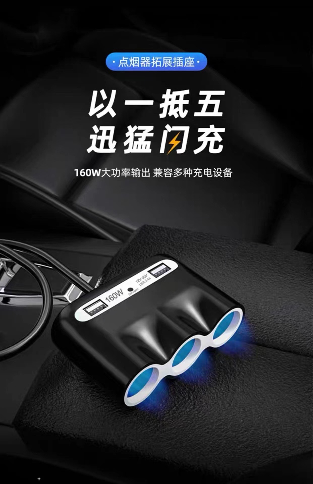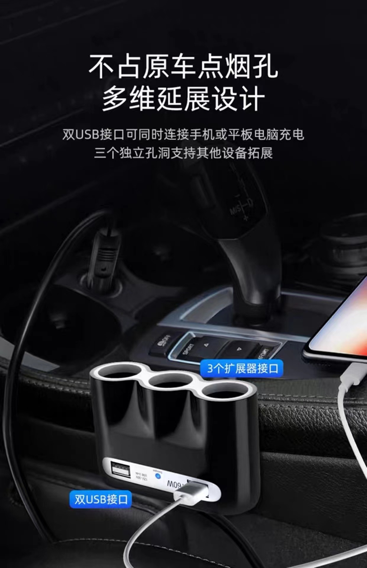 大功率车载点烟器插座,一变三排插,满足更多的车载电器同时使用