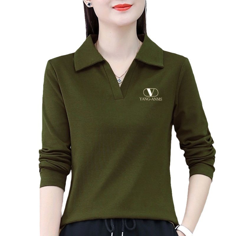 Футболка с отворотом сплошного цвета женская весна и осень женская новая поло-воротник мама с длинными рукавами
