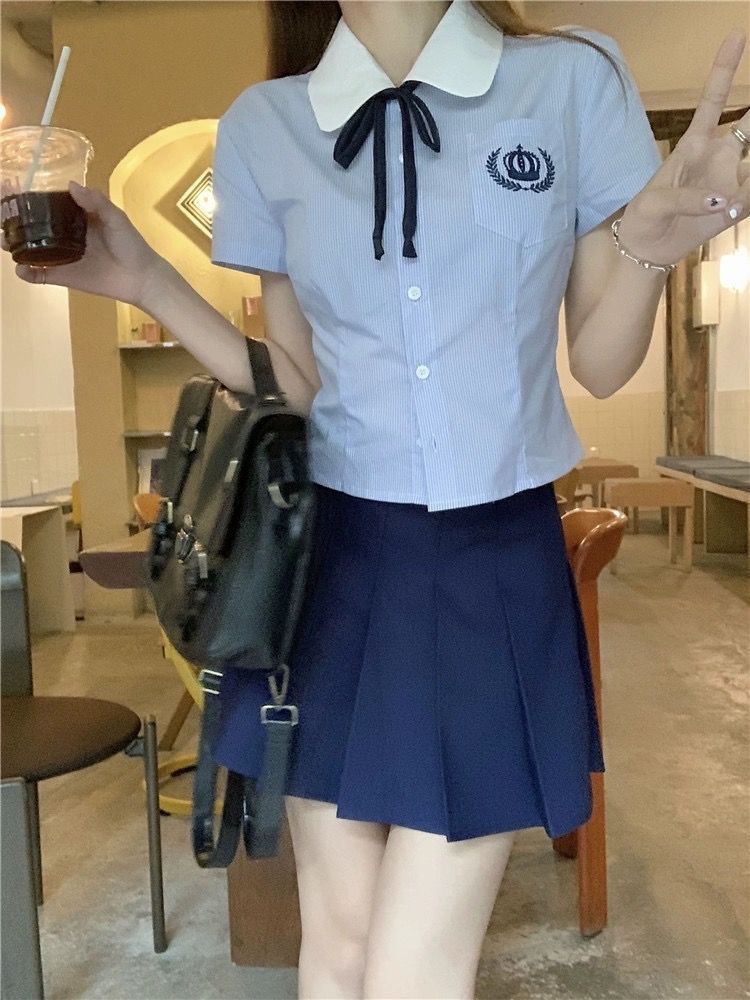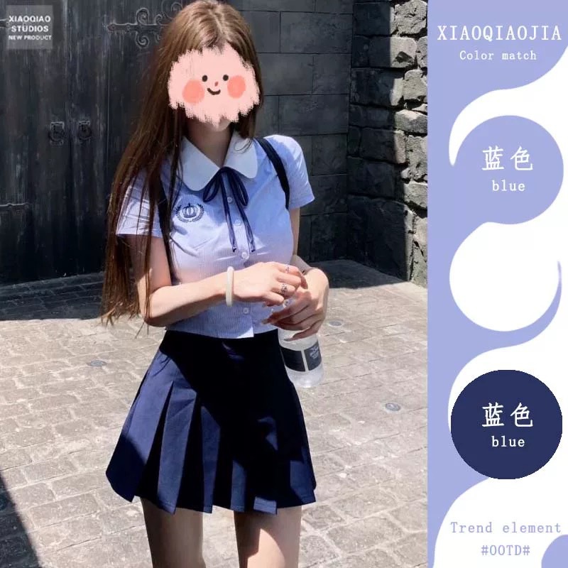 Сакурадзима Сюэцзе полосатая рубашка с талией Короткая синяя школьный стиль плиссированная юбка jk набор из трех частей
