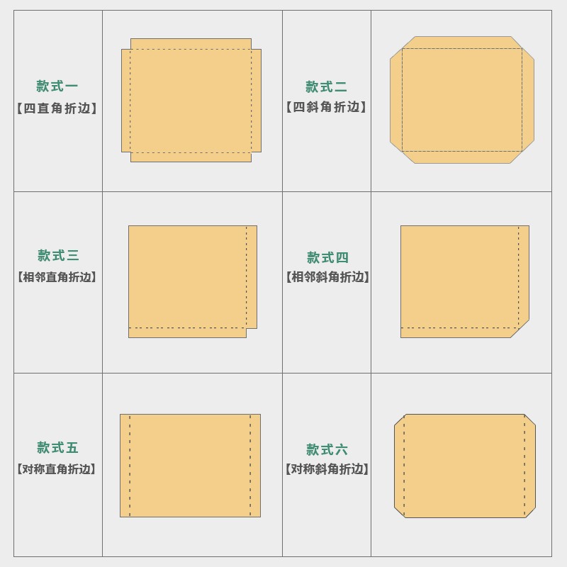 Толщина 0,6 мм, тип А: четырехсторонние прямоугольные края.; Толщина 0,6 мм, тип B: скошенные края со всех сторон.; Толщина 0,6 мм. Стиль C: соседняя подшивка под прямым углом.; Тип D толщиной 0,6 мм: соседний скошенный край; Толщина 0,6 мм. Стиль E: подшивка под прямым углом на противоположной стороне.; Толщина 0,6 мм. Стиль F: складной диагональный край.; Толщина 0,9 мм, тип А: четырехсторонние прямоугольные края.; Толщина 0,9 мм, тип B: угловые края со всех сторон.; Толщина 0,9 мм. Стиль C: соседняя подшивка под прямым углом.; Тип D толщиной 0,9 мм: соседний скошенный край; Толщина 0,9 мм. Стиль E: подшивка под прямым углом на противоположной стороне.; Толщина 0,9 мм. Стиль F: складной диагональный край.; Толщина 1,2 мм, тип А: четырехсторонние прямоугольные края.; Толщина 1,2 мм, тип B: угловые края со всех сторон.; Тип C толщиной 1,2 мм: соседняя подшивка под прямым углом.; Тип D толщиной 1,2 мм: соседний скошенный край; Тип E толщиной 1,2 мм: противоположная сторона, прямоугольный, сложенный край; Стиль F толщиной 1,2 мм: подшивка по диагонали.; Толщина 1,5 мм, тип А: четырехсторонние прямоугольные края.; Толщина 1,5 мм, тип B: скошенные края со всех сторон.; Стиль C толщиной 1,5 мм: соседняя подшивка под прямым углом.; Тип D толщиной 1,5 мм: соседний скошенный край; Стиль E толщиной 1,5 мм: сложенные края противоположной стороны под прямым углом; Стиль F толщиной 1,5 мм: подшивка по диагонали.