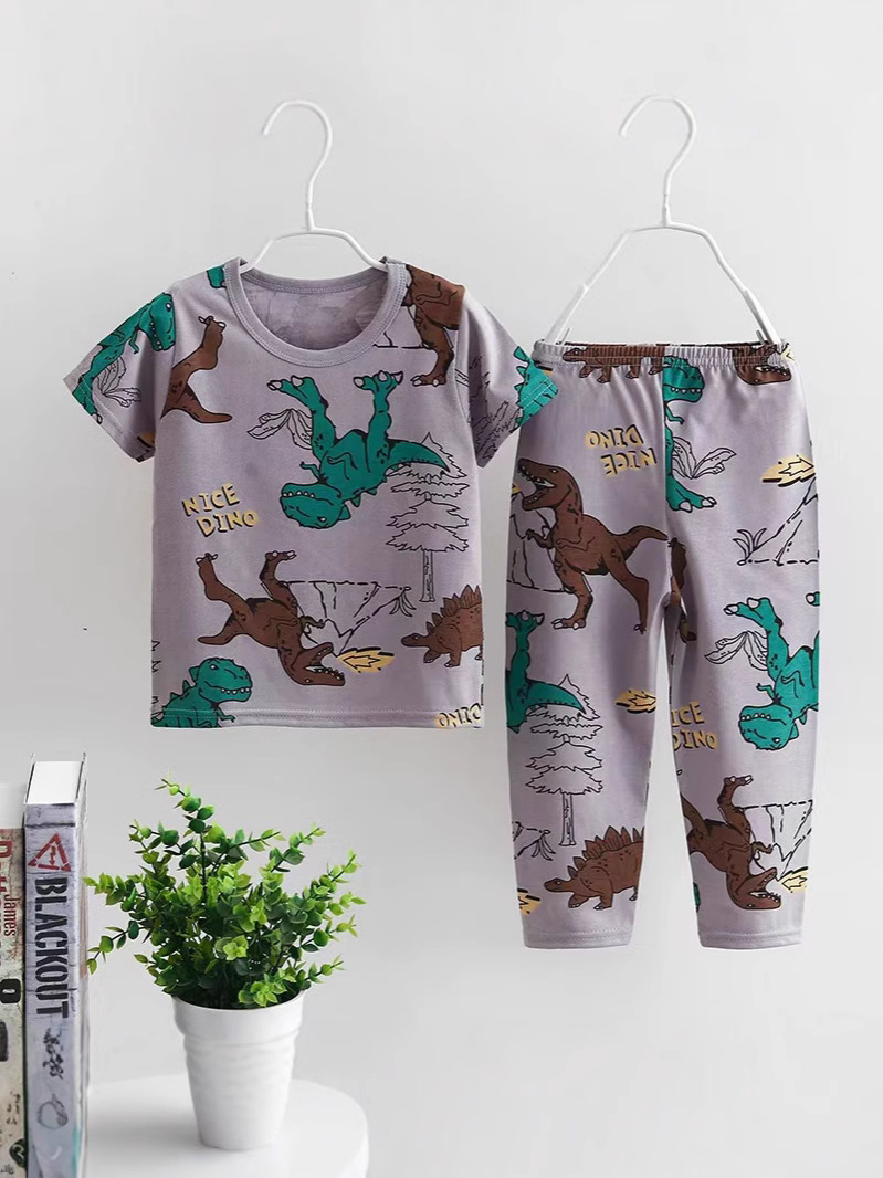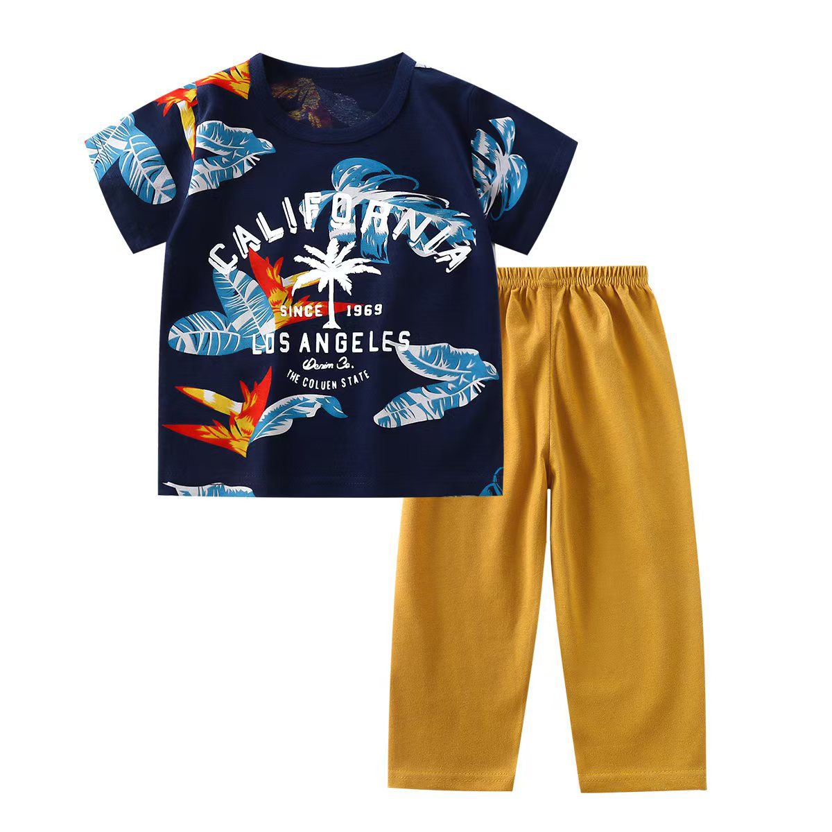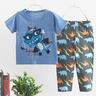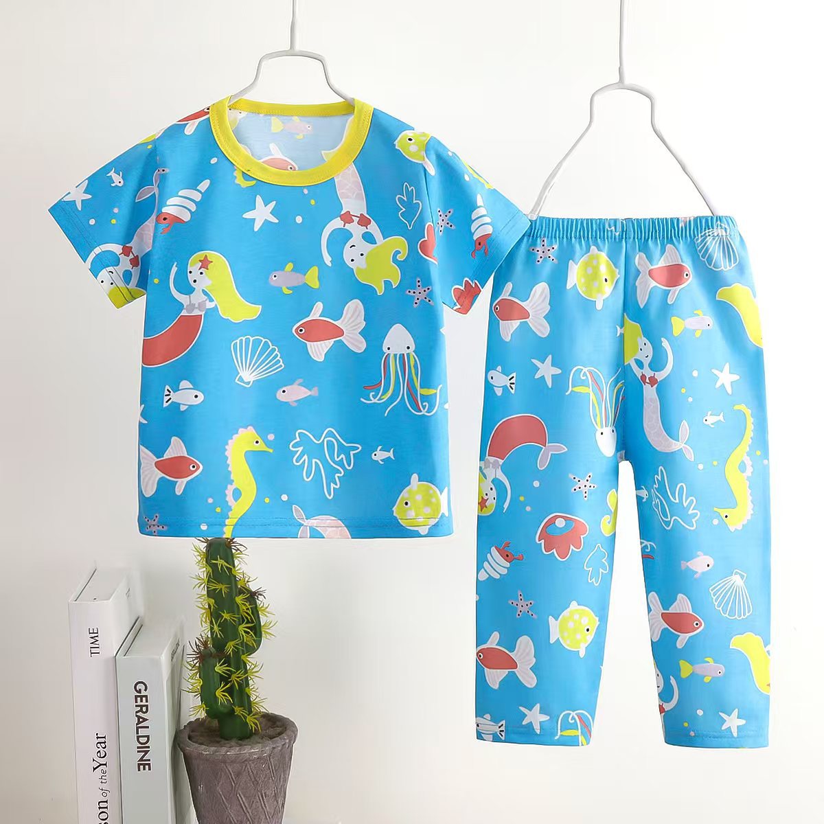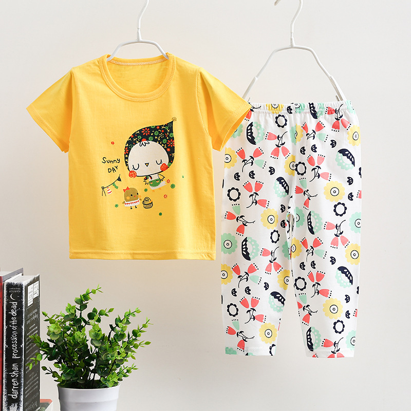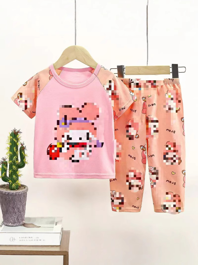 Детский домашний комплект 2025 года, летний, в корейском стиле, с мультяшным принтом, для мальчиков и девочек, с коротким рукавом и длинными брюками, оптом, милый стиль