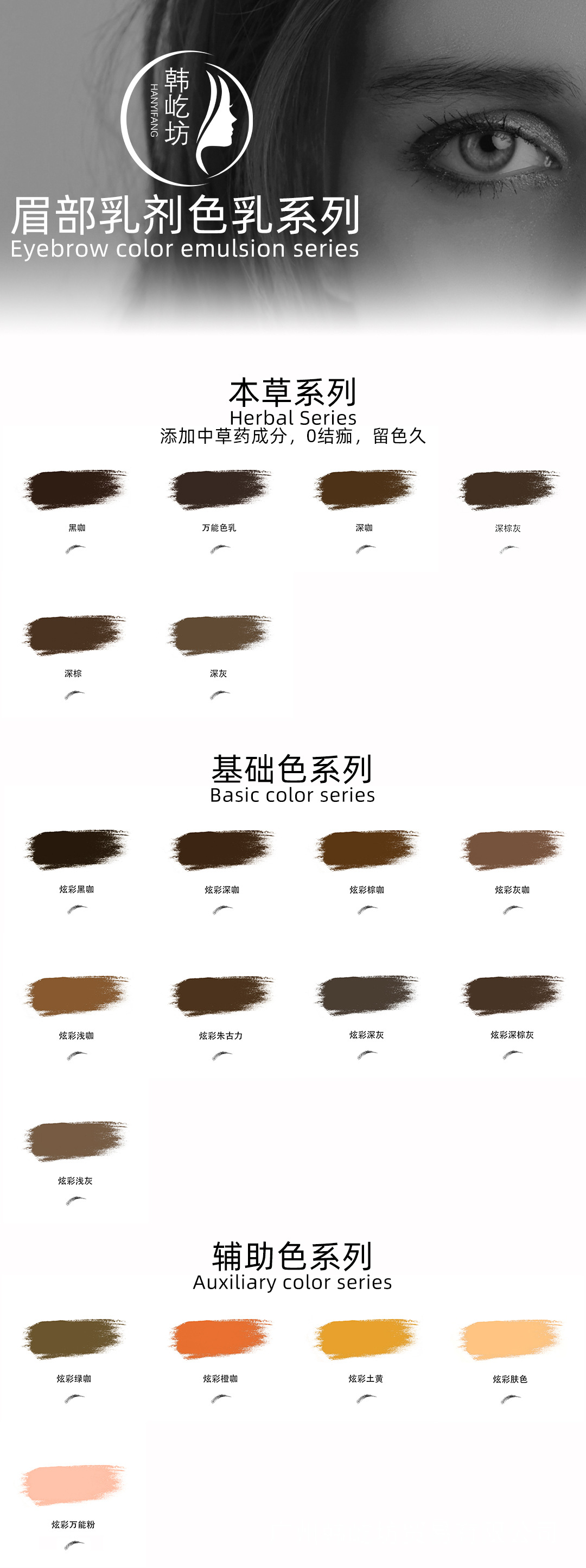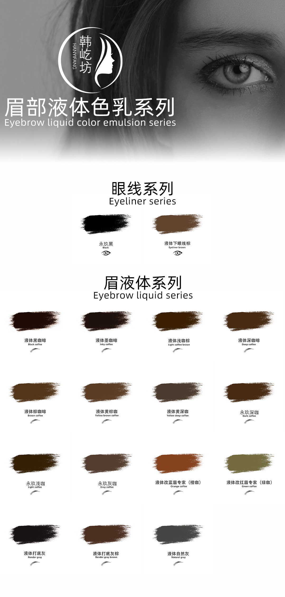 Навсегда черный; жидкая нижняя подводка для глаз коричневая; Травяной черный кофе; Травяной глубокий кофе; Травянистый темно-коричневый; Травянистый темно-коричнево-серый; Материя Медика темно-серый; Травяная универсальная цветная эмульсия; Красочный черный кофе; Красочный темный кофе; Красочный коричневый кофе; Красочный серый кофе; Красочный легкий кофе; Красочный темно-серый; Красочный светло-серый; Красочный темно-коричневый серый; Красочный шоколад; Зеленый кофе (эксперт по бровям); Orange Coffee (эксперт по коррекции бровей); Ярко-земляной желтый (вспомогательный); Красочный цвет кожи (вспомогательный); Концентрированный классический апельсин; Концентрированный классический апельсин; Концентрированный классический грейпфрут красный; Концентрированный классический ярко-красный цвет.; Конденсированный классический красный; Концентрированный Classic Extra Red; Концентрированный классический нежный порошок; Водная эмульсионная краска для внутренней губы; Порошок для губ на водной эмульсии; Водянистый телесный цвет; Жидкое смешанное желтое (вспомогательное); Водная эмульсия универсальная желтая (вспомогательная); Водная эмульсия глянцево-белого цвета (вспомогательная); Красочная универсальная пудра (вспомогательная); Красочная чернильная кофейня; Красочный желто-коричневый кофе; Красочный желтый темный кофе; Yongjiu темный кофе; Юнджиу Цянька; Серый кофе Юнджиу; жидкая основа серая; Жидкие клецки из серого риса; жидкий натуральный серый; (Жидкий) черный кофе; Жидкий желтый темный кофе; (Жидкий) желто-коричневый кофе; (Жидкий) серый кофе; (Жидкость) Мока; (Жидкий) легкий кофе; (Жидкость) светло-коричневый; (Жидкий) темный кофе; (Жидкость) Юнджиу Грей; (Жидкий) Кофе Юнджиу; (Жидкий) коричневый кофе