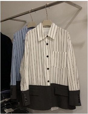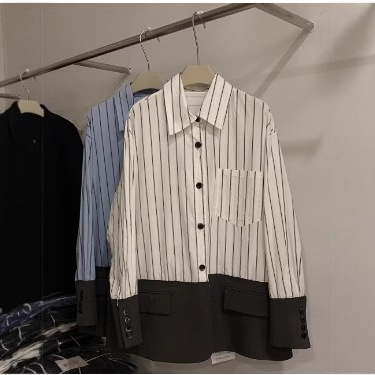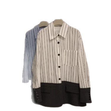 Летняя новинка 2025: рубашка свободного кроя в стиле лейзи-шик, европейский дизайн, полосатая, с цветовыми блоками, с множеством карманов, с длинным рукавом
