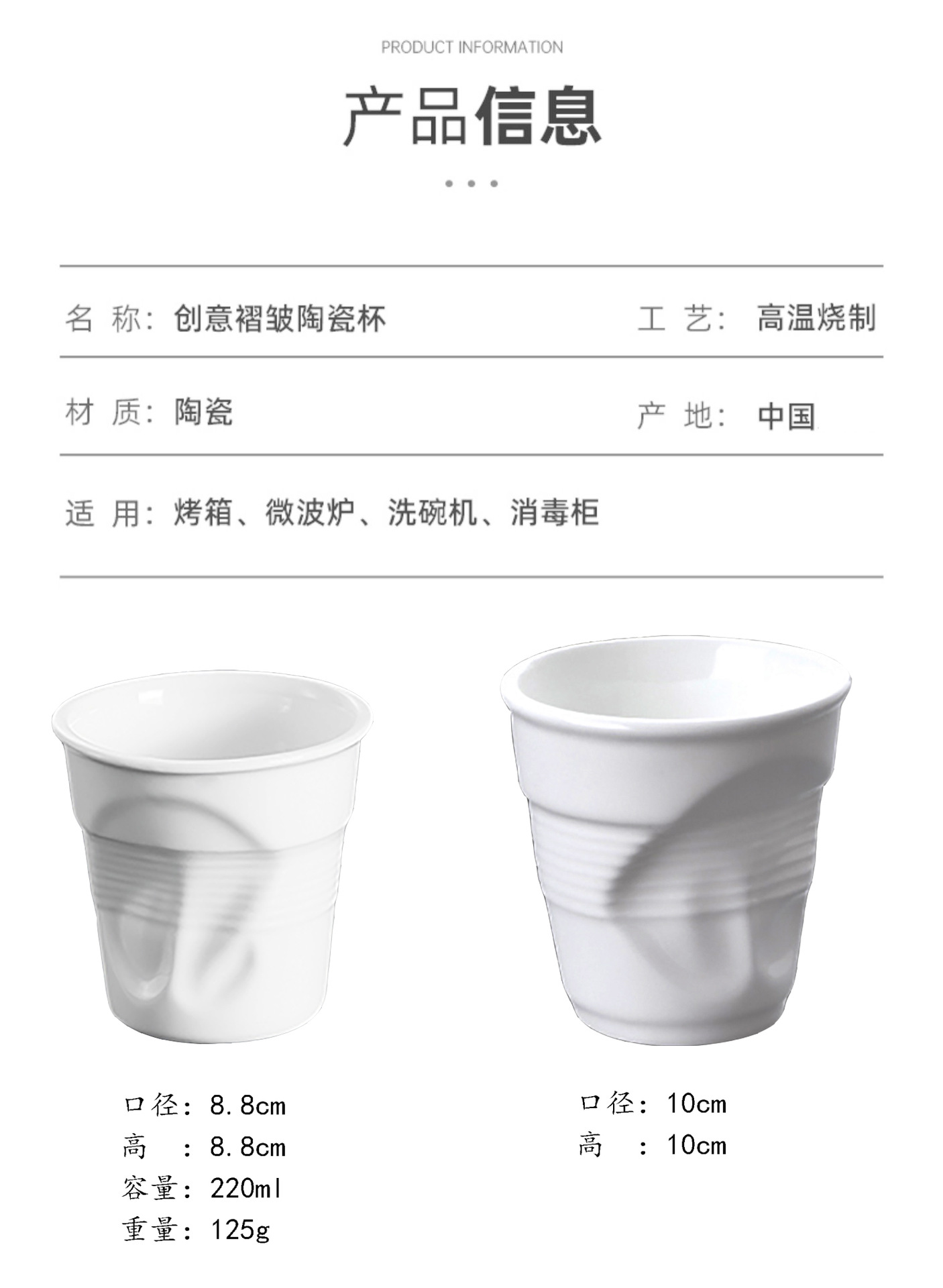 Плиссированная чашка высотой 8,8 см, 220 мл.; Плиссированная чашка высотой 10 см.