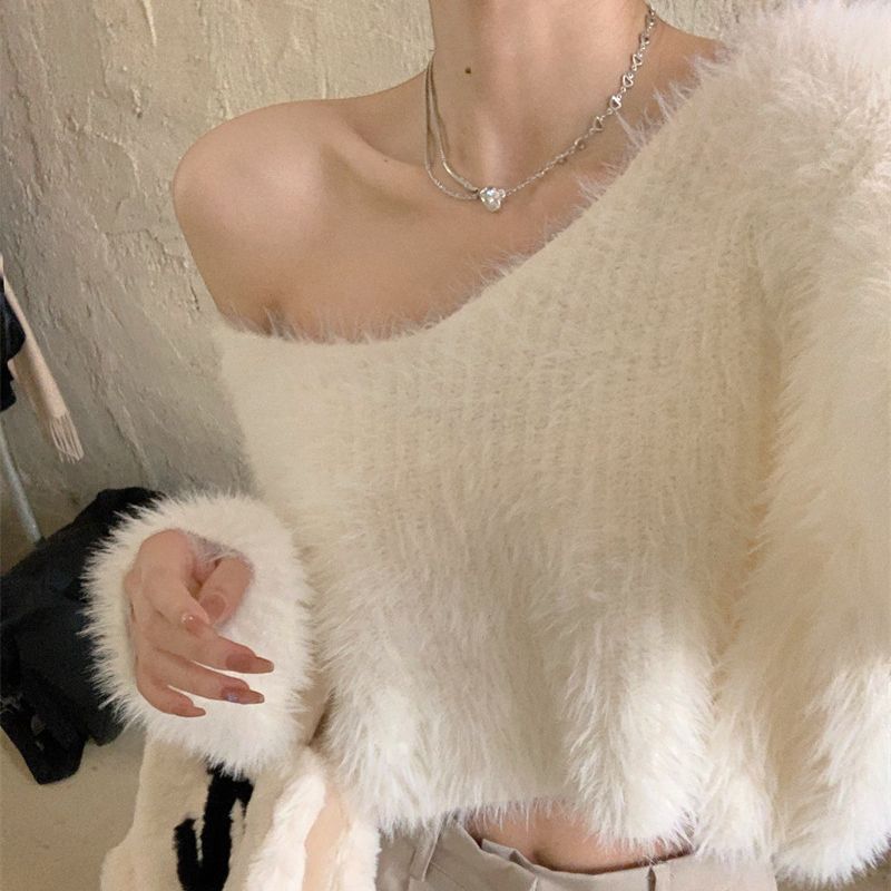 Ленивый свитер с V-образным вырезом из шерсти норки женский осень-зима 2024 новый свободный тонкий продвинутый плюшевый трикотажный топ