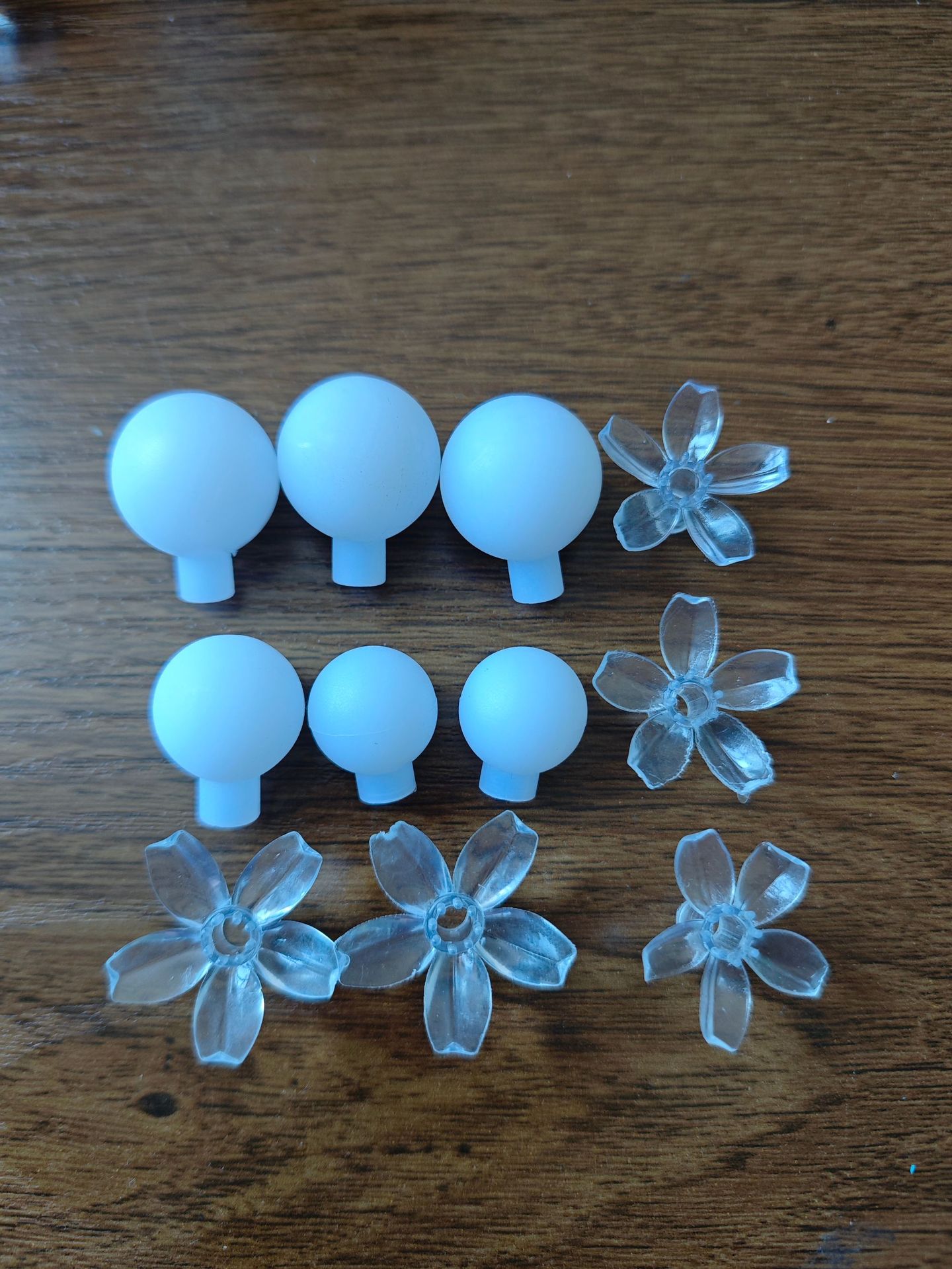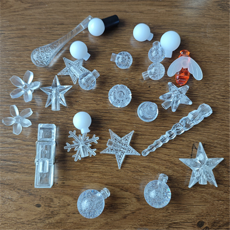 3.3cm Глянцевые пять звезд (на оптическом волокне); Перламутровые маленькие звезды; 1,7 белый шар; 1,7 пузырьков; 2.3 белый шар; 2.3 пузырьки; 6cm капли воды; 7.5cm капли воды; лунные обнимающие звезды; несколько звезд; пчела; клип; маленькие цветы вишни; большие цветы вишни