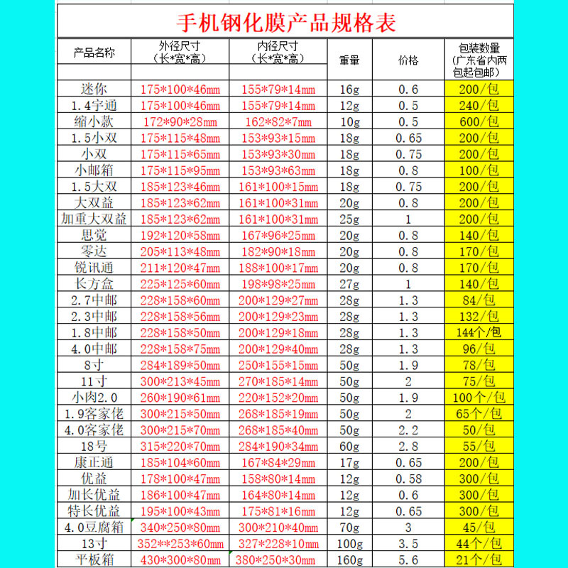 Мини (200 шт./упак.); 1.4 Юнг (240 шт./упак.); Редукционная версия (600 шт./упак.); Шэньчжэнь Щипцы (200 шт./упак.); Расширенный Youyi (300 шт./упак.); Youyi (300 шт./упак.); Очень длинный и превосходный (300 шт./упак.); 1,5 маленьких пары (200 шт./упак.); Маленький Шуани (200 шт/уп.); Небольшая коробка для электронной почты (100 шт./упак.); 1,5 больших пар (200 шт./упак.); Да Шуани (200 шт./упак.); Увеличьте серьезные сомнения (200 шт./упак.); Думаю (140 шт./упак.); Шида (170 шт./упак.); Рэйксун (170 шт./упак.); Прямоугольная коробка (140 шт./упак.); 2,7 средняя почта (84 шт./упак.); 2.3 Промежуточная почта (132 шт./упаковка); 1.8 средняя почта (144 шт./упак.); 4,0 средняя почта (96 шт./упак.); 8inch (78 шт./упак.); 11inch (75 шт./упак.); Маленькое мясо 2,0 (50 шт./упак.); 4.0 Guojia Lao (50 шт./упак.); No 18 (55 шт./упак.); Коробки для тофу 4..0 (45 шт./упак.); 13inch (44 шт./упак.); Плоская коробка (21 шт./упак.)