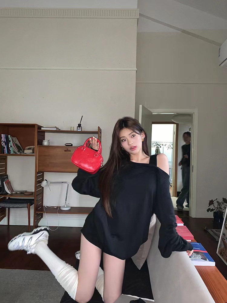 Распродажа: прямые поставки, женская толстовка в американском стиле с открытыми плечами, свободного кроя, с длинными рукавами, весенне-осенний дизайн, модный топ.