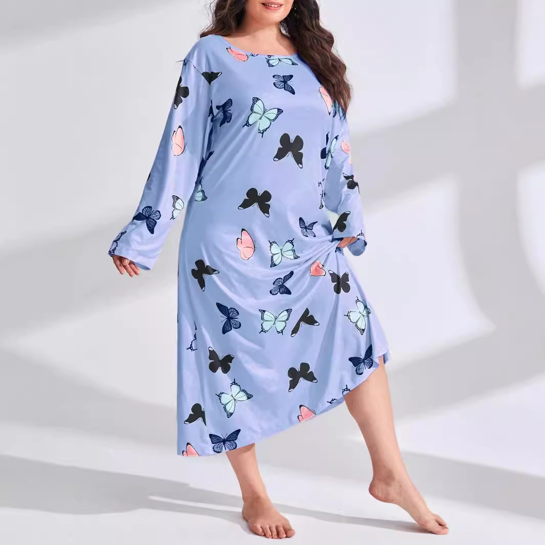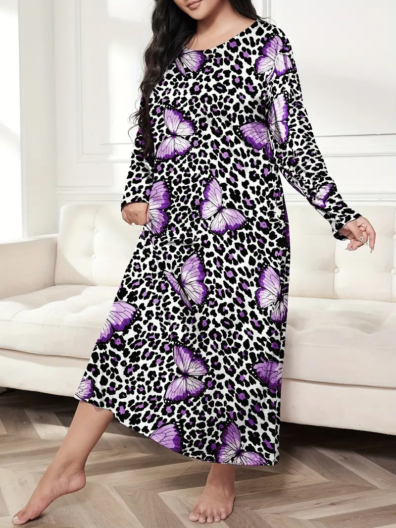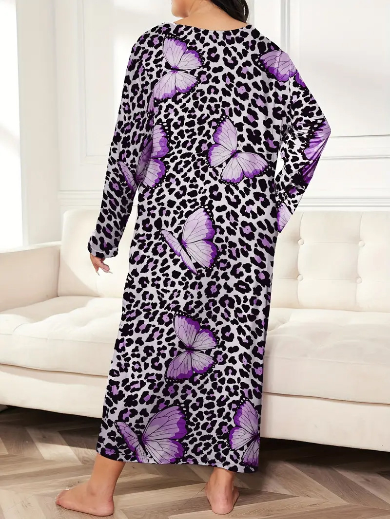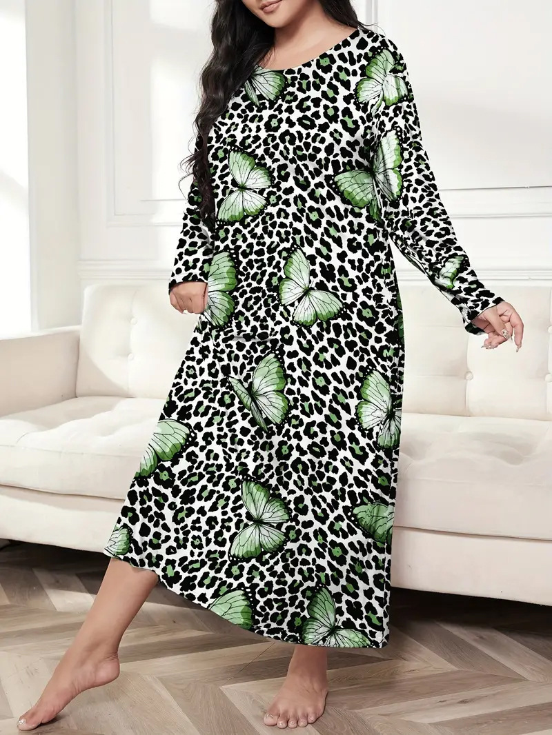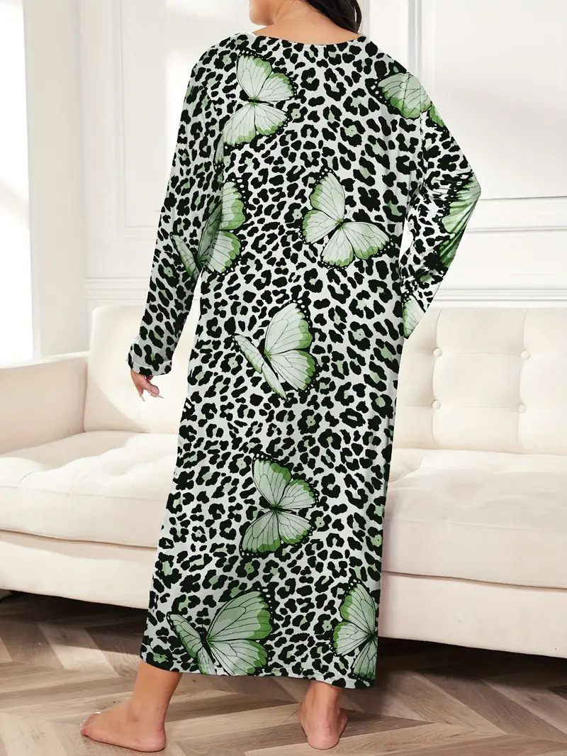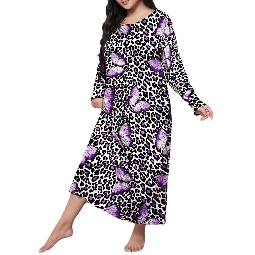 2025 Европейская и американская ночная сорочка с длинными рукавами, принтом бабочки, сердца и леопарда, с открытыми плечами, большого размера, для полных женщин