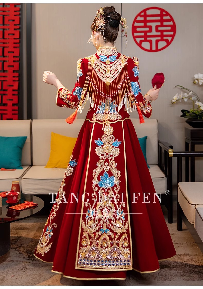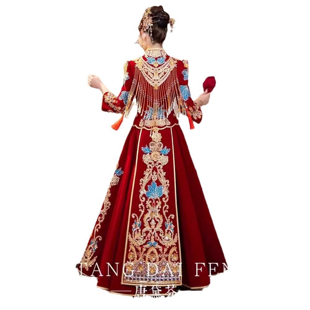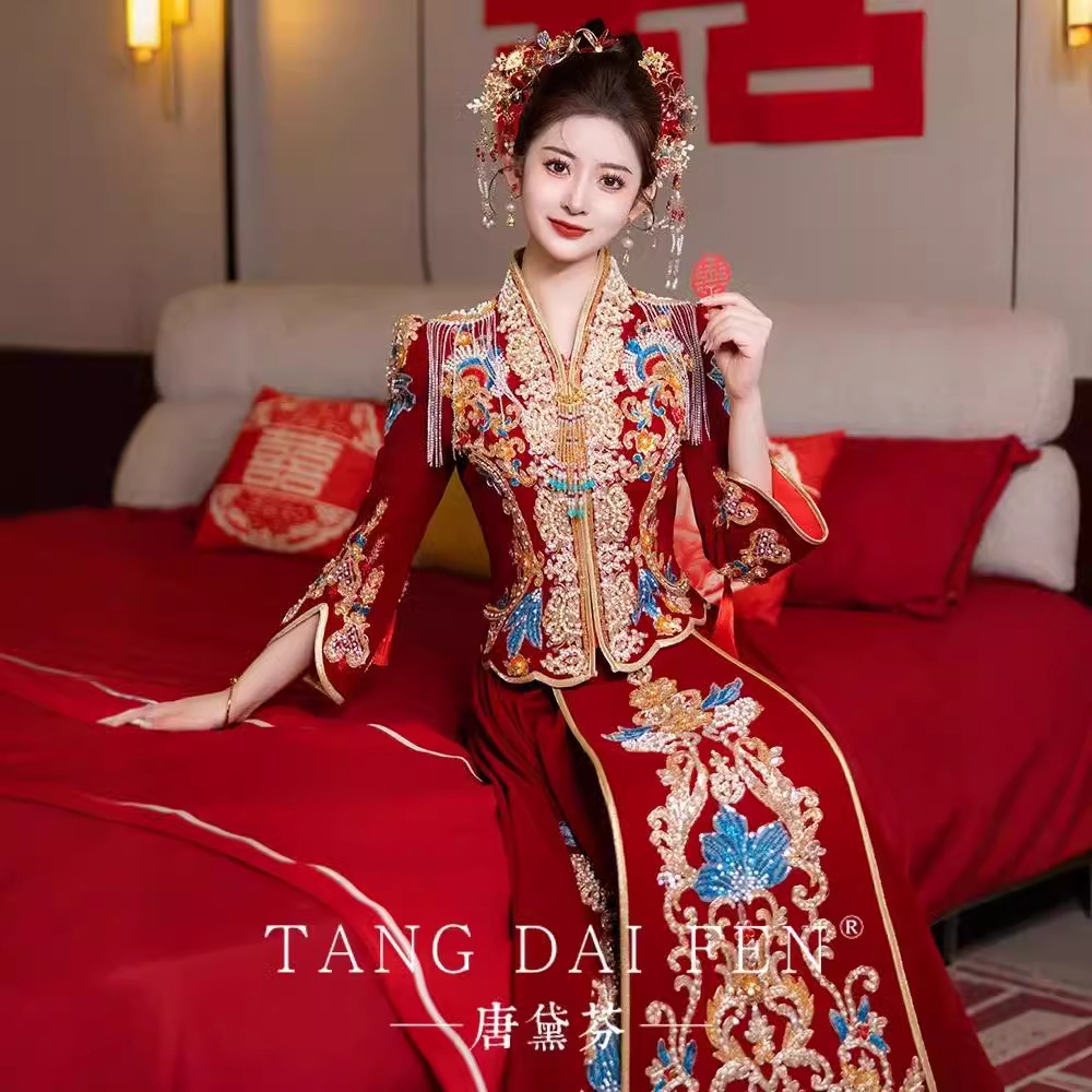 Свадебный костюм Xiuhe 2025 новый китайский v-образный вырез большого размера тонкий дракон бархатный феникс женский свадебный костюм