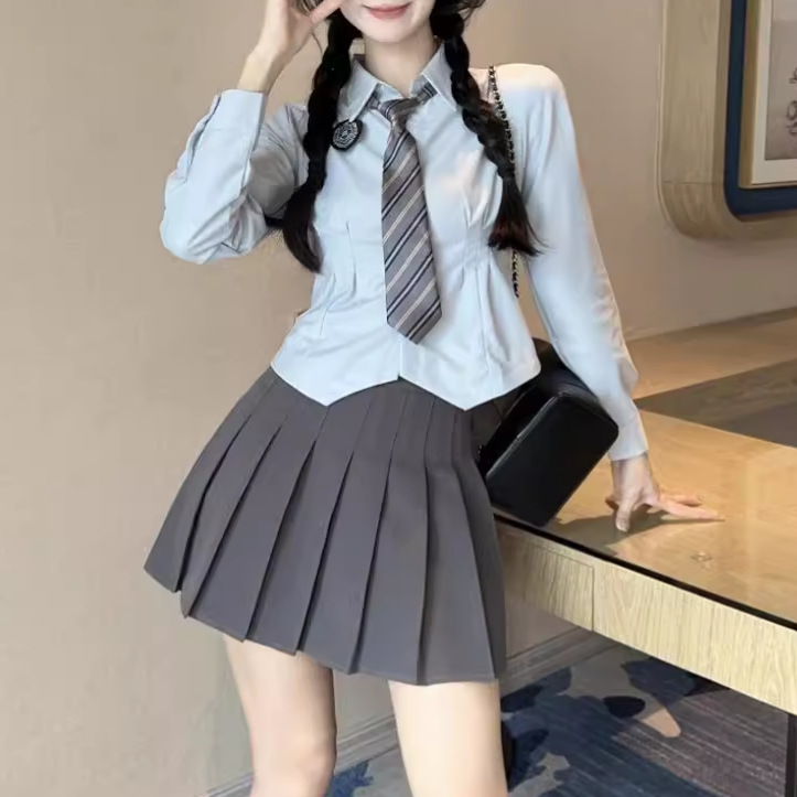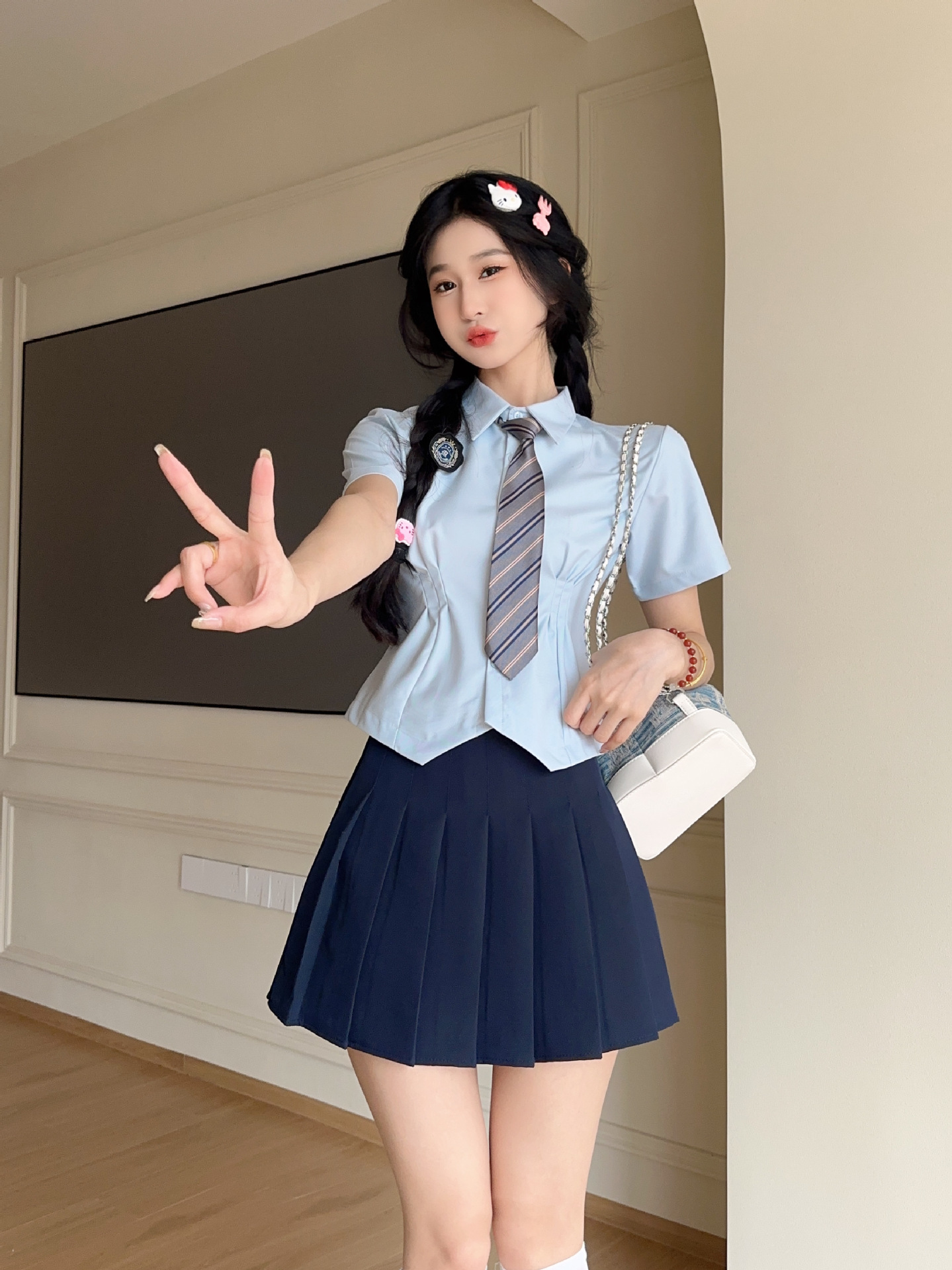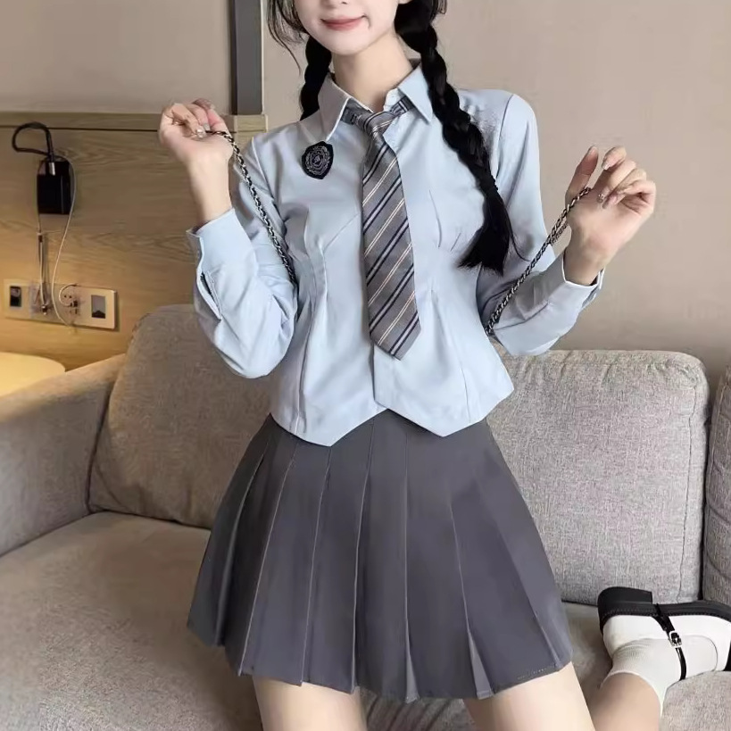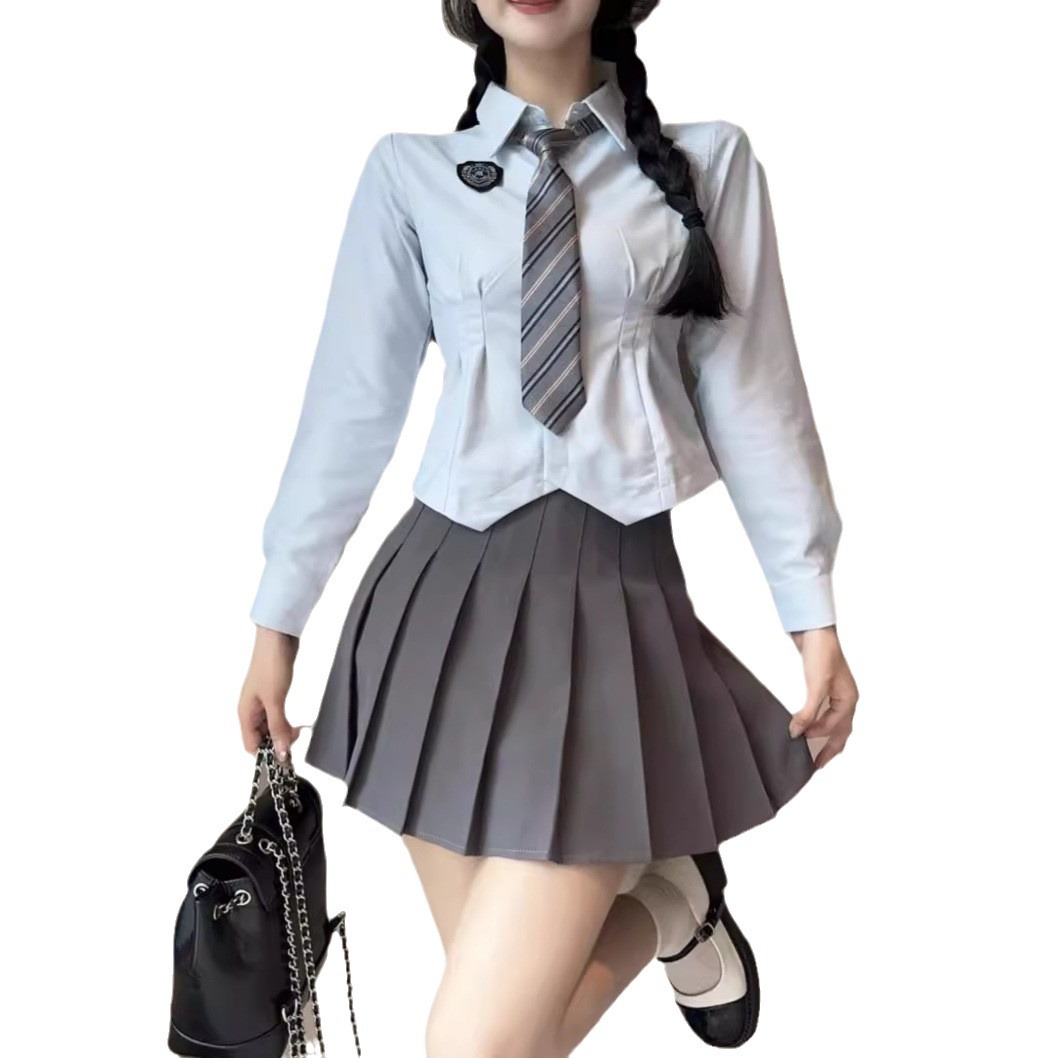 Белые короткие рукава; белые длинные рукава; Серые короткие рукава; Серые длинные рукава; Белые короткие рукава + галстук-бабочка + короткая юбка; Белые длинные рукава + галстук-бабочка + короткая юбка.; Серые короткие рукава + галстук + юбка; Серые длинные рукава + галстук + юбка; Голубые длинные рукава + галстук.; Голубые длинные рукава + галстук + юбка