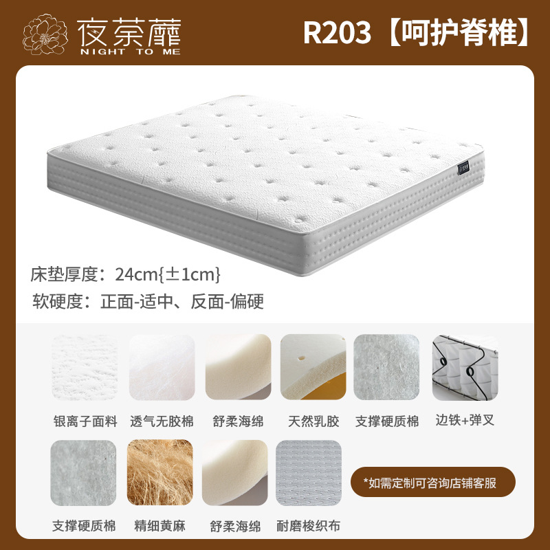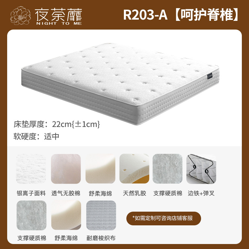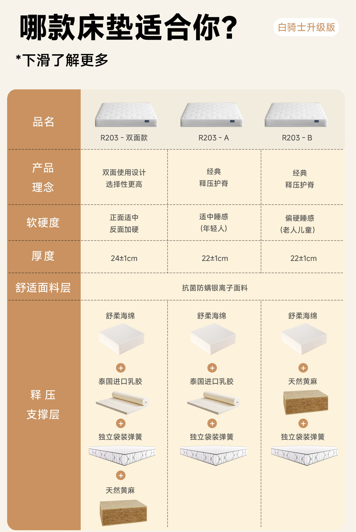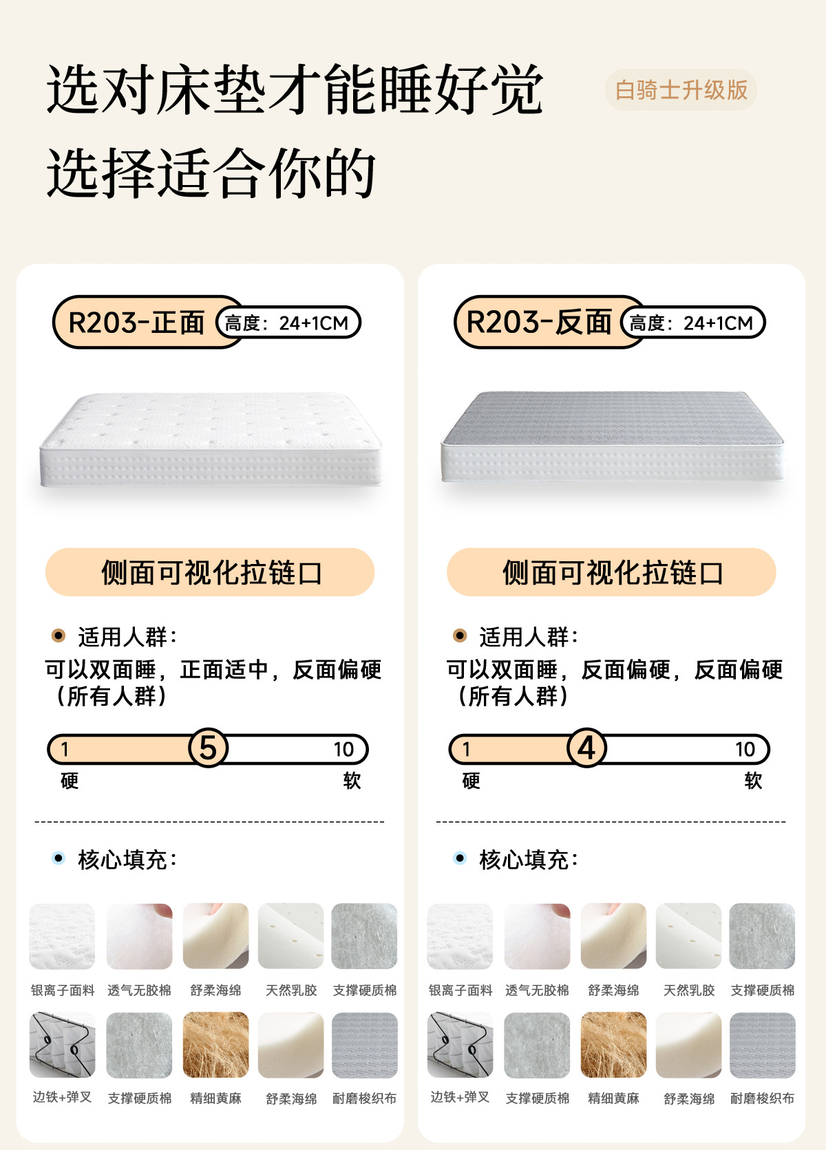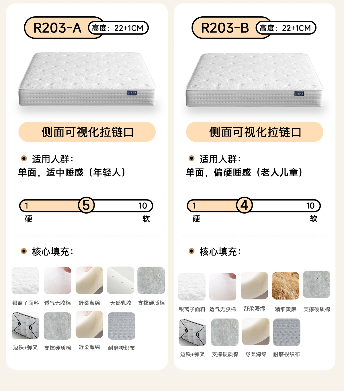 R203: [Мягкое и жесткое использование] Независимая карманная пружина + натуральный латекс + тонкий джут + дышащая губка + приятная для кожи ткань против клещей.; R203-B: [Односторонний, более жесткий] Независимая карманная пружина + тонкий джут + дышащая губка + приятная для кожи ткань против клещей.; R203-A: [Односторонний умеренный] Независимая карманная пружина + натуральный латекс + дышащая губка + приятная для кожи ткань против клещей