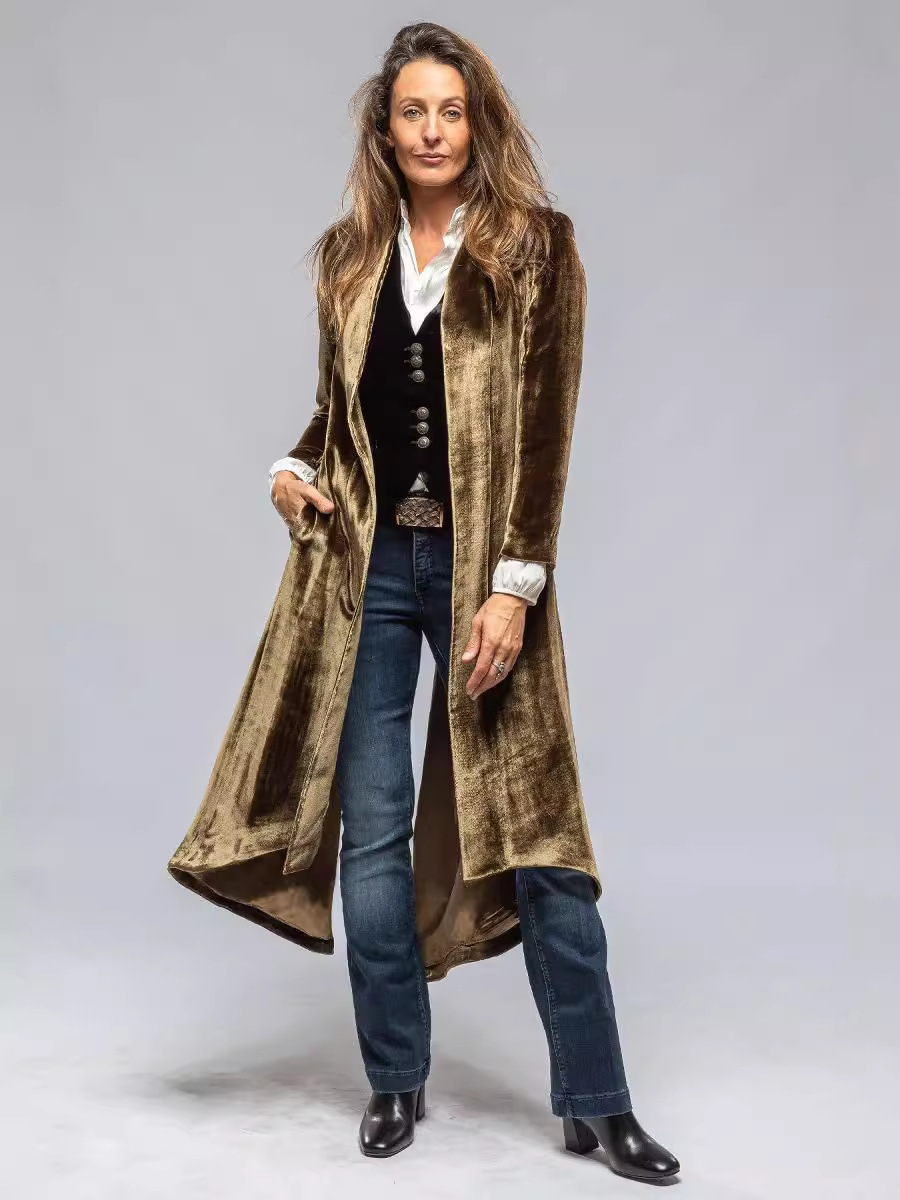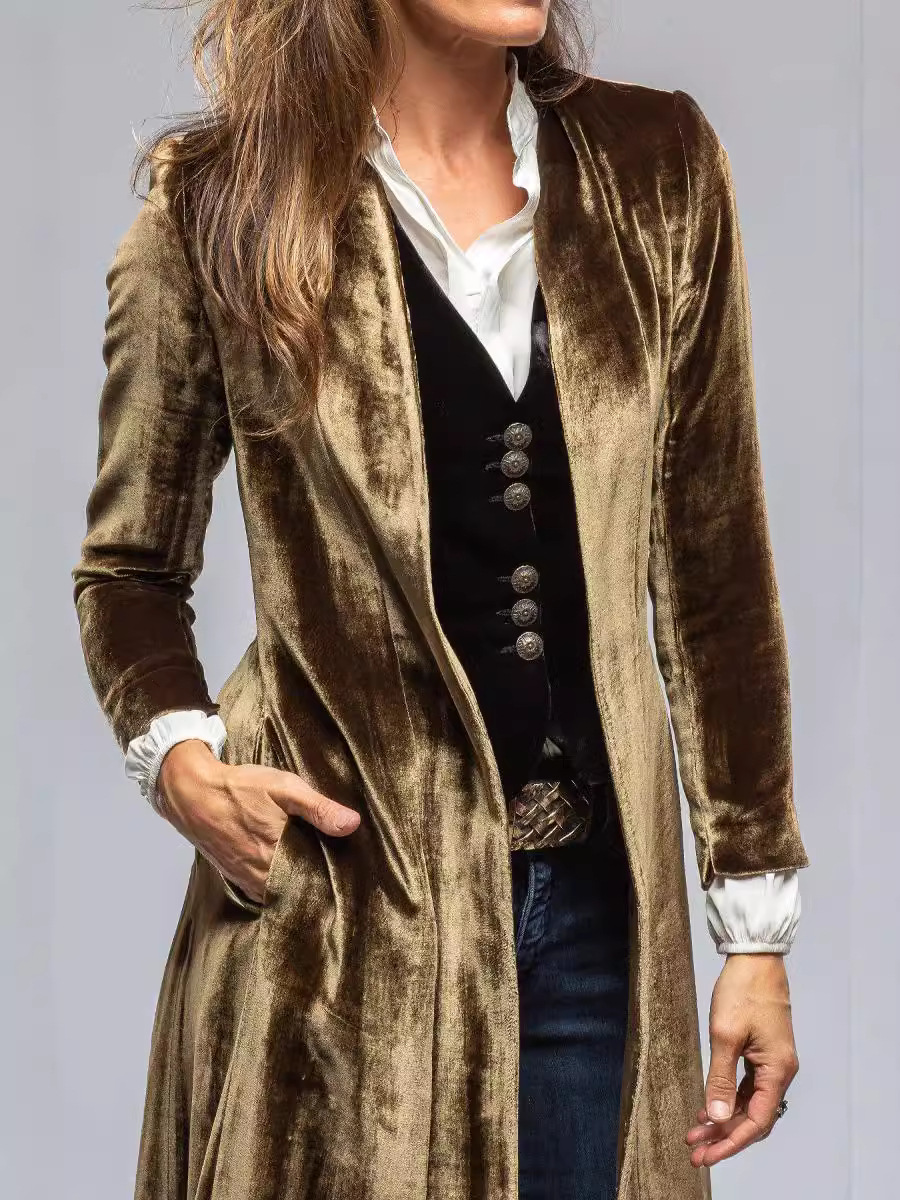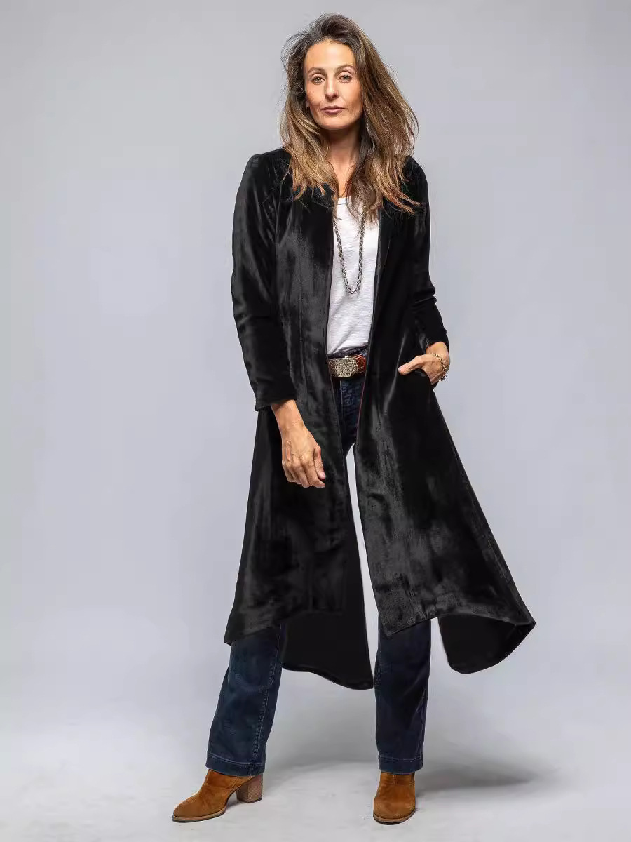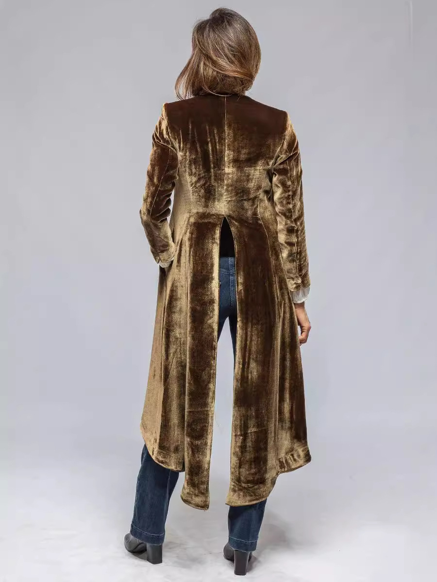 跨境独立站2024新款欧美女装丝绒长款开衫纯色复古开叉外套风衣宽松大衣