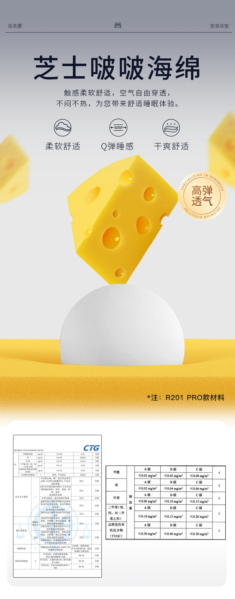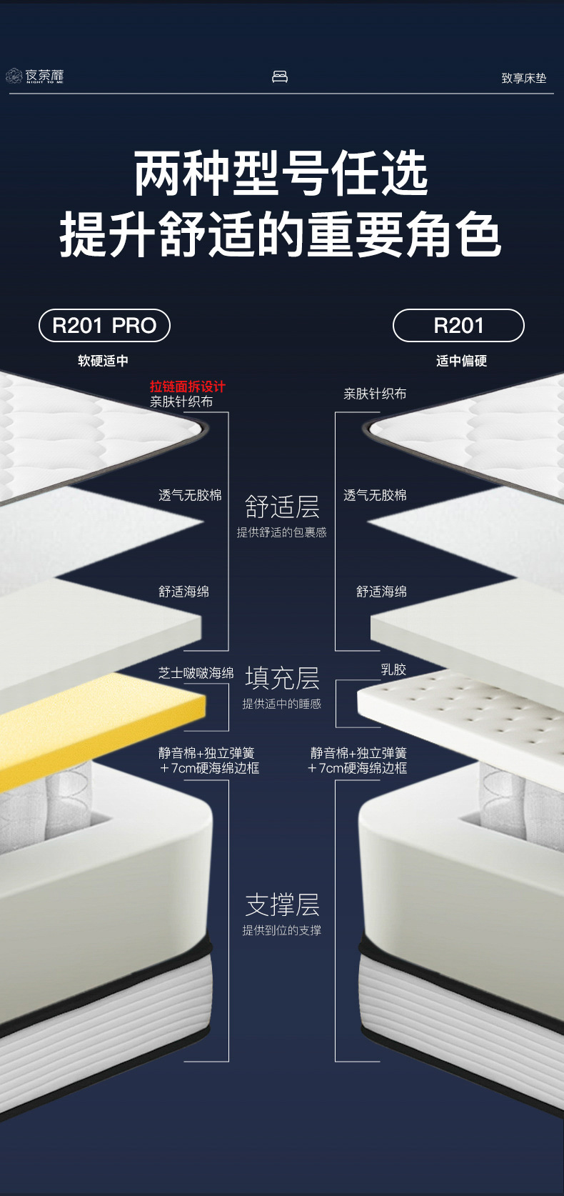 R201: приятный для кожи трикотаж + латекс толщиной 1 см + губка толщиной 1,5 см + хлопок без клея + бесшумная независимая пружина.; R201Pro: приятный для кожи трикотаж + хлопок дофаминового сыра толщиной 2 см + губка толщиной 1,5 см + хлопок без клея + бесшумная независимая пружина