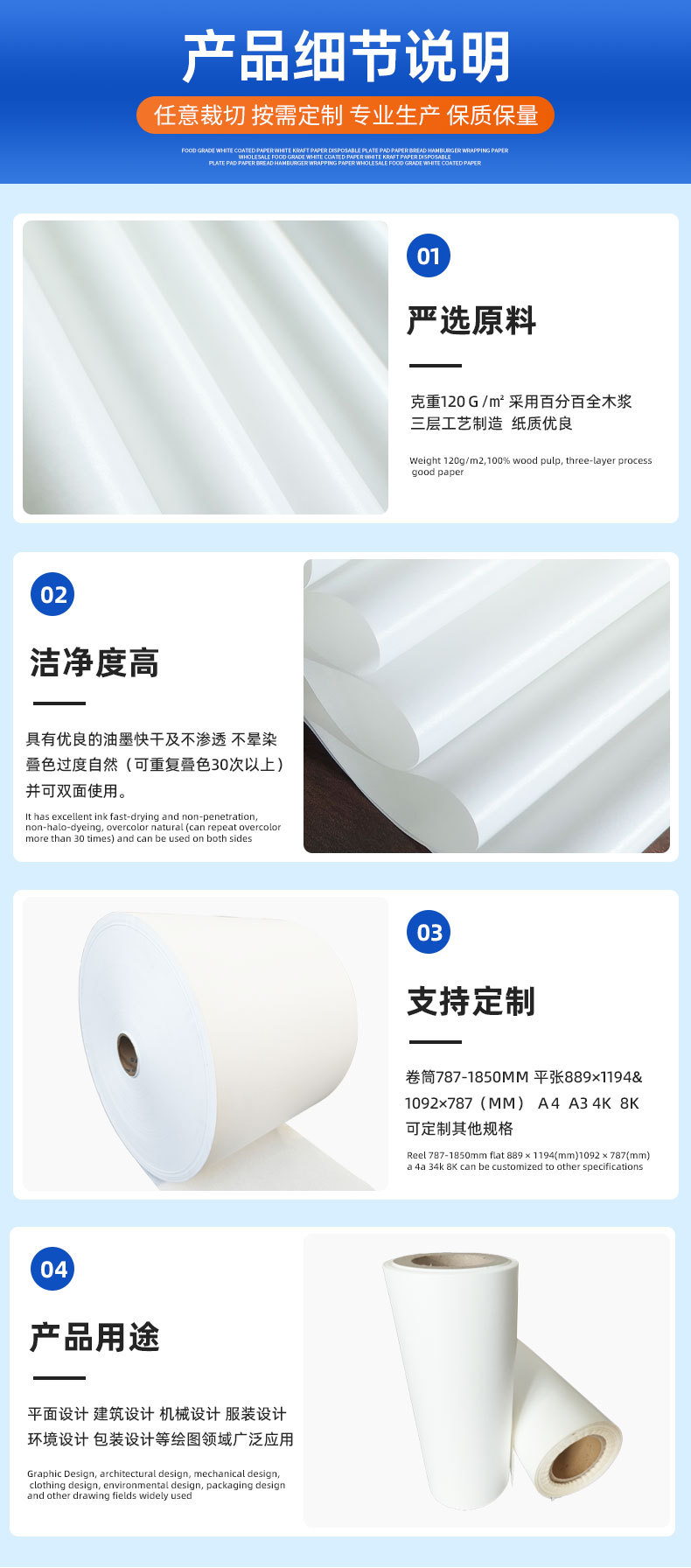 各类食品包装纸,医用包装纸,汉堡纸,餐盘垫纸,制作炸鸡袋,炸薯条袋,航空高铁用垃圾袋,吸管包装纸,干燥剂包装纸,电子原器件包装纸,葡萄保鲜纸,柚子包装纸,防油纸等。