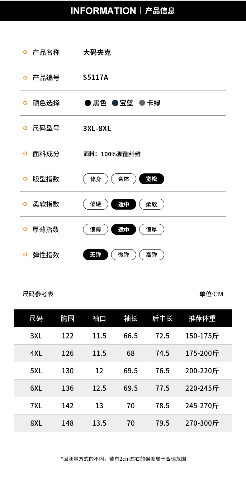3XL< 87.5kg; 4XL< 100kg; 5XL< 110kg; 6XL< 122.5kg; 7XL< 135kg; 8XL< 150kg