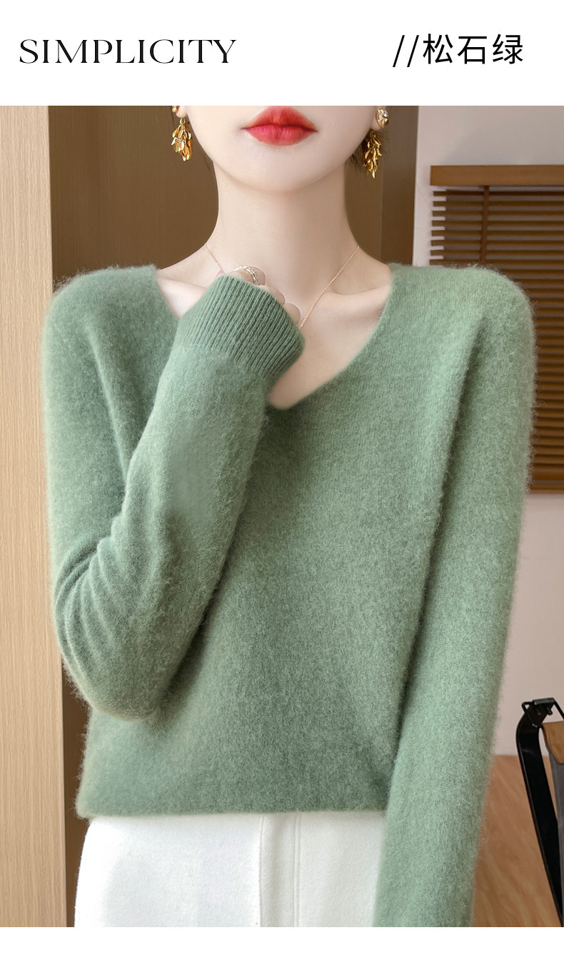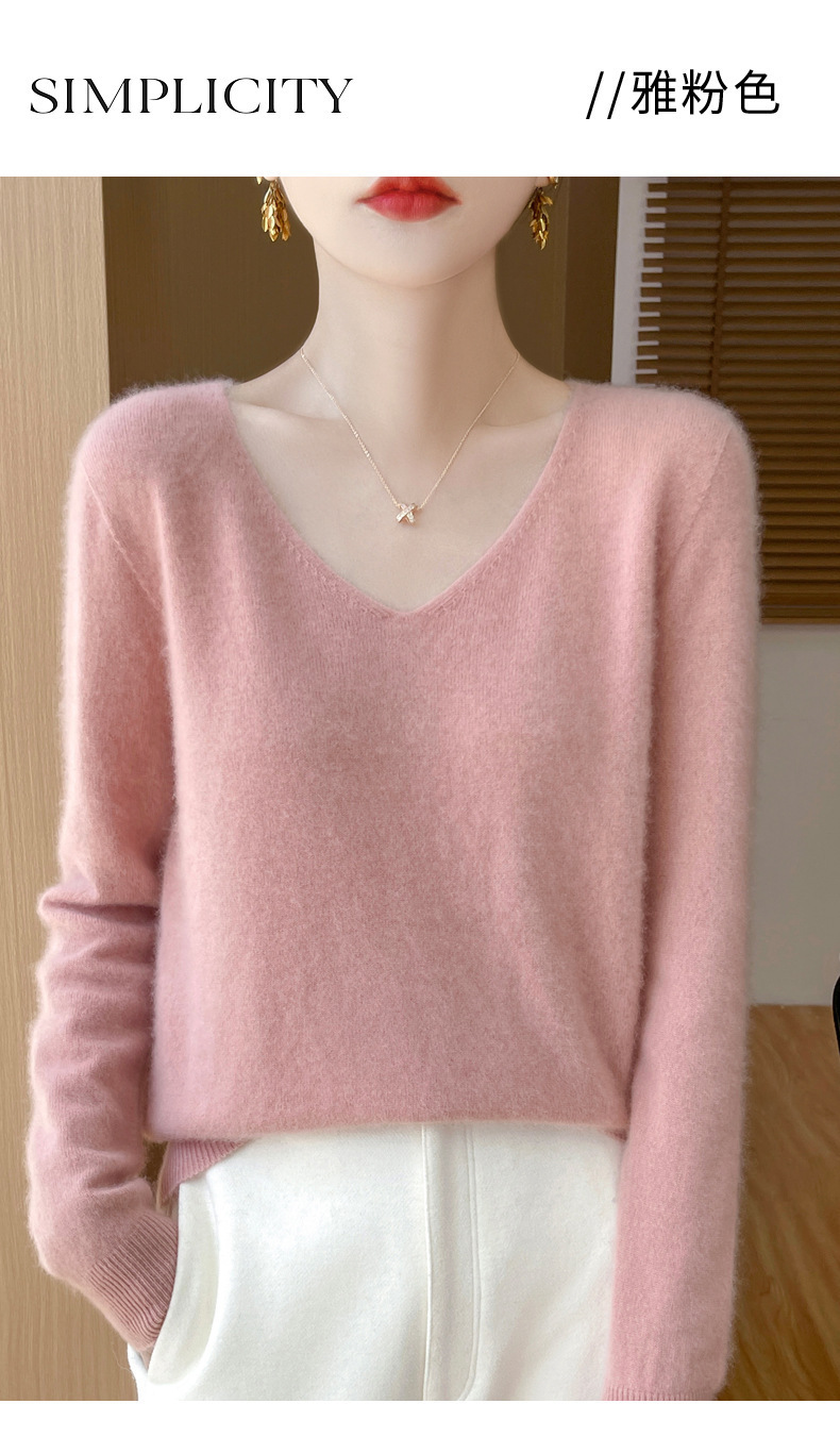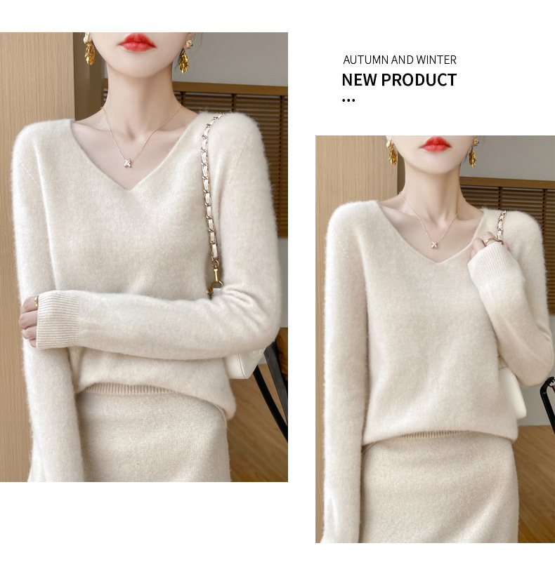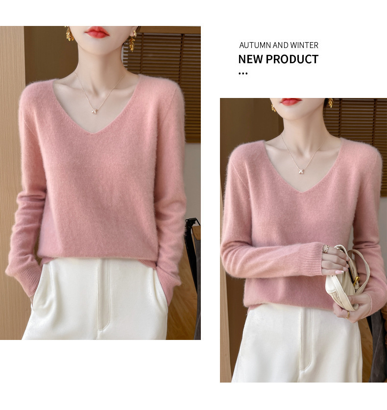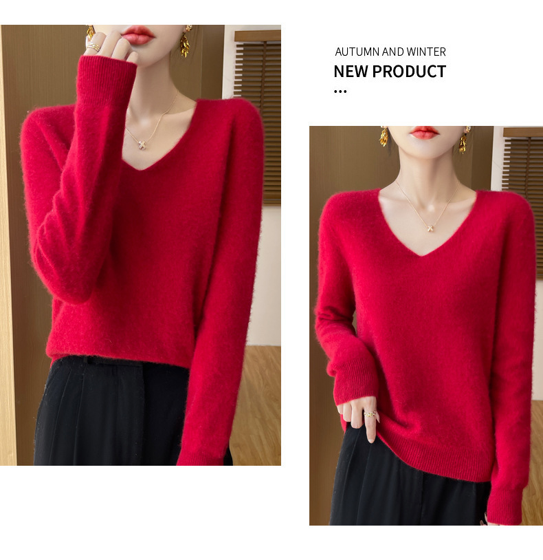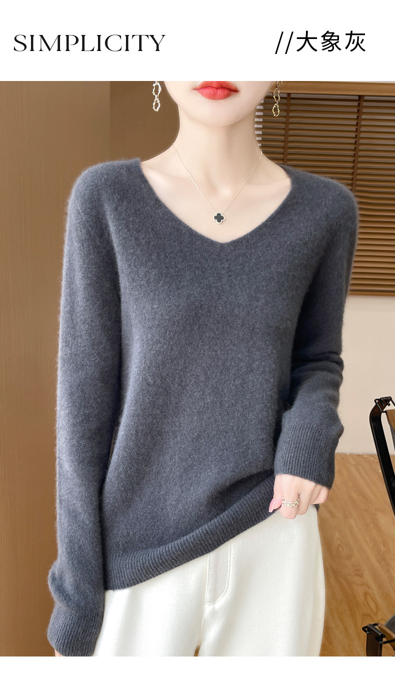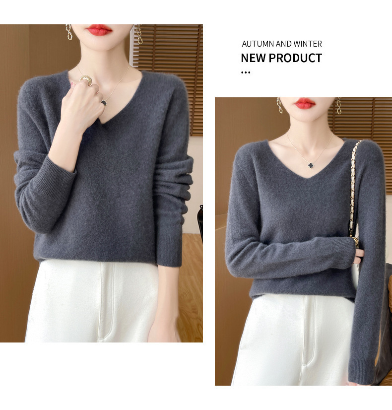 Оптовая продажа женских шерстяных свитеров из 100% шерсти, первоклассное изделие, V-образный вырез, мягкая трикотажная верхняя одежда, утягивающая базовая рубашка для верхнего слоя.