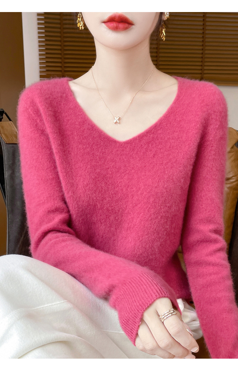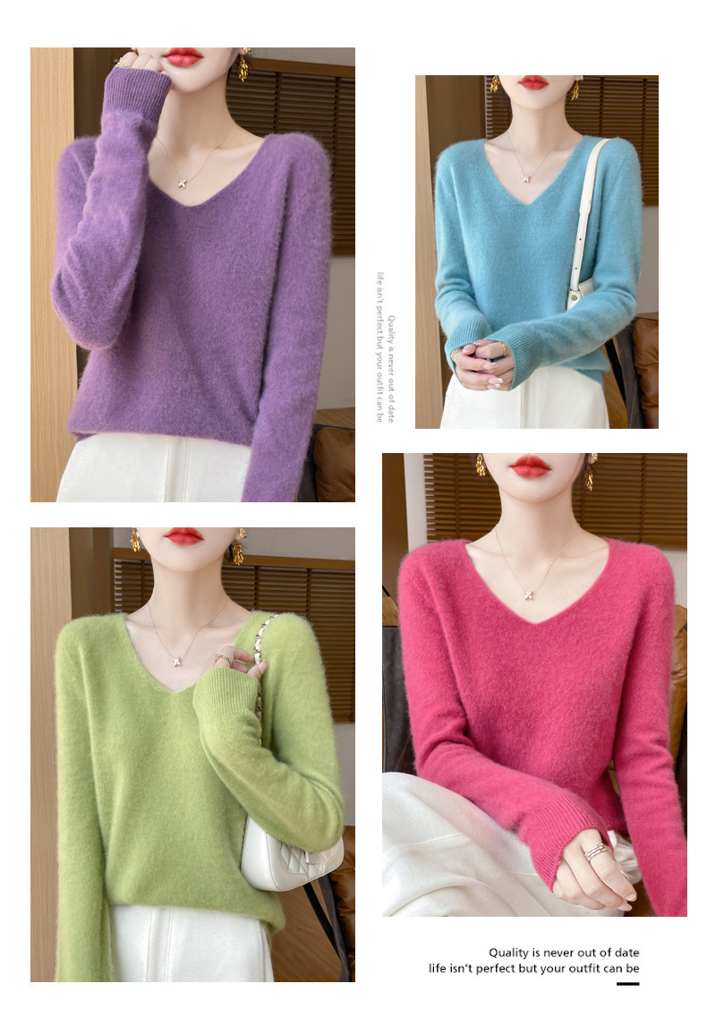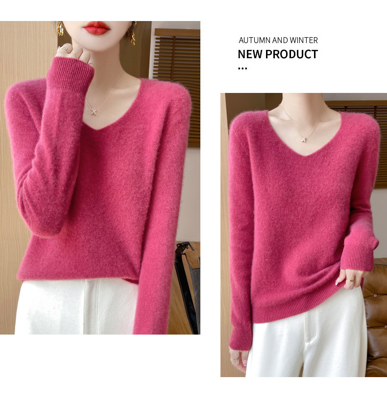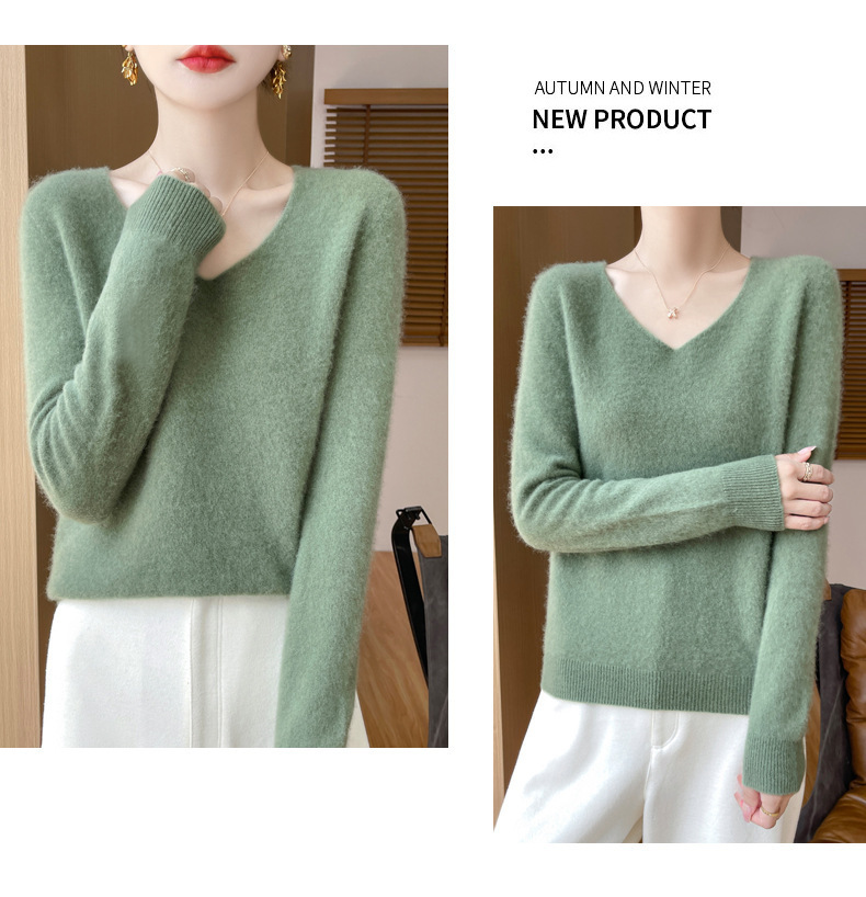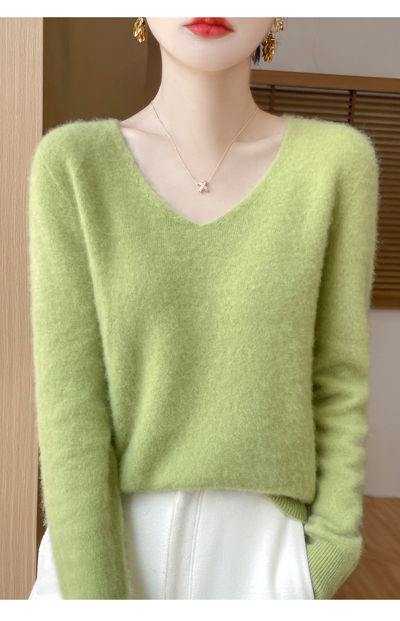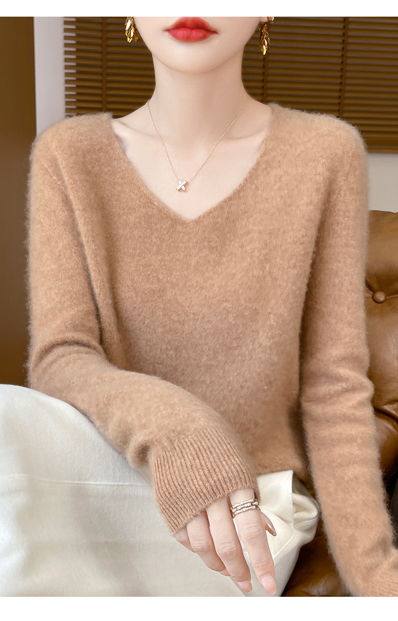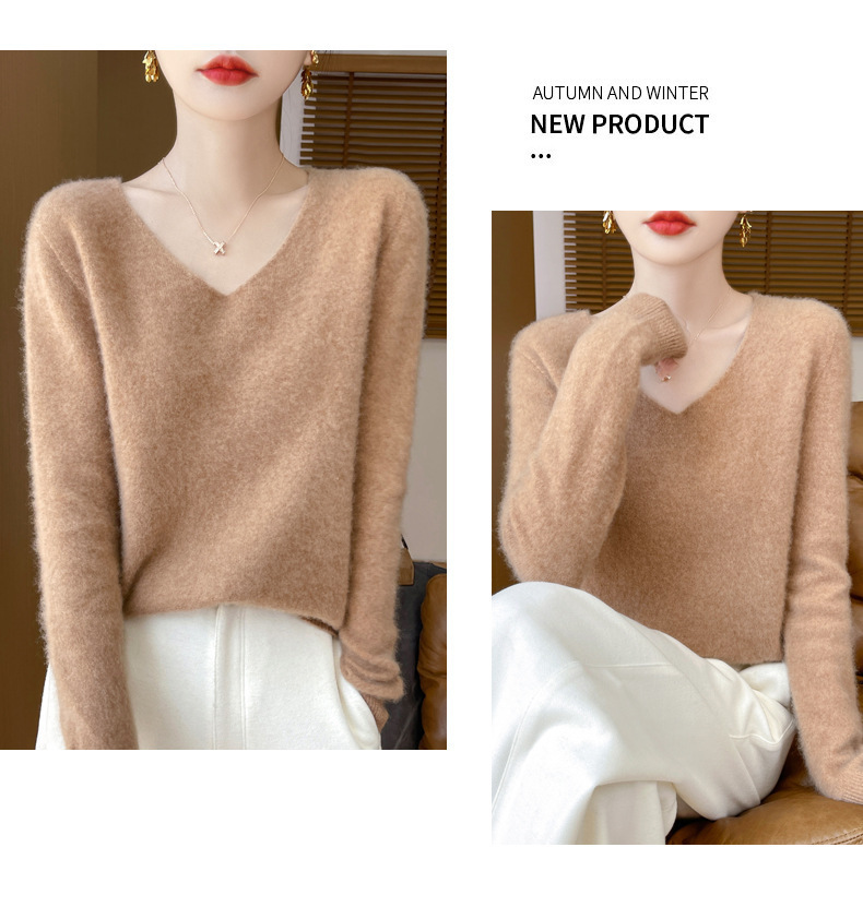 Оптовая продажа женских шерстяных свитеров из 100% шерсти, первоклассное изделие, V-образный вырез, мягкая трикотажная верхняя одежда, утягивающая базовая рубашка для верхнего слоя.