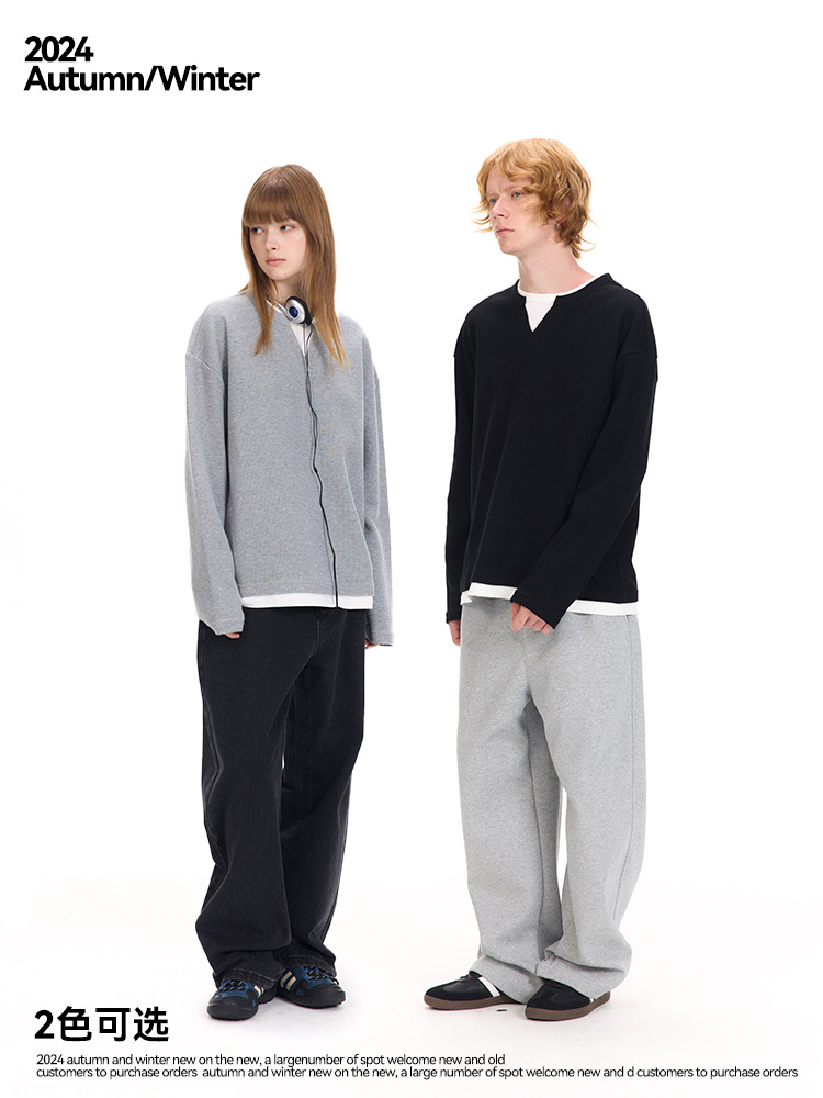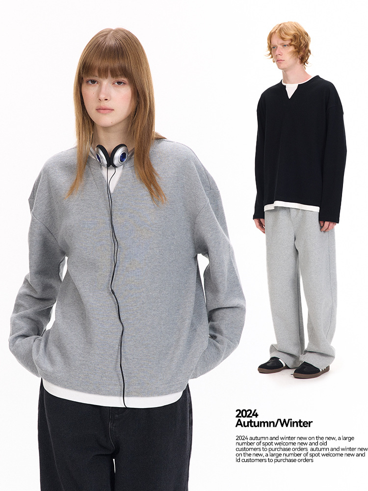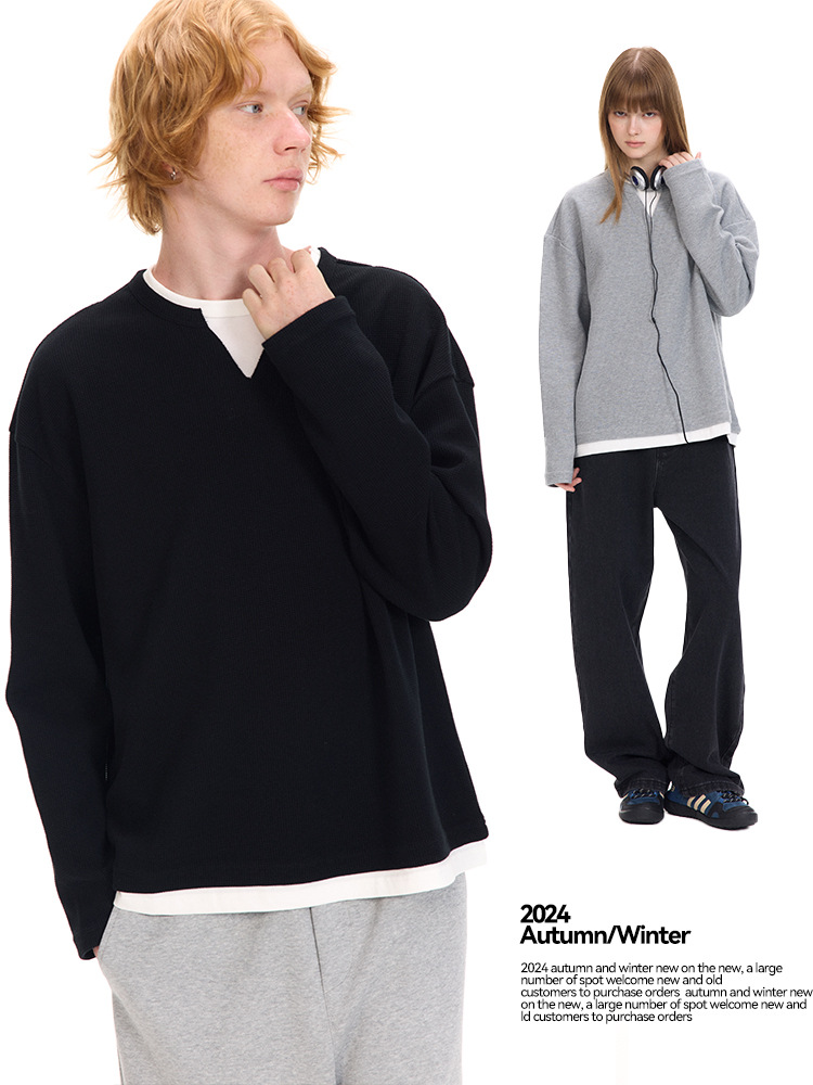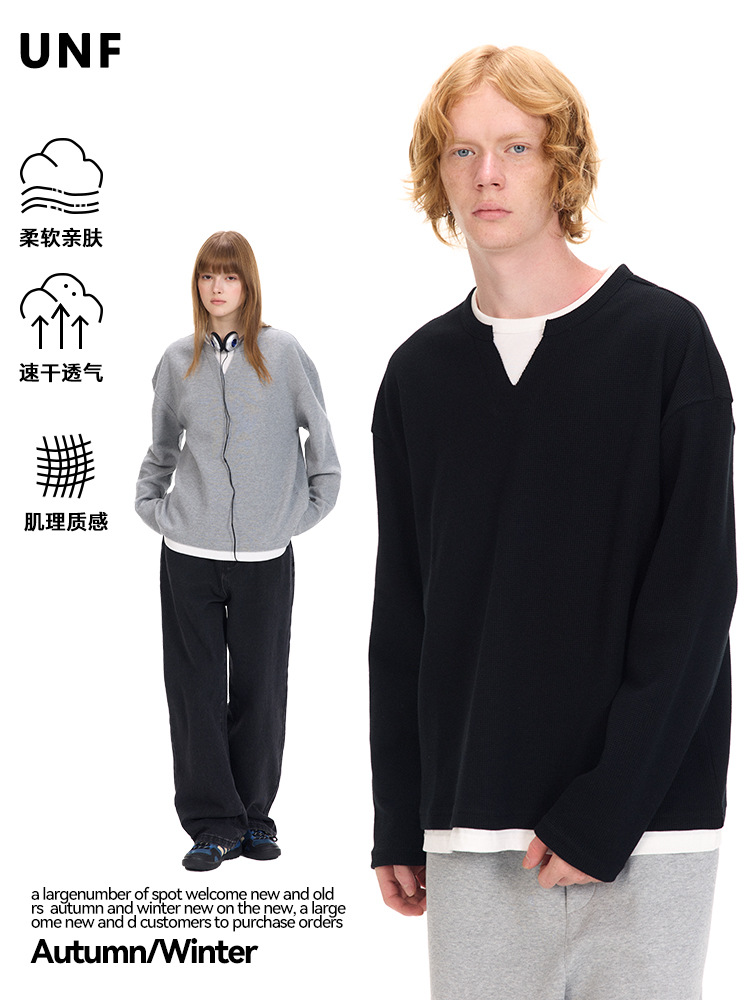 UNF осенне-зимняя новая нишевая американская искусственная вафельная футболка из двух частей чистого цвета с длинными рукавами 320G трикотаж с круглым вырезом для мужчин и женщин