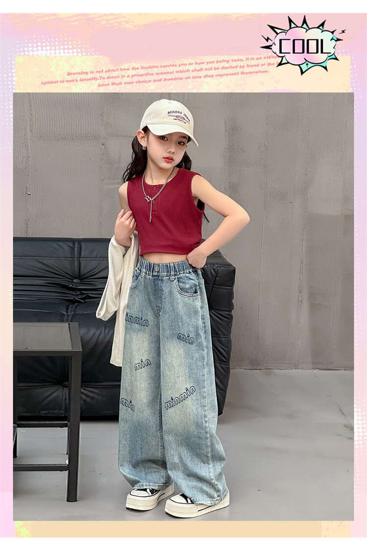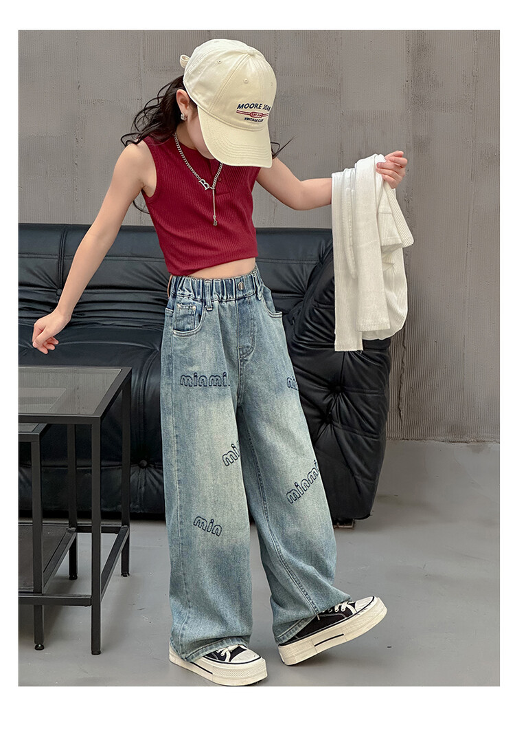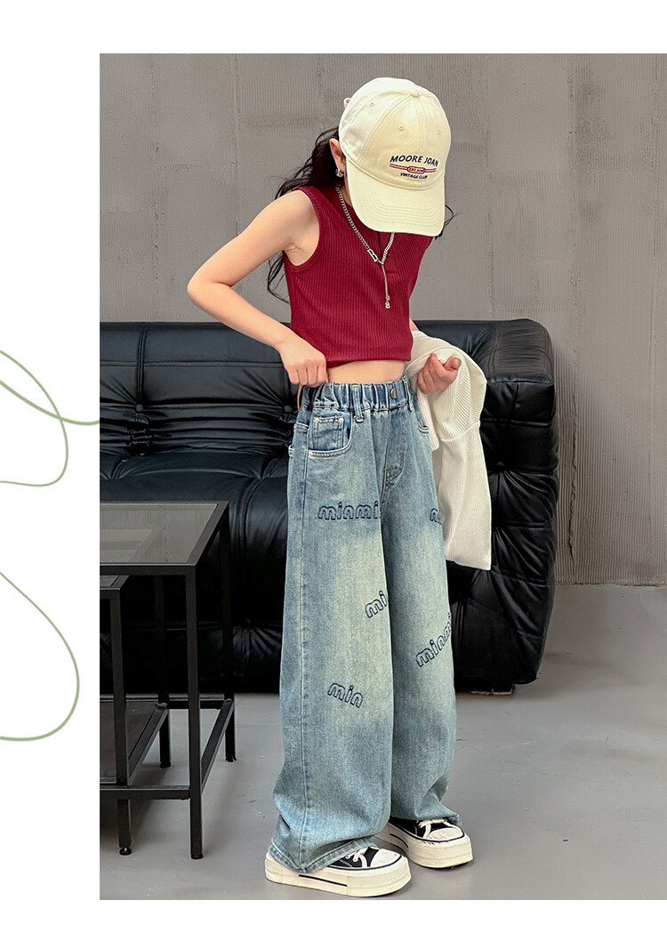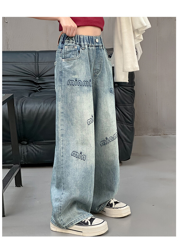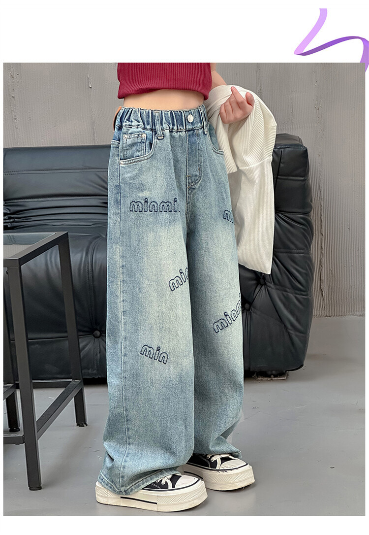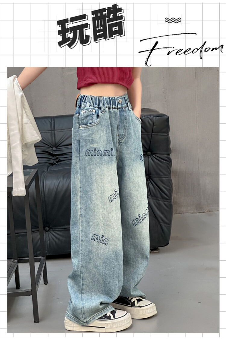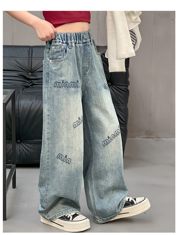 Джинсы для девочек весна осень 2024 новый стиль ретро девушка среднего и большого ребенка широкие брюки свободные прямые брюки
