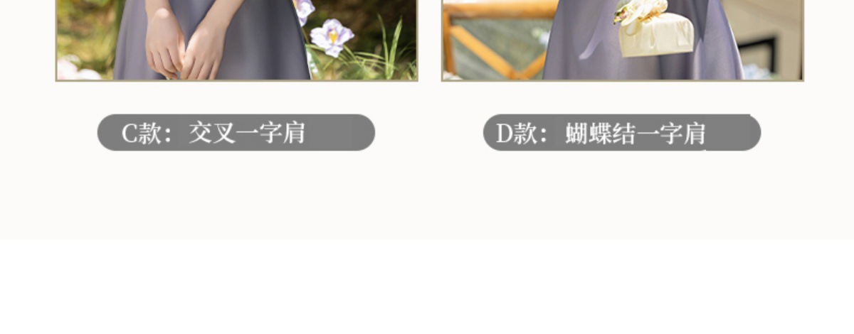 Фиолетовые рукава-буфы на плечах (296); Фиолетовый V-образный вырез с короткими рукавами (296); Фиолетовый крест на одно плечо (296); Фиолетовый бант на одно плечо (296)