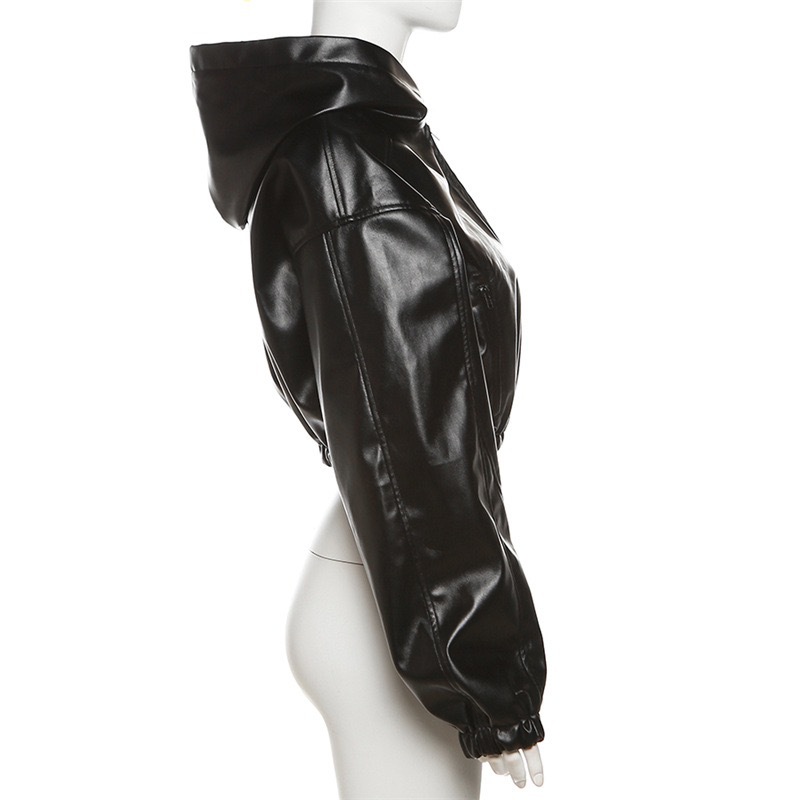 Европейский и американский стиль 2024, весенне-осенняя женская модная куртка на молнии с длинными рукавами и коротким пупком, тонкая кожаная куртка с капюшоном, куртка из искусственной кожи для женщин