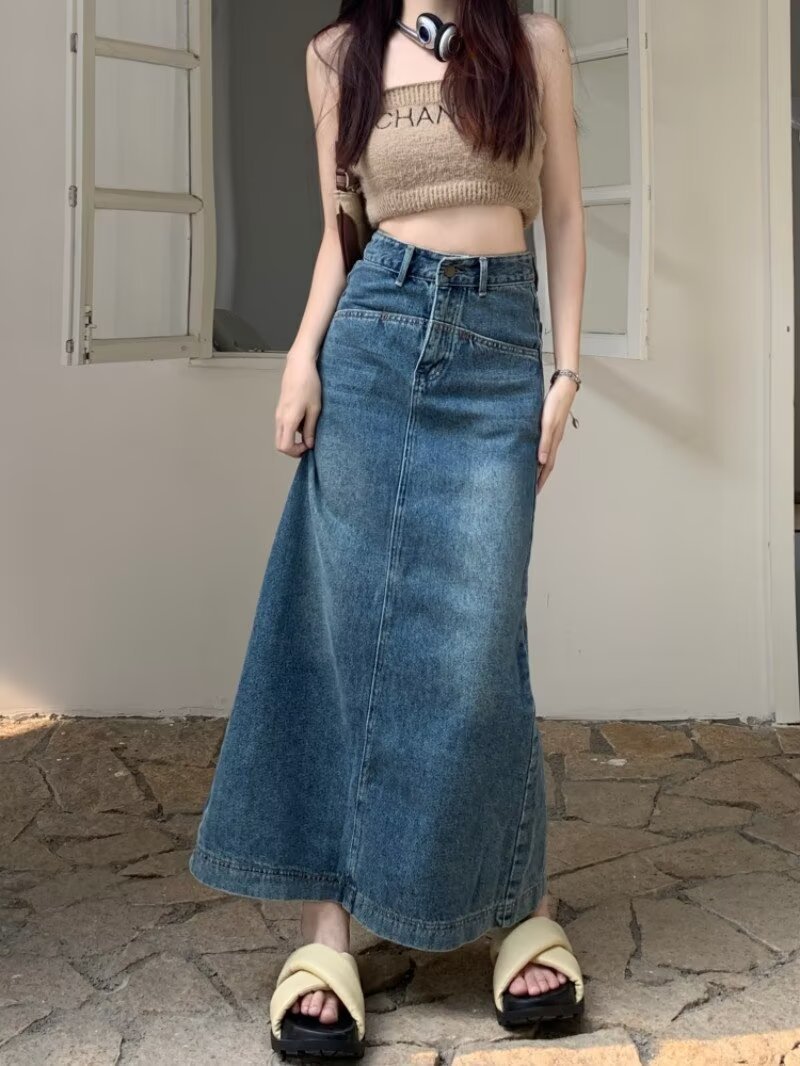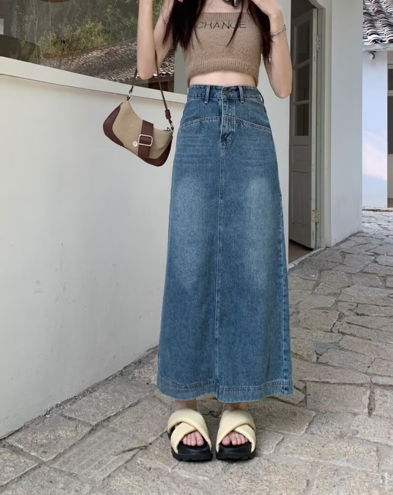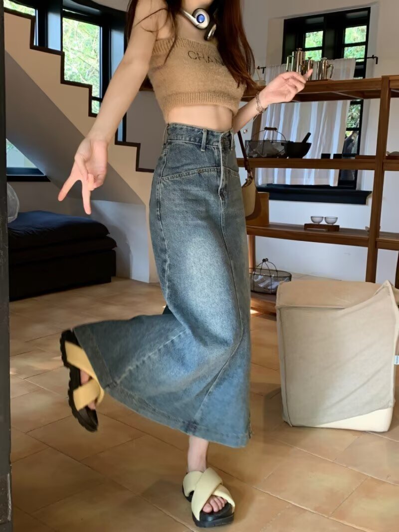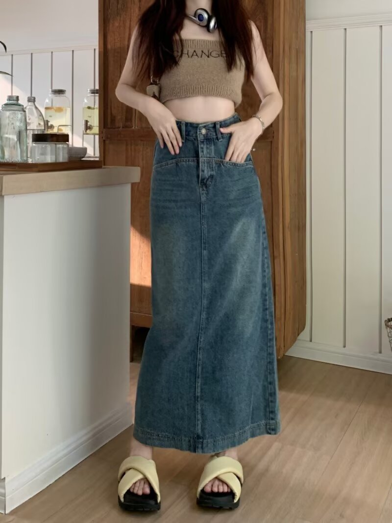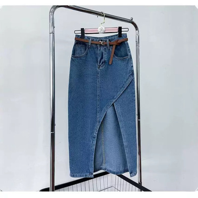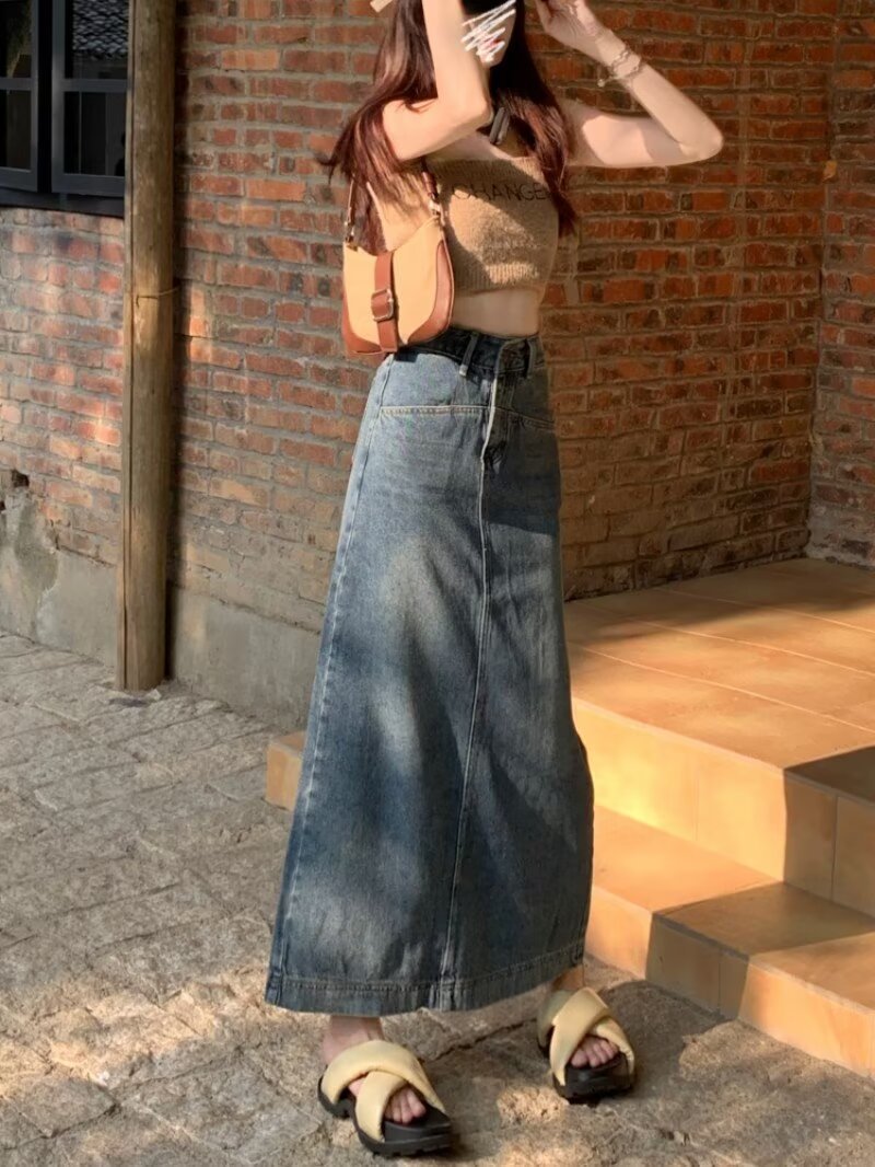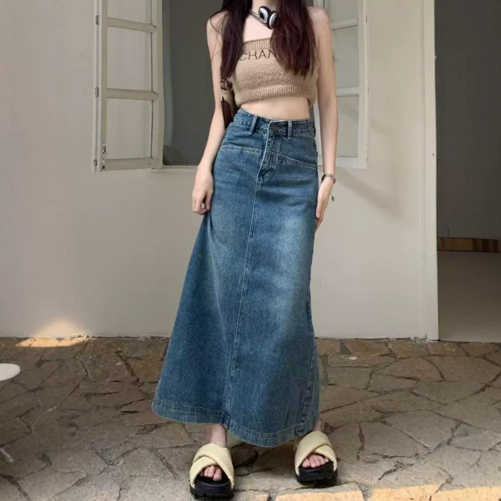 Джинсовая юбка больших размеров в стиле ретро для женщин, весна и осень 20220, новая юбка А-силуэта с высокой талией, средней длины с разрезом сзади