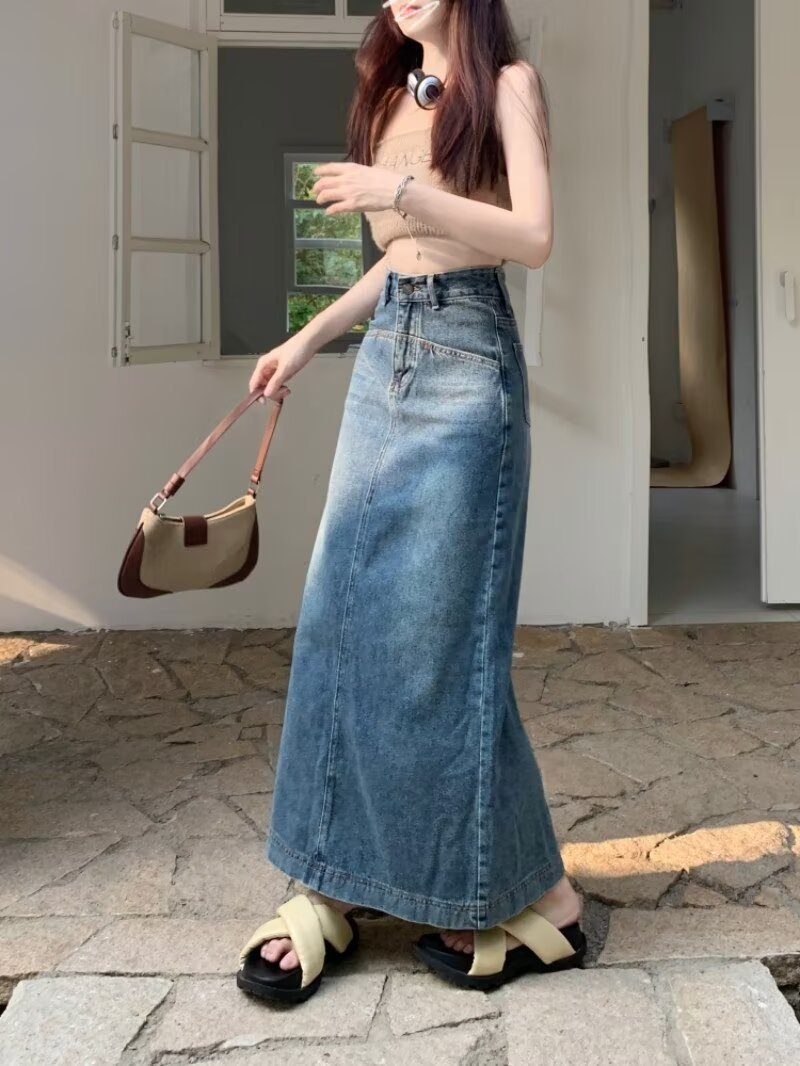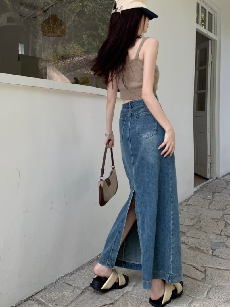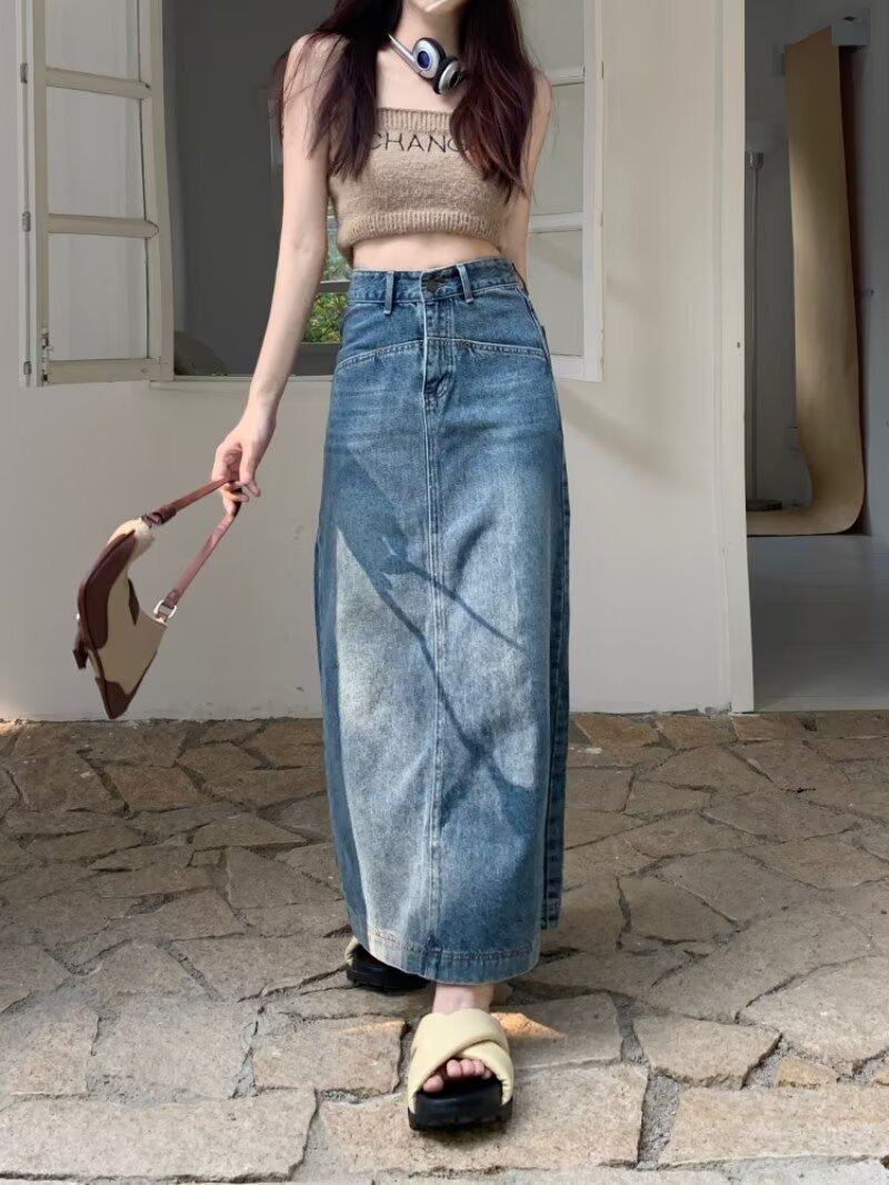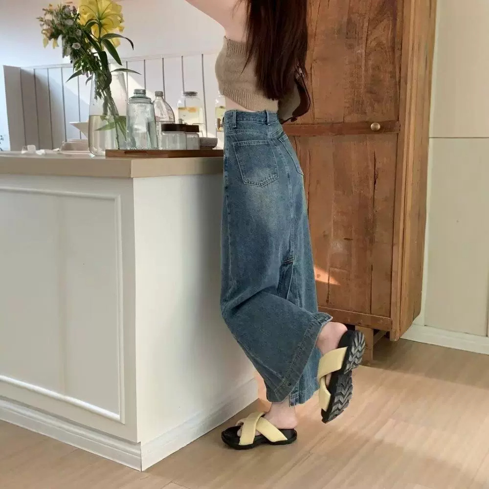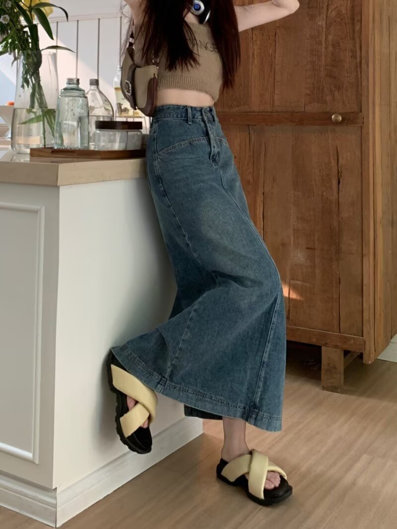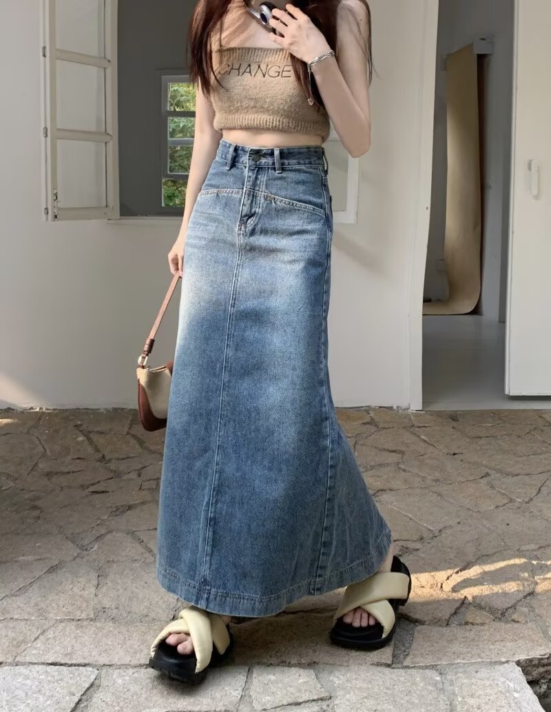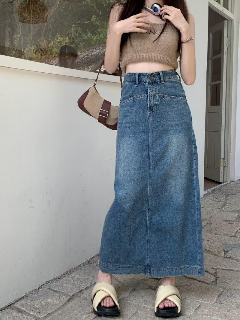 Джинсовая юбка больших размеров в стиле ретро для женщин, весна и осень 20220, новая юбка А-силуэта с высокой талией, средней длины с разрезом сзади