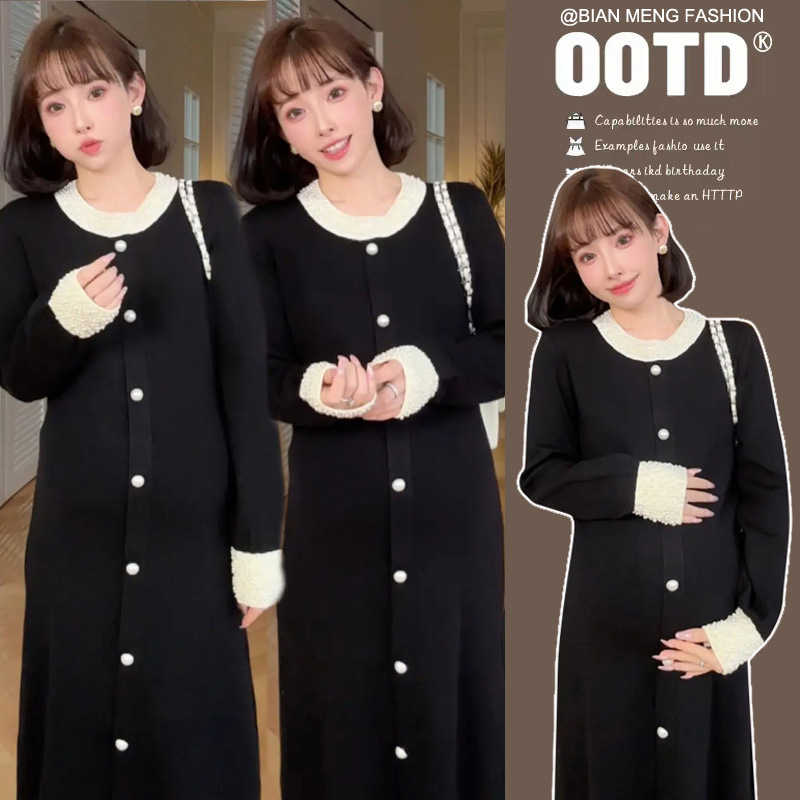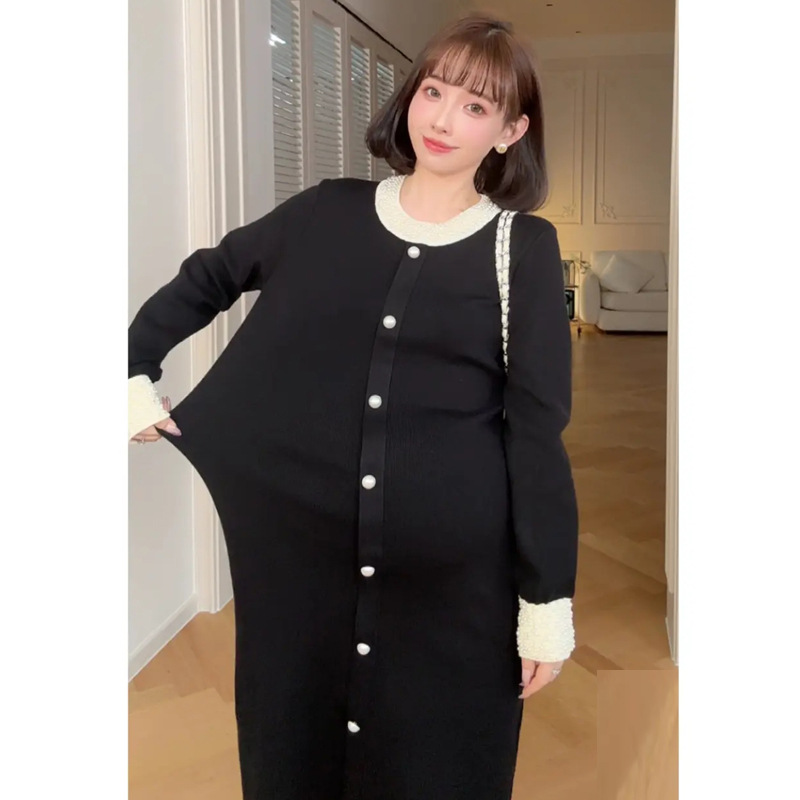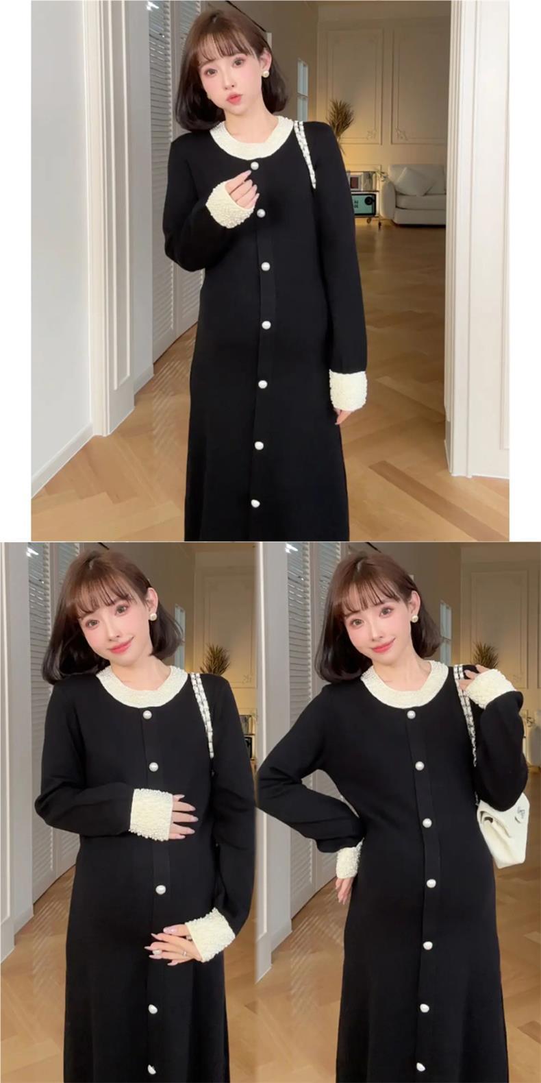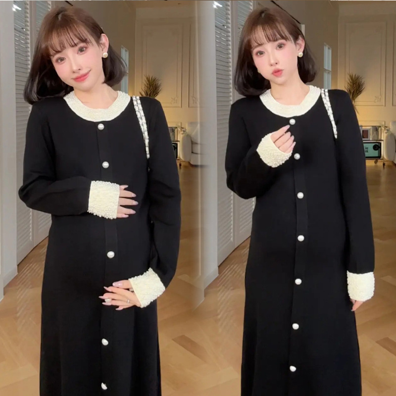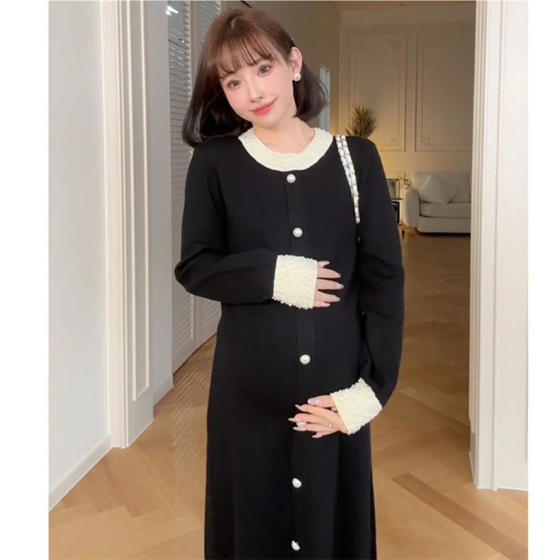 Новое осенне-зимнее платье для беременных 2025 года с обильной отделкой из жемчуга, элегантное и изысканное в стиле французской Одри Хепберн, черное облегающее трикотажное платье.
