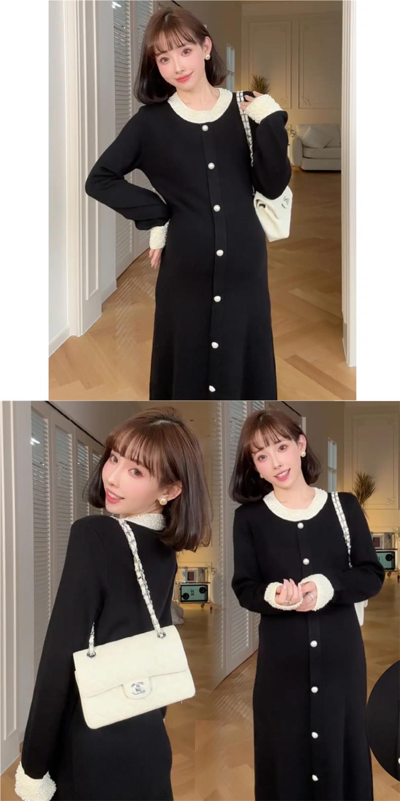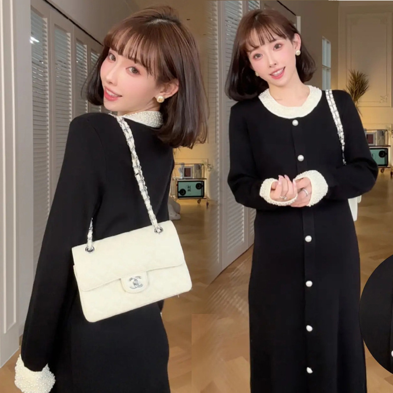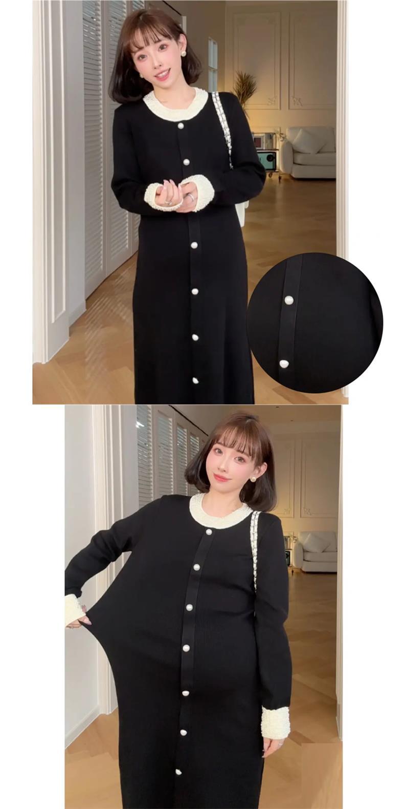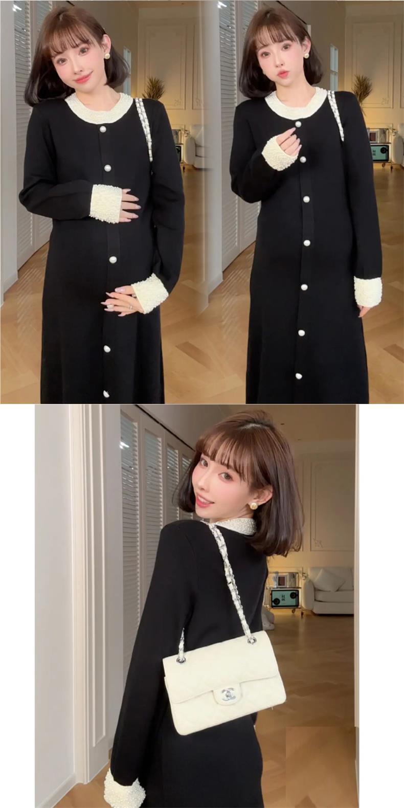 Новое осенне-зимнее платье для беременных 2025 года с обильной отделкой из жемчуга, элегантное и изысканное в стиле французской Одри Хепберн, черное облегающее трикотажное платье.