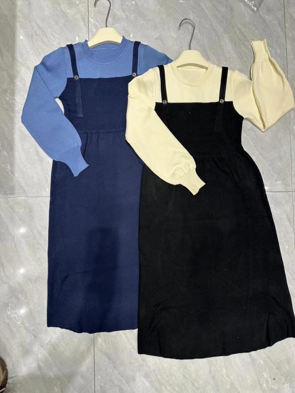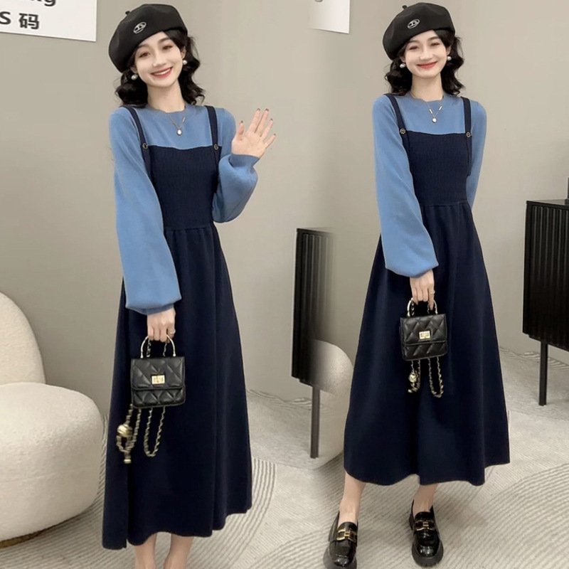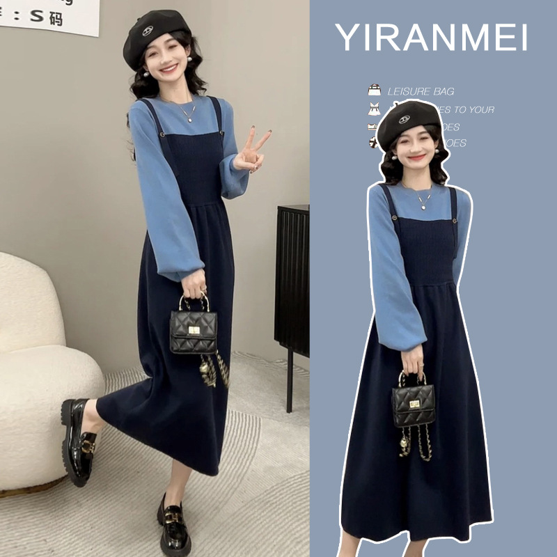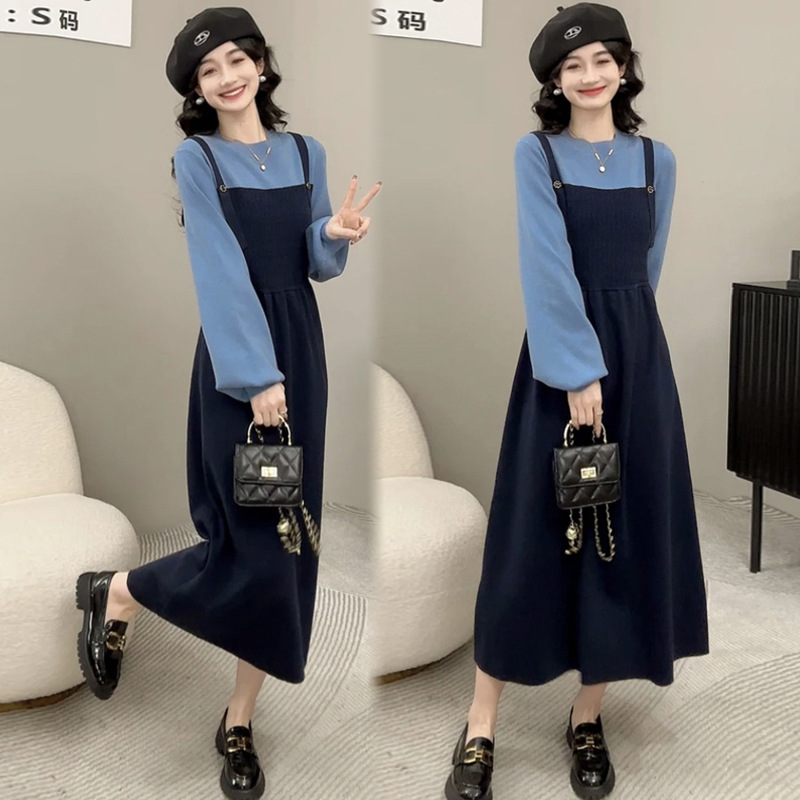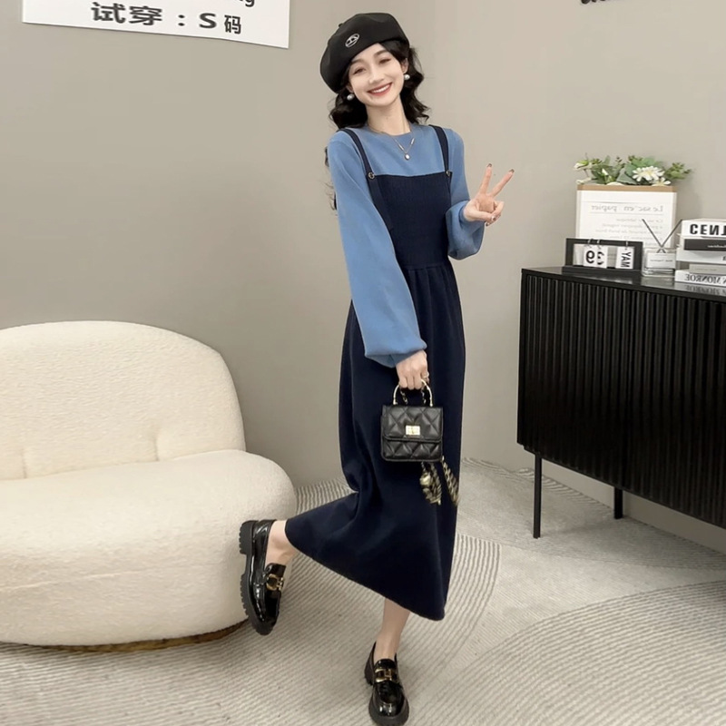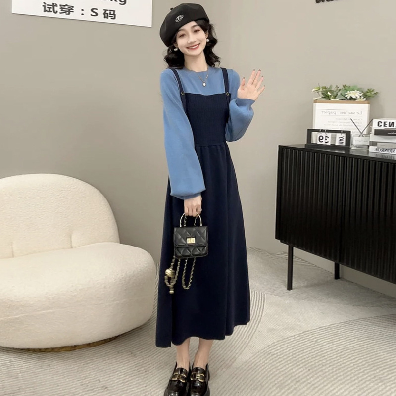 Платье для беременных осень-зима 2024, новая модная универсальная модель, синий, на бретелях, имитация двухслойного, контрастный цвет, вязаный свитер для кормящих мам