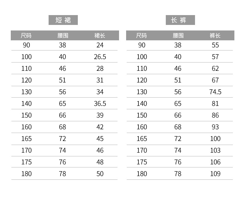 120cm; 130cm; 140cm; 150cm; 160cm; 165cm; 170cm; 175cm; 180cm