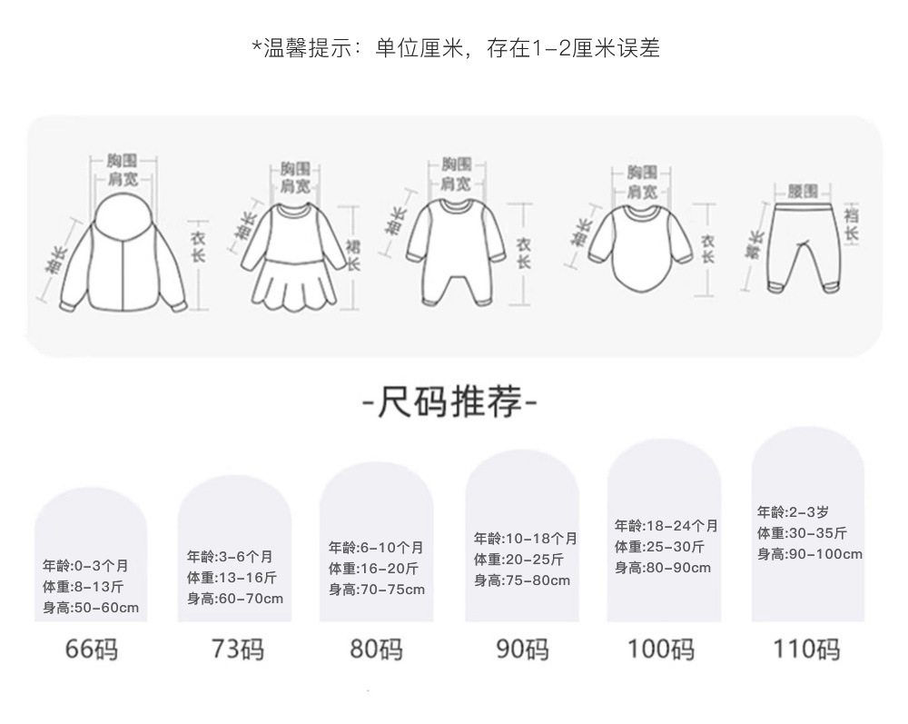 59 см (рекомендуется 0-2 месяца в пределах 10 кг); 66 см (рекомендуется 1-3 месяца в пределах 13 кг); 73 см (рекомендуется в течение 3-6 месяцев в течение 16 кг); 80 см (рекомендуется 6-10 месяцев в пределах 20 кг); 90 см (рекомендуется 10-18 месяцев в пределах 25 кг); 100 см (рекомендуется в пределах 30 кг в течение 18-24 месяцев)