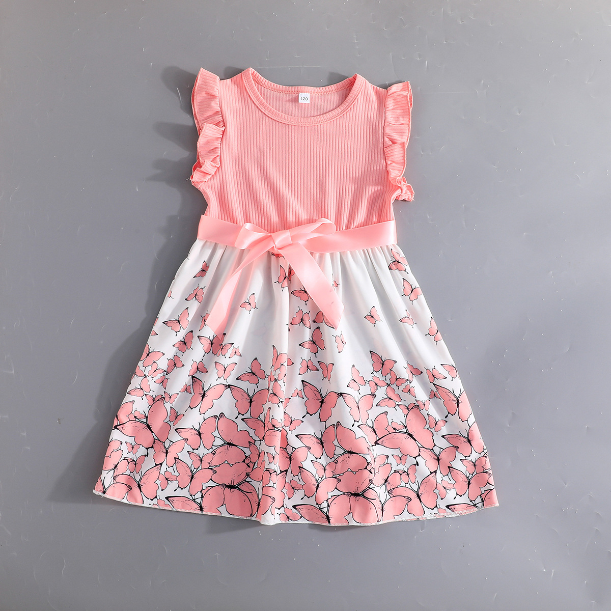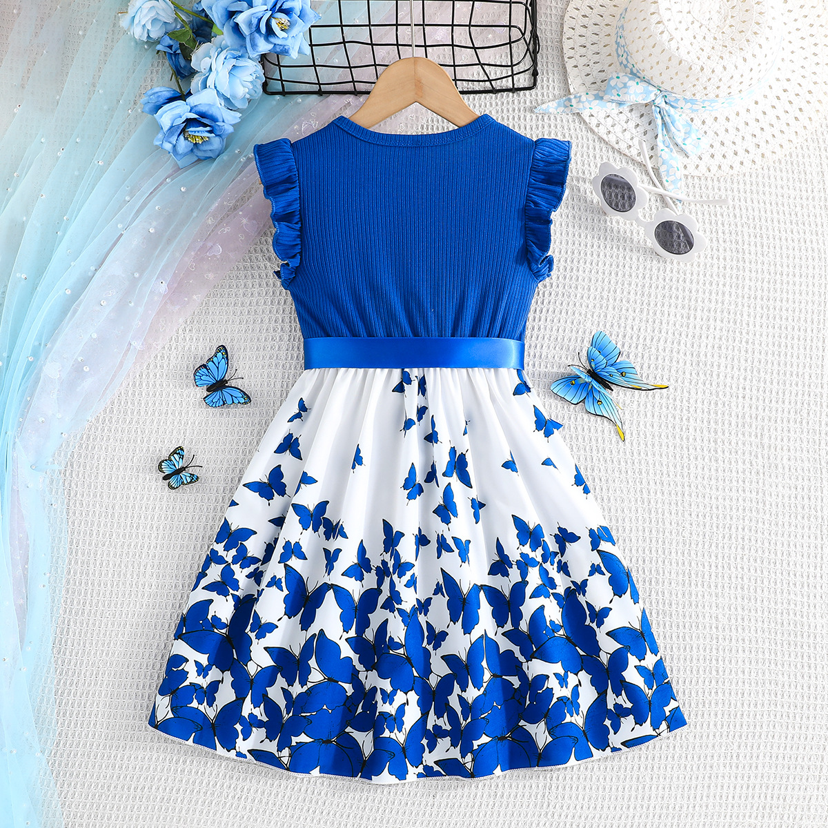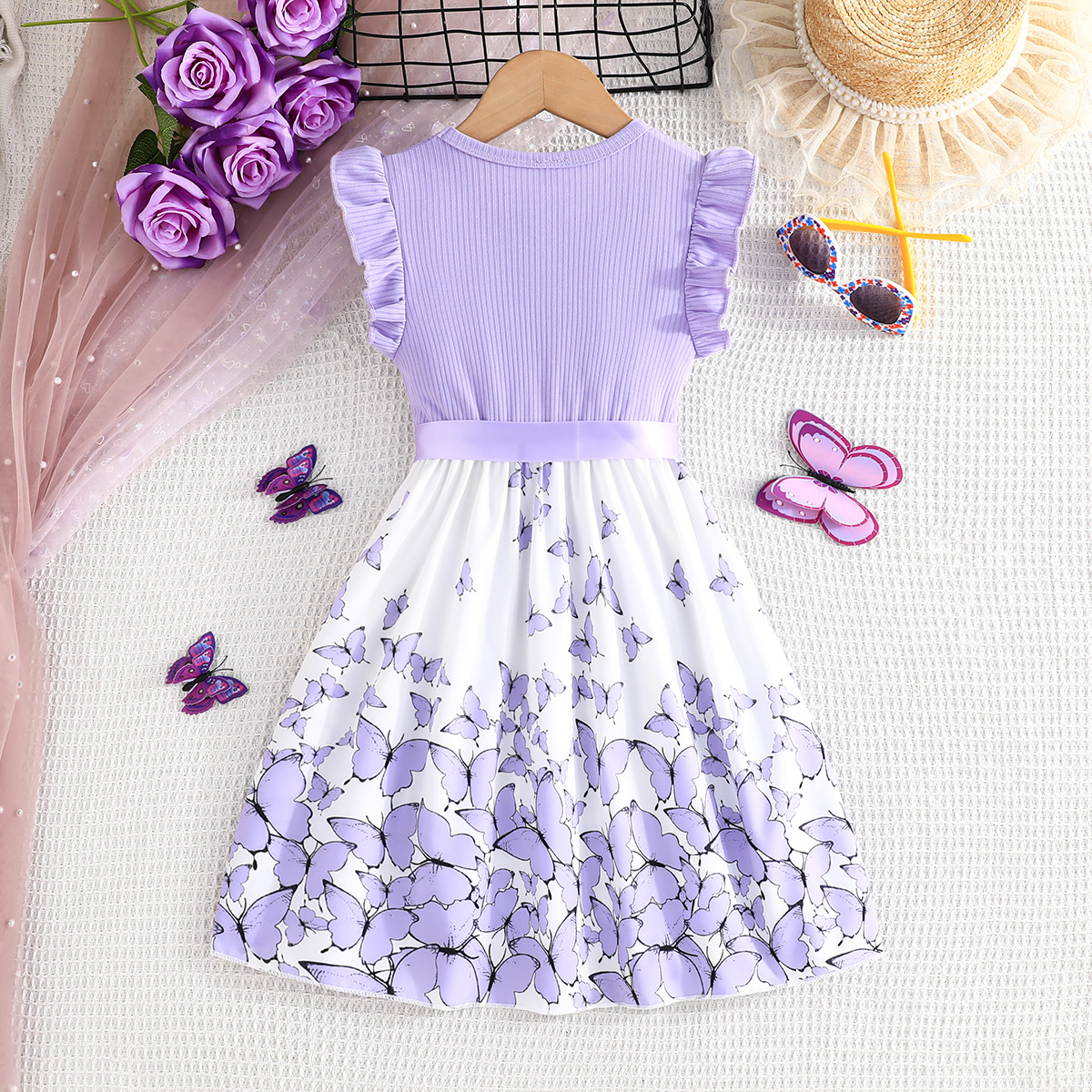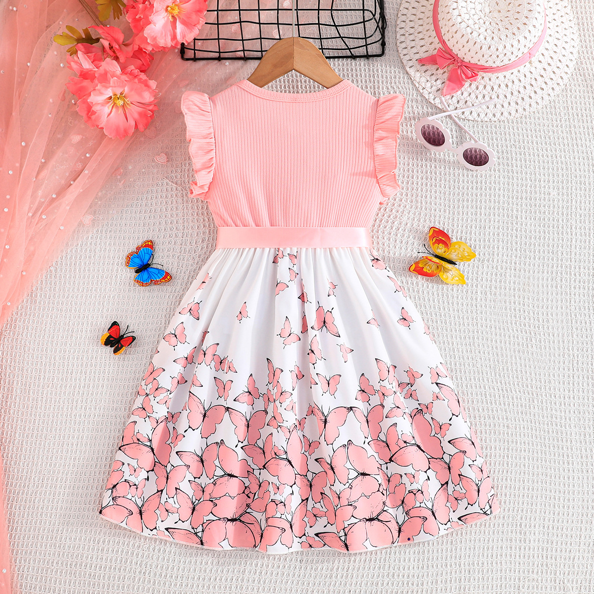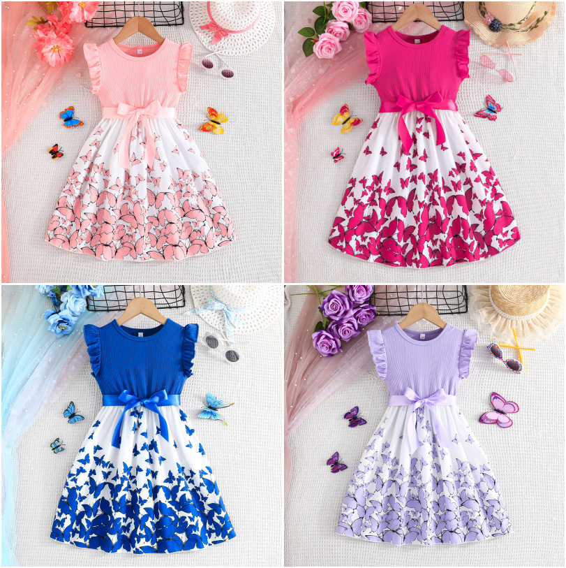 Летнее новое платье для девочек с принтом бабочек и однотонное ребристое платье без рукавов с рюшами + пояс, комплект из 2 предметов