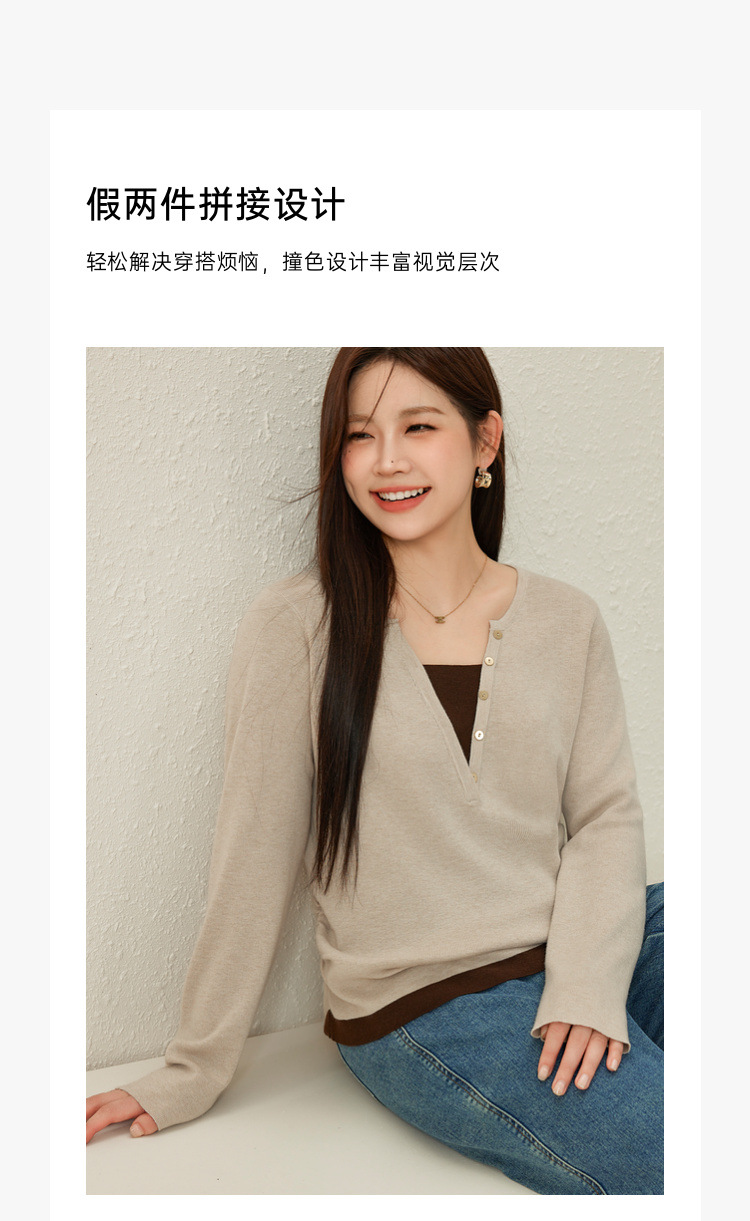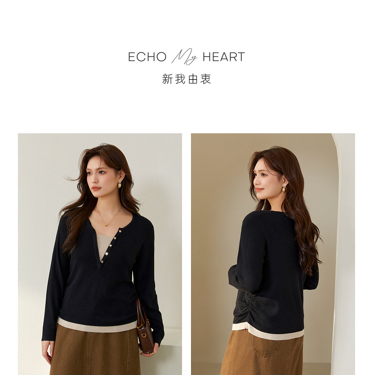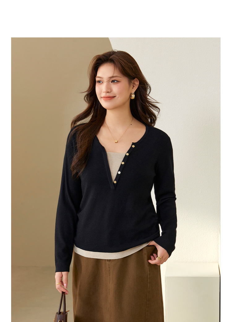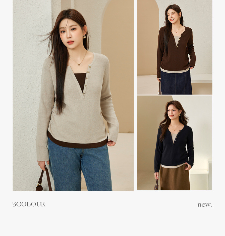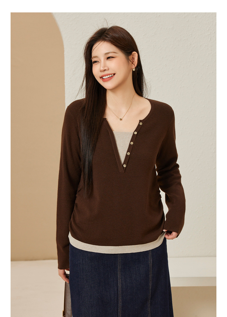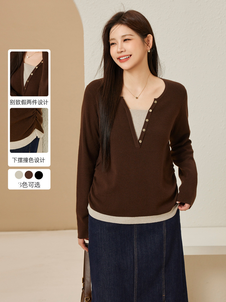 Цветное шоу большой размер женской одежды нежный темперамент, поддельные две тонкие дикие свитера жирный mm2024 осенний новый
