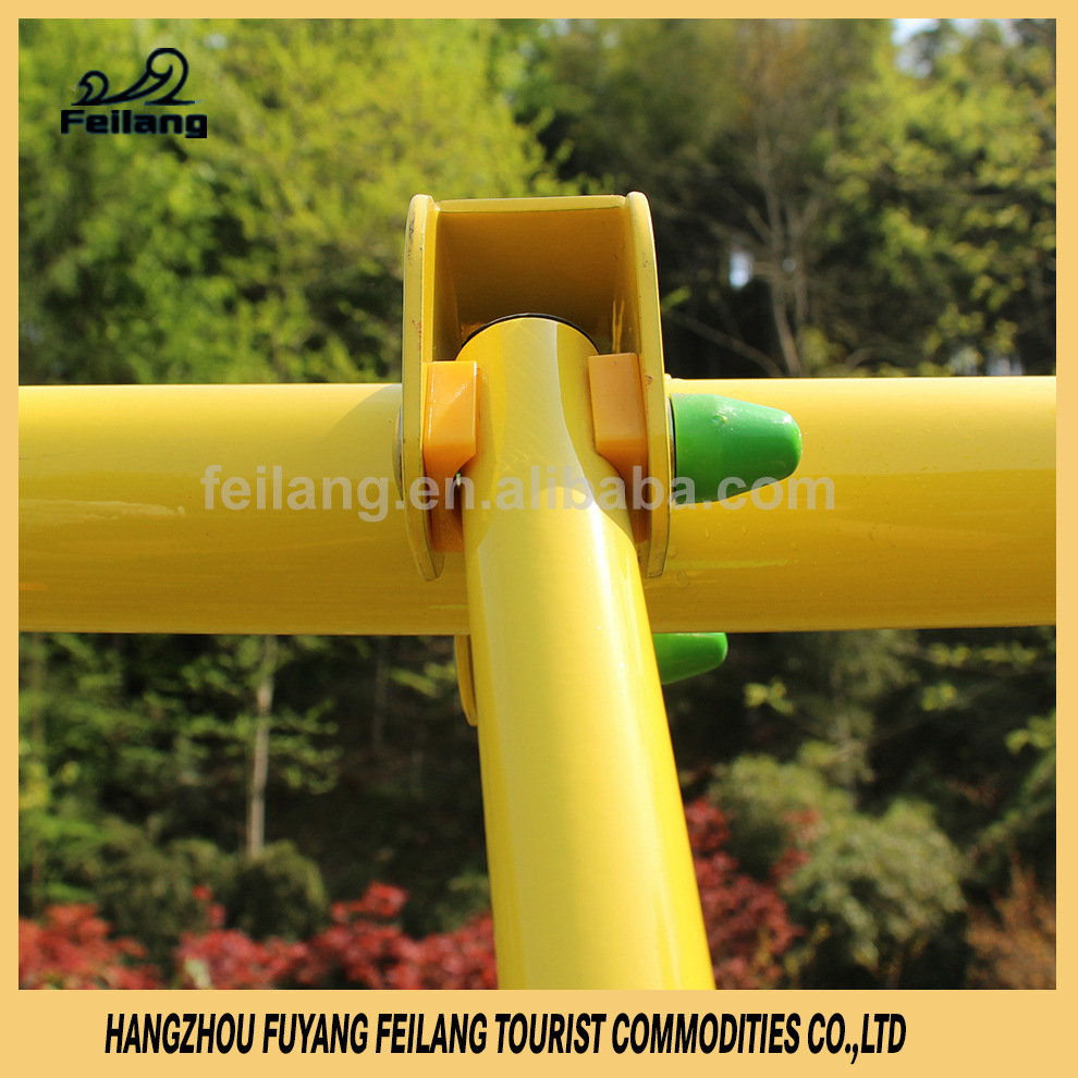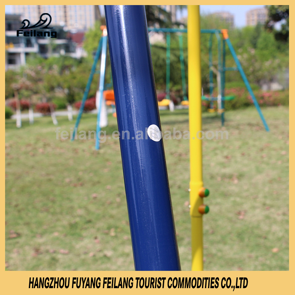 特点:表面镀锌氧化抗UV处理,经久耐用,抗压强度高,安装牢固,美观大方,携带轻便,可拆卸。本款属于儿童秋千架,秋千架支架采用防滑软塑胶,可以防滑固定,也可插地钉固定;采用全钢管连接,承重力好,整体稳固;每颗螺丝(防松螺丝)表面均有塑料套防划处理,防止儿童皮肤划伤,另外可调节尼龙绳索,可任意调节座椅高度;通过SGS,EN71国际安全检测,安全系数高,宝宝更安全,妈妈更放心。