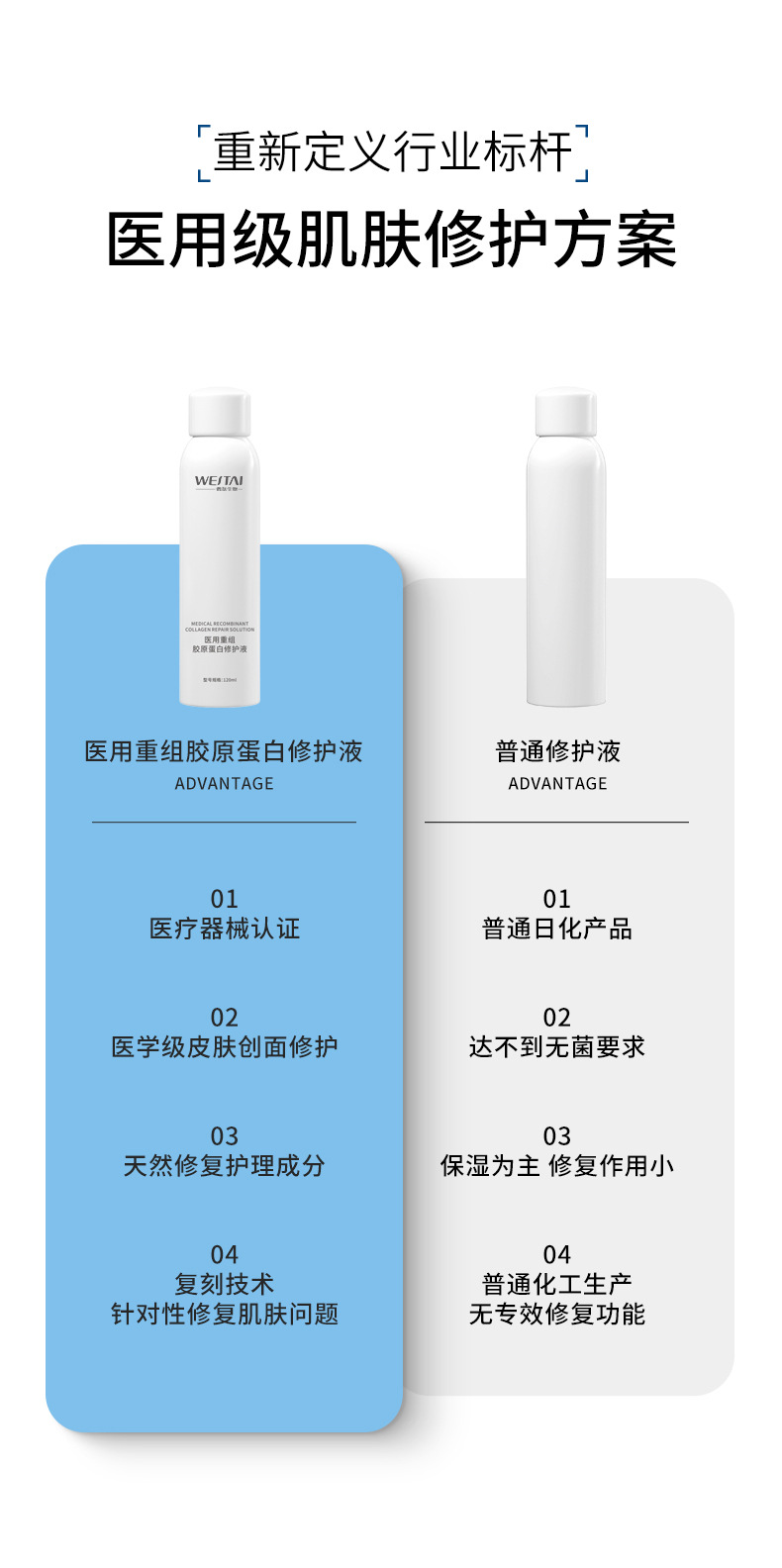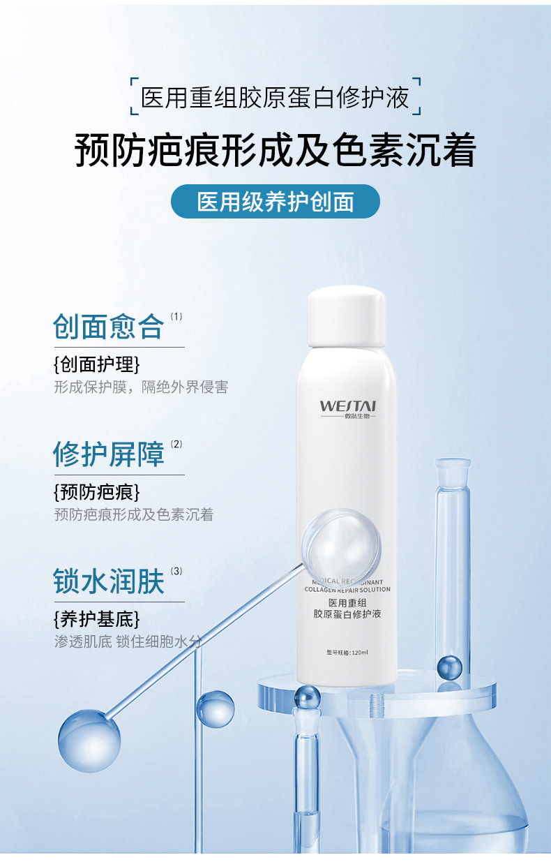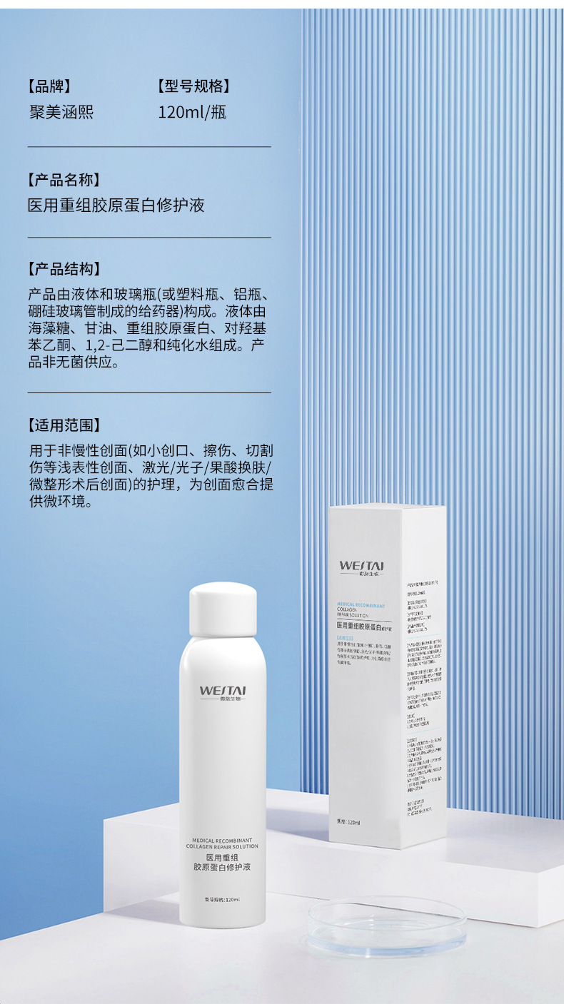 Медицинский рекомбинантный коллагеновый раствор для восстановления, раствор для ремонта медицинских устройств, средство для заживления ран, послеоперационный уход, водный спрей