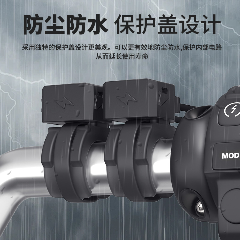 【3】一件式保护盖 - 摩托车 USB 充电器采用独特的保护盖设计,更加美观、紧凑。可以更有效地防止水和灰尘进入端口,保护内部电路,从而延长使用寿命。