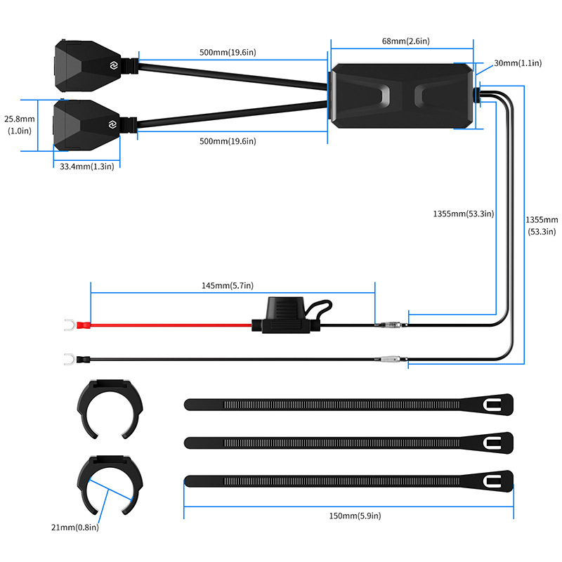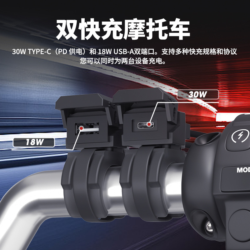 【1】双快充摩托车A+C充电器 - 升级版摩托车手机充电器配备 30W USB-C(PD 供电)和 18W USB-A双端口。支持多种快充规格和协议。您可以同时为两台设备充电。