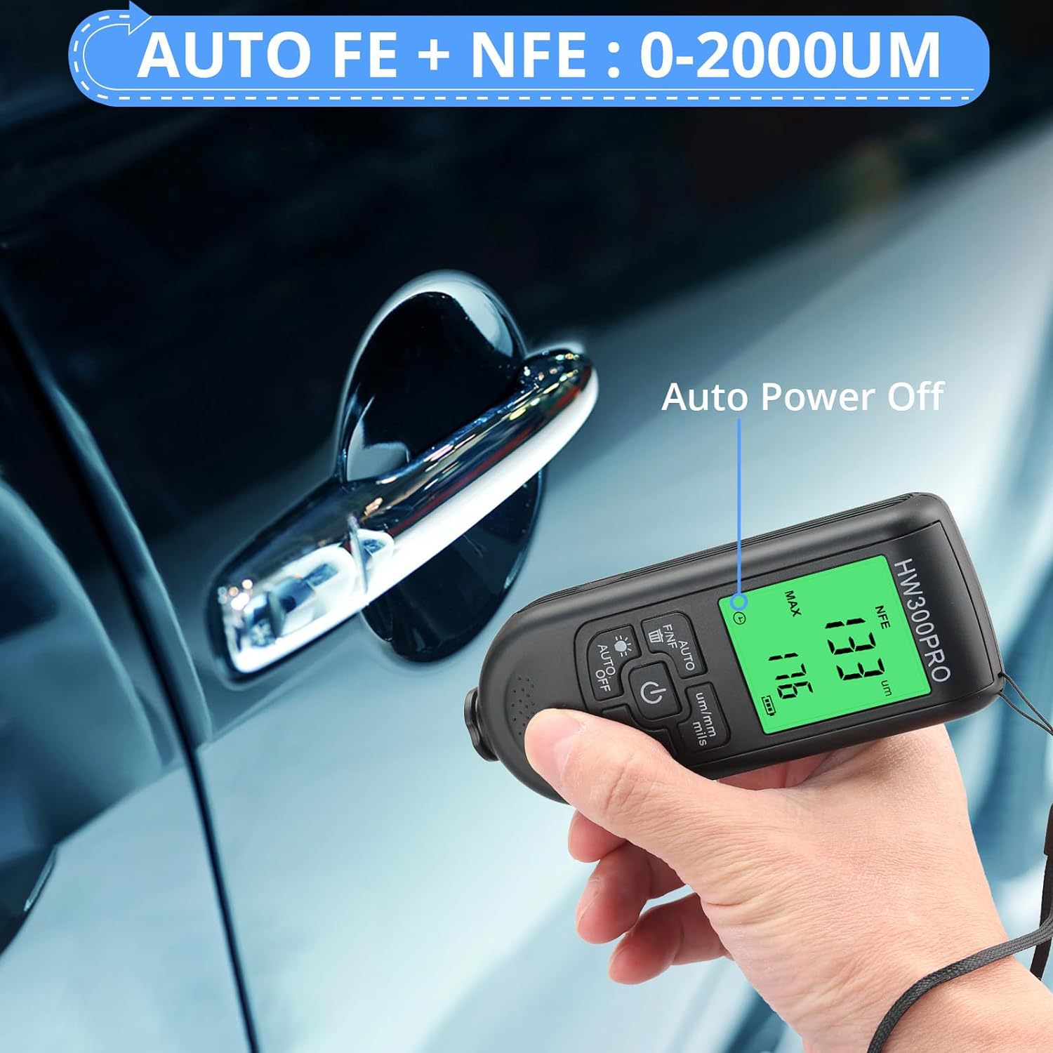 超精密分辨率1um,FE/NFE涂层测量,汽车漆0-2000um尺寸小,精度高,电池电量指示,自动关机功能用于FE/NFE(铁铝)