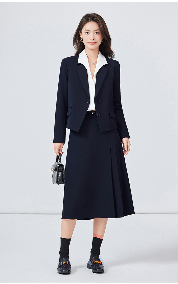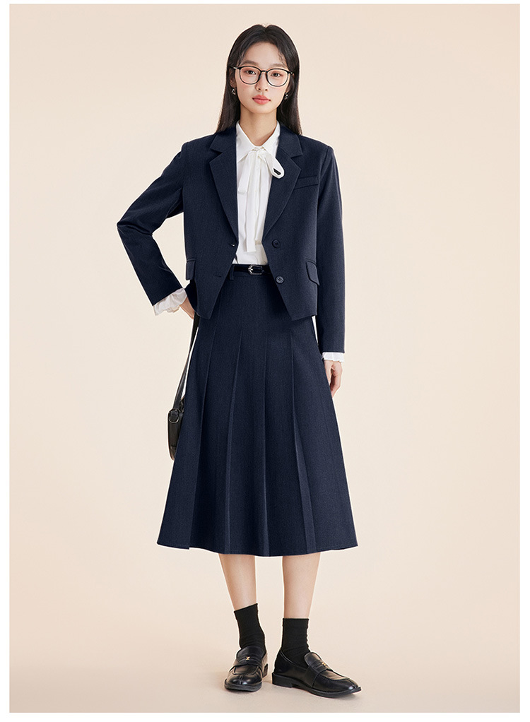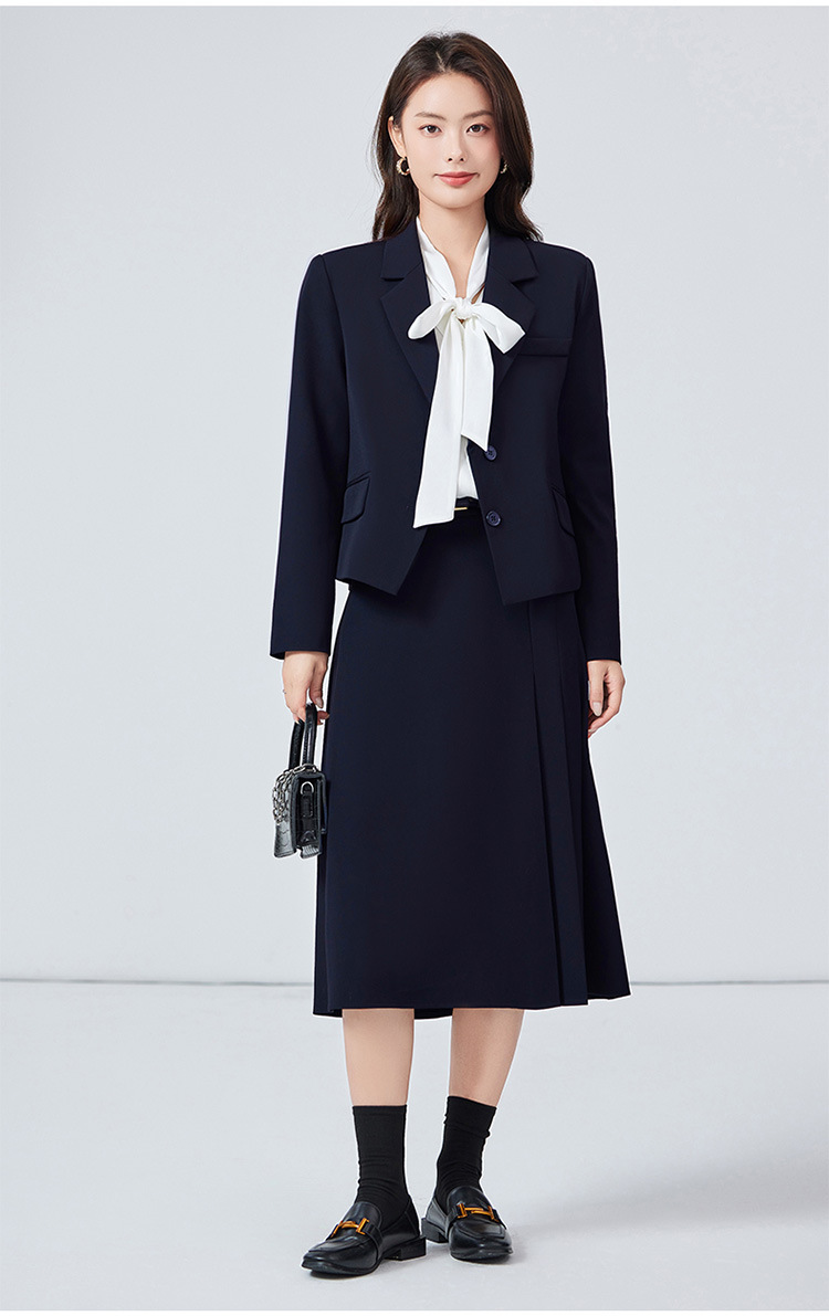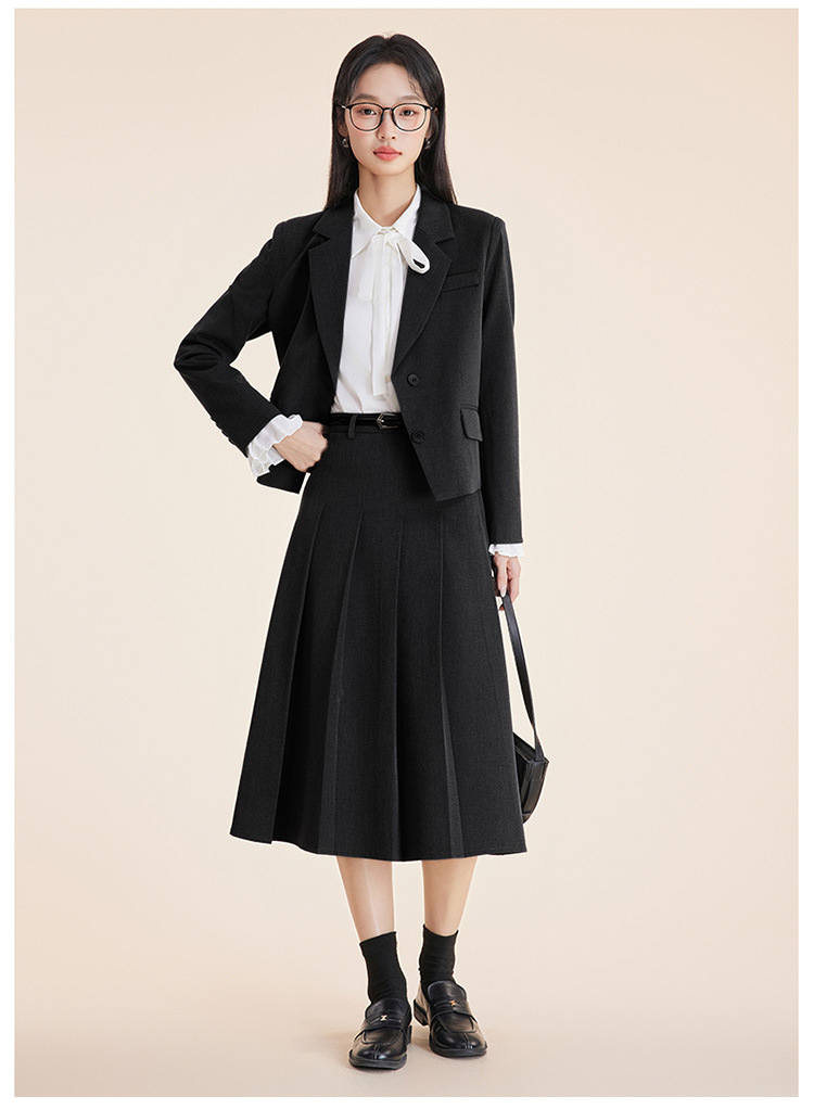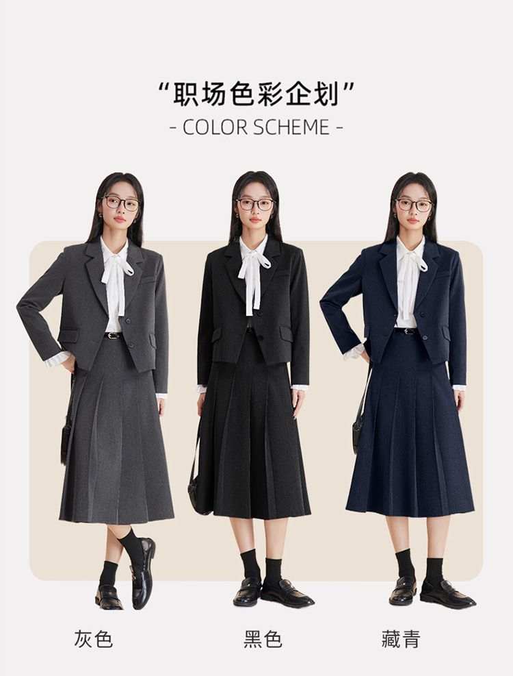 Серый костюм + юбка А-силуэта; Костюм темно-синего цвета + юбка А-силуэта; Черный костюм + юбка А-силуэта; Серый костюм + плиссированная юбка; Костюм темно-синего цвета + плиссированная юбка; Черный костюм + плиссированная юбка; белая рубашка с лацканами; Голубая рубашка с лацканами Haze; белая рубашка с бантом