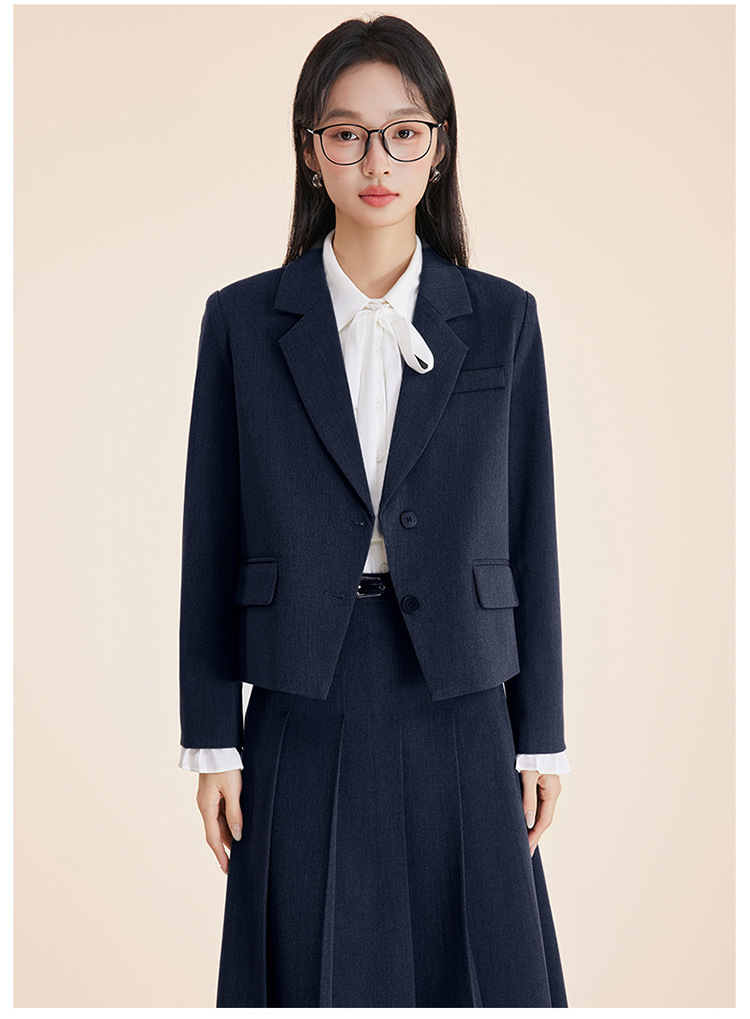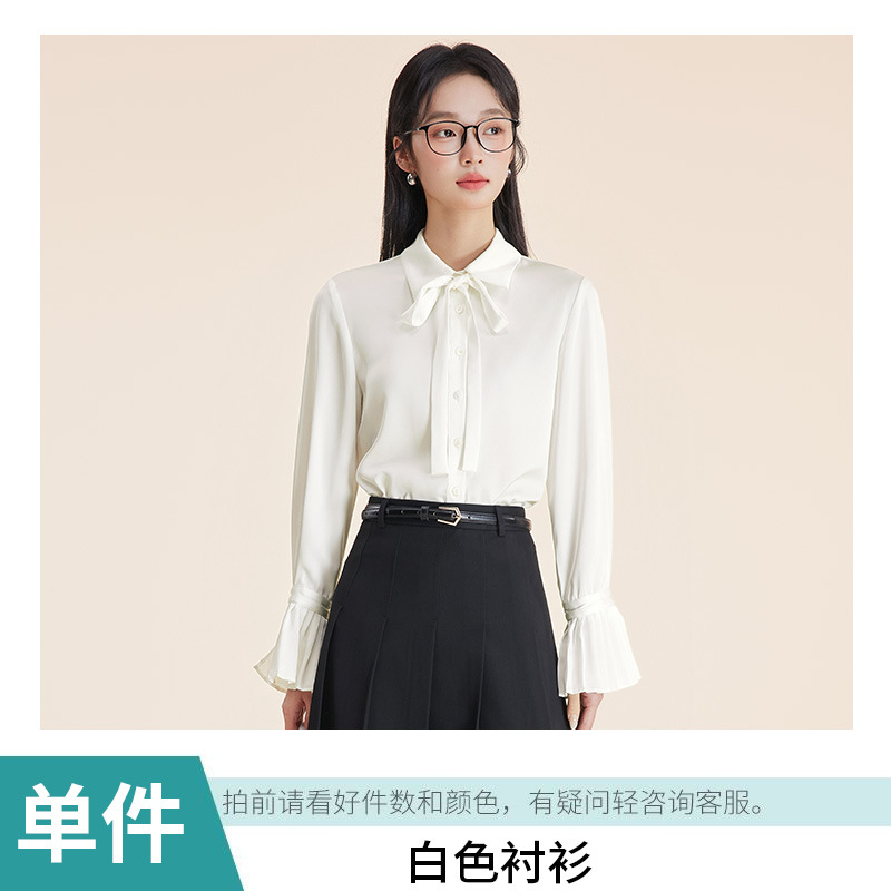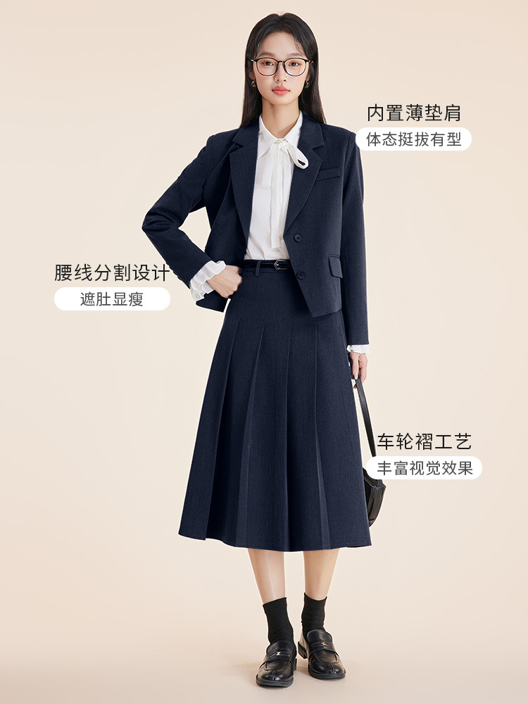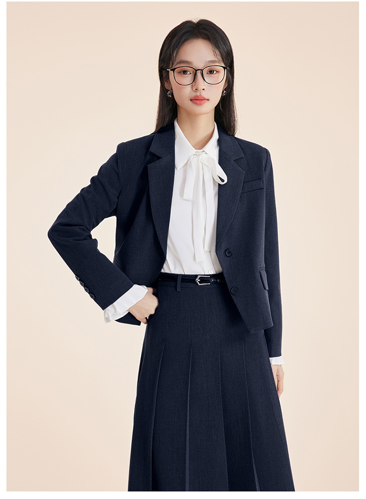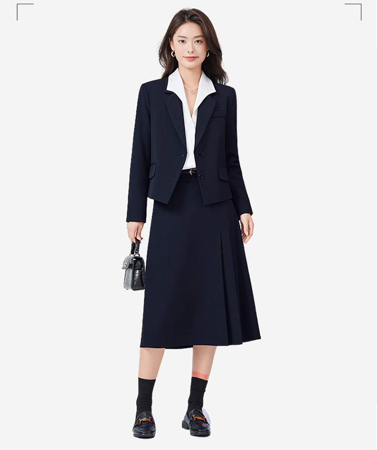 Серый костюм + юбка А-силуэта; Костюм темно-синего цвета + юбка А-силуэта; Черный костюм + юбка А-силуэта; Серый костюм + плиссированная юбка; Костюм темно-синего цвета + плиссированная юбка; Черный костюм + плиссированная юбка; белая рубашка с лацканами; Голубая рубашка с лацканами Haze; белая рубашка с бантом
