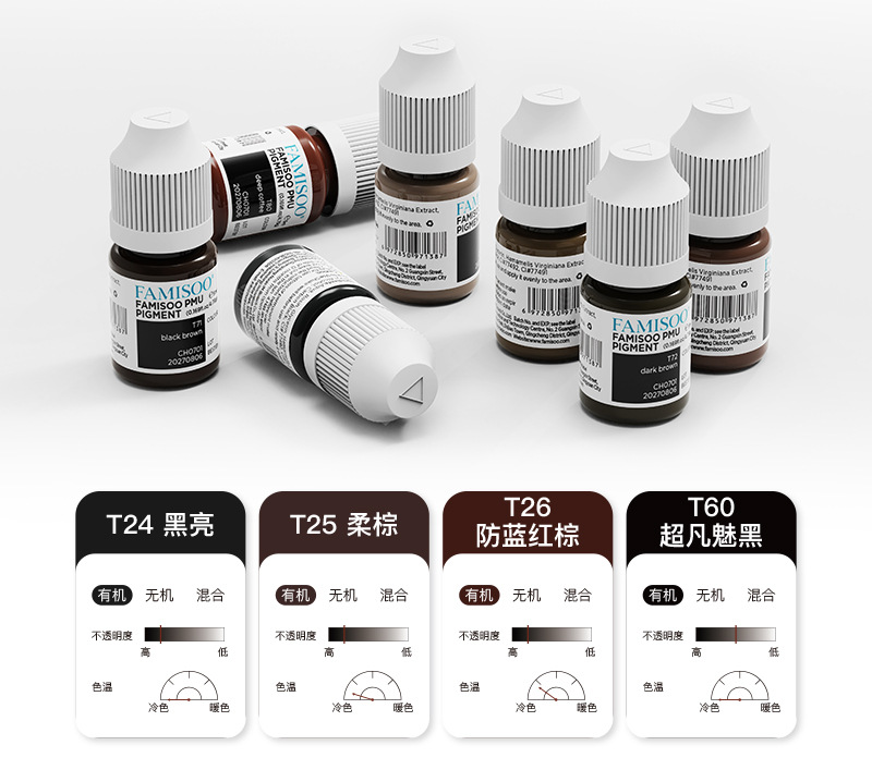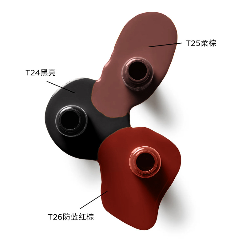 T60 Удивительный черный, самый глубокий черный; Т24 черный блестящий черный; T25 Мягкий коричневый Мягкий коричневый; T26 анти-синий-окрасничный коричневый антисиний-краденто-коричневый
