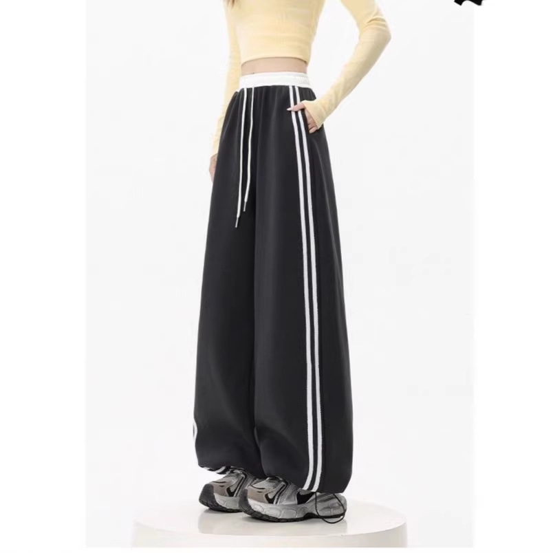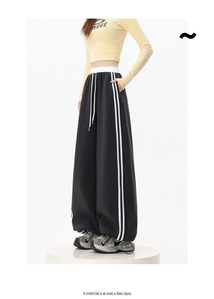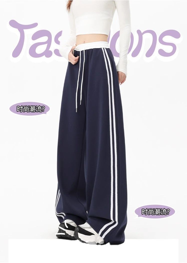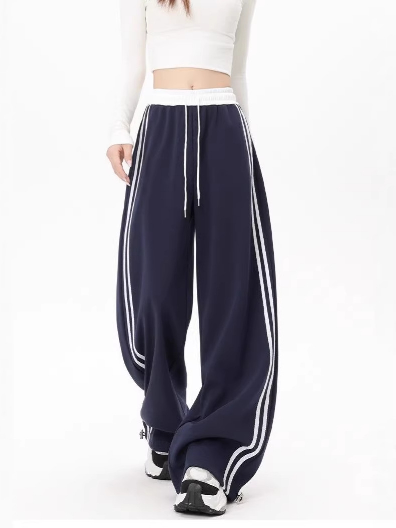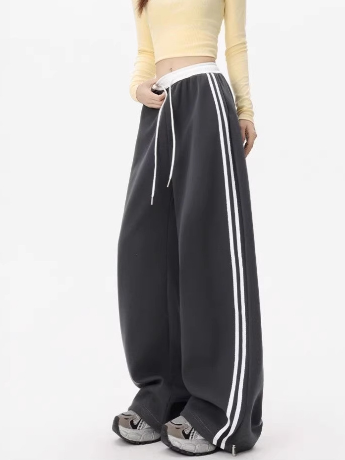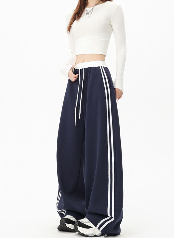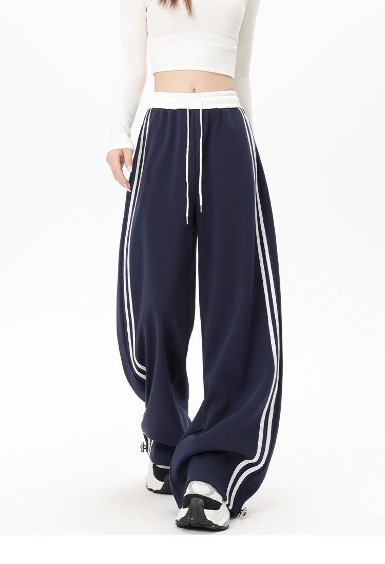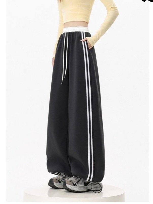 Женские весенне-осенние повседневные спортивные штаны с высокой талией и цветными блоками, свободные драпированные прямые брюки с широкими штанинами в полоску в стиле пэчворк.