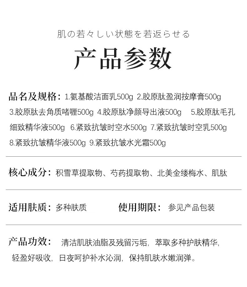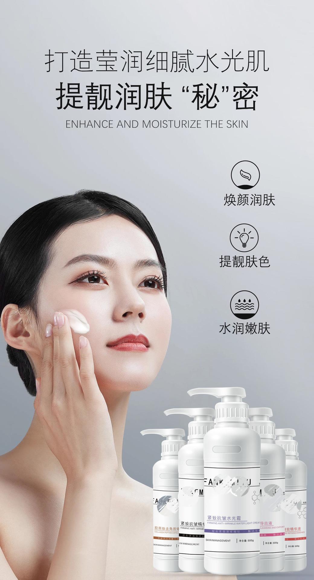 Аминокислотное очищающее молочко 500 г; Уплотнение против морщин время воды 500 г; Уплотняющий против морщин молоко 500 г; Сущность против морщин 500 г; Уплотнение против морщин воды Свет крем 500 г; Коллаген Пептид Инрум Массажный крем 500 г; Коллаген Отшелушивающий гель 500 г; Выход коллагеновой пептидной жидкости 500 г; Коллагеновая пептидная мелкая сущность для пор 500 г