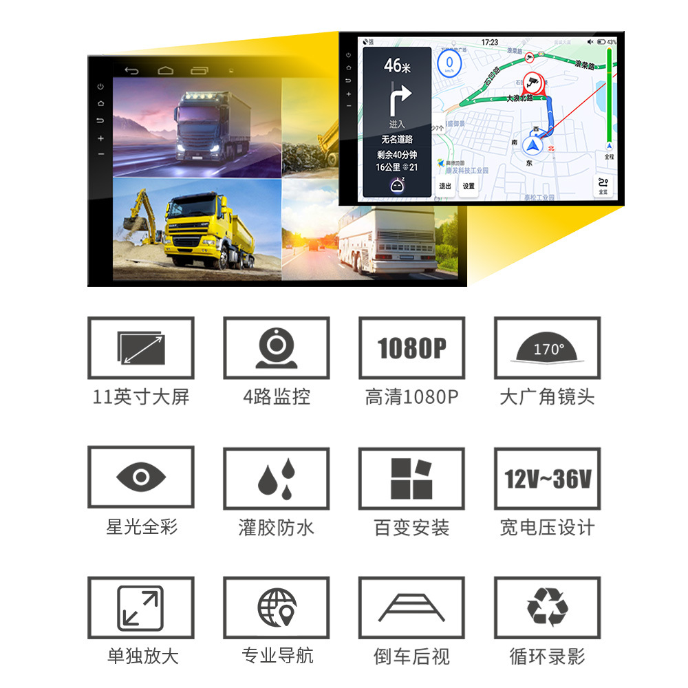核心优势:将传统大屏车机(导航、多媒体)与四路监控系统整合,节省车内设备空间,降低安装复杂度