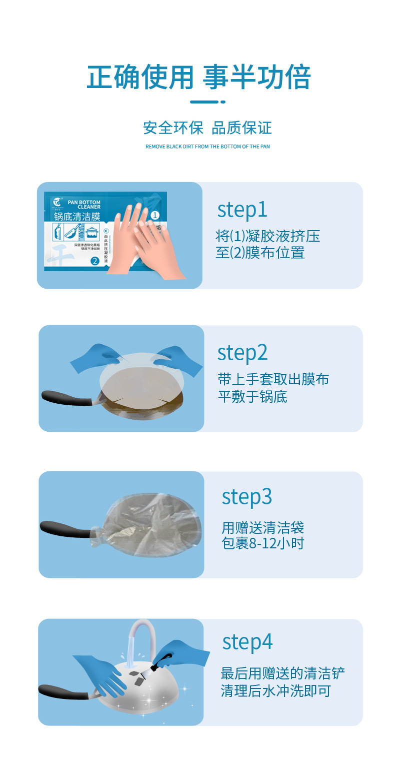 Чистящая пленка для дна кастрюли с черной накипью, пакетик 120 г.; лопата; Пара перчаток; Кусок полиэтиленовой пленки
